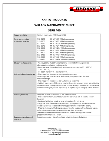 KARTA PRODUKTU WKŁADY NAPRAWCZE M-RCF SERII 400 Nazwa produktu Wkłady naprawcze M-RCF, serii 400 Dostępne rozmiary z numerami produktu 512-3100 512-3200 512-3210 512-3240 512-3250 512-3270 512-3400 512-3410 512-3420 512-3430 Obszary zastosowania - W przypadku długotrwałej naprawy opon radialnych, zgodnie z obowiązującym tabelą zastosowania - Przeznaczone do wulkanizacji w temperaturze między 95 - 160 ° C (203 - 320 ° F) - do opon dętkowych i bezdętkowych - Nie mogą być stosowane do opon diagonalnych - Nie mogą być stosowane w wulkanizacji na gorąco bez docisku mechanicznego - Nie mogą być stosowane do wulkanizacji na zimno - Wkłady naprawcze RCF nie są zatwierdzone do naprawy opon jednośladów - Należy ocenić maksymalny stopień uszkodzenia po obrobieniu uszkodzenia i dobrać wymagany wkład naprawczy RCF przy użyciu bieżącej tabeli doboru Instrukcje bezpieczeństwa Instrukcje obsługi Czas oczekiwania przed użyciem M-RCF 410 Wkład naprawczy M-RCF 420 Wkład naprawczy M-RCF 420+ Wkład naprawczy M-RCF 424 Wkład naprawczy M-RCF 425+ Wkład naprawczy M-RCF 426 Wkład naprawczy M-RCF 440 Wkład naprawczy M-RCF 440+ Wkład naprawczy M-RCF 442 Wkład naprawczy M-RCF 442+ Wkład naprawczy - Klejone powierzchnie muszą być zawsze czyste - Nie należy instalować wkładu w strefie barkowej lub w środku ściany bocznej - Podgrzać wkład na płycie grzewczej w ciągu 7 - 10 minut - Zdjąć ok. 25% folii ochronnej z wkładu, począwszy od środka i umieścić wkład naprawczy na oszorstkowanej powierzchni wewnątrz opony - Mocno docisnąć wkład naprawczy od środka na zewnątrz, stosując wąską rolkę, stopniowo usuwając pozostałą warstwę ochronną - krawędzie wkładu oraz oszorstkowaną powierzchnię posmarować preparatem Innerliner Sealer Pozostaw naprawy do całkowitego ostygnięcia przed użyciem TIP-TOPOL Sp. z o.o. ul. Kostrzyńska 33, 62-010 Pobiedziska Tel.: 61 815 22 00, [email protected] www.tiptopol.pl Temperatura wulkanizacji Między 95 - 160 ° C (203 - 320 ° F) Okres przydatności 12 miesięcy Warunki przechowywania 20 ± 5°C (68 ± 5°C) DIN 7716, przechowywać w suchym i ciemnym miejscu Zalety produktu - Brak czasu schnięcia lub czasu oczekiwania w procesie naprawy - Brak rozpuszczalników - Doskonała przyczepność do opon mimo braku płynu wulkanizacyjnego - Przeznaczone do systemów wulkanizacji na gorąco z wewnętrznym ciśnieniem mechanicznym - Szczególnie przydatne do operacji bieżnikowania, gdzie występują długie okresy pomiędzy naprawą i chłodzeniem (maksymalnie 14 dni) - Wzmocnienie wykonane ze sztucznego jedwabiu, dostosowane do właściwości dynamicznych opony - Nieprzepuszczalność gazu dopasowana do opony - Ochrona krawędzi kordu dzięki specjalnej konstrukcji - Opatentowana technologia Inny W przypadku użycia alternatywnych urządzeń grzewczych, wymagane jest badanie i zatwierdzenie przez REMA TIP TOP GmbH Produkt nie zawiera rozpuszczalników. Alternatywnie, produkty na bazie rozpuszczalników mogą być używane. Powyższe informacje są oparte na szeroko zakrojonych badaniach i zapewniają wielkości zalecane. REMA TIP TOP GmbH zastrzega sobie prawo do wprowadzania zmian, w szczególności jeżeli zapewniają one wzmocnienie techniczne i nie modyfikują znacząco produktu. Wszelkie roszczenia z tytułu rękojmi są wyłączone w przypadku nieznacznych odchyleń. TIP-TOPOL Sp. z o.o. ul. Kostrzyńska 33, 62-010 Pobiedziska Tel.: 61 815 22 00, [email protected] www.tiptopol.pl