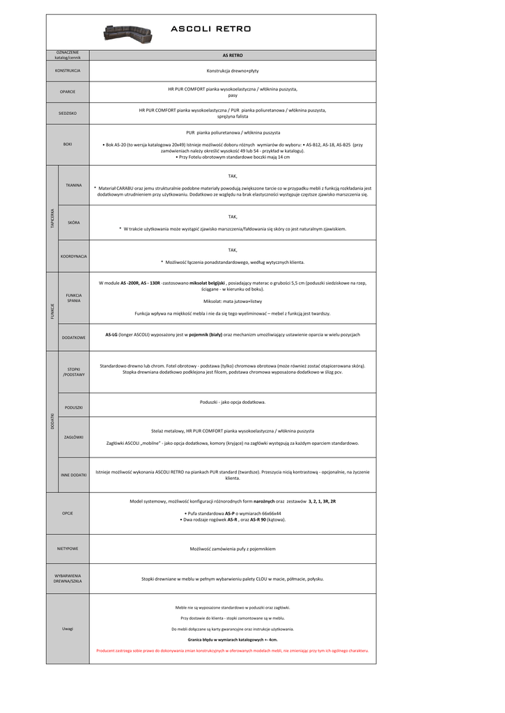 ASCOLI RETRO OZNACZENIE katalog/cennik AS RETRO KONSTRUKCJA Konstrukcja drewno+płyty OPARCIE HR PUR COMFORT pianka wysokoelastyczna / włóknina puszysta, pasy SIEDZISKO HR PUR COMFORT pianka wysokoelastyczna / PUR pianka poliuretanowa / włóknina puszysta, sprężyna falista PUR pianka poliuretanowa / włóknina puszysta BOKI • Bok AS-20 (to wersja katalogowa 20x49) Istnieje możliwość doboru różnych wymiarów do wyboru: • AS-B12, AS-18, AS-B25 (przy zamówieniach należy określić wysokość 49 lub 54 - przykład w katalogu). • Przy Fotelu obrotowym standardowe boczki mają 14 cm TAK, TAPICERKA TKANINA * Materiał CARABU oraz jemu strukturalnie podobne materiały powodują zwiększone tarcie co w przypadku mebli z funkcją rozkładania jest dodatkowym utrudnieniem przy użytkowaniu. Dodatkowo ze względu na brak elastyczności występuje częstsze zjawisko marszczenia się. TAK, SKÓRA * W trakcie użytkowania może wystąpić zjawisko marszczenia/fałdowania się skóry co jest naturalnym zjawiskiem. TAK, KOORDYNACJA * Możliwość łączenia ponadstandardowego, według wytycznych klienta. W module AS -200R, AS - 130R -zastosowano miksolat belgijski , posiadający materac o grubości 5,5 cm (poduszki siedziskowe na rzep, ściągane - w kierunku od boku). FUNKCJE FUNKCJA SPANIA Miksolat: mata jutowa+listwy Funkcja wpływa na miękkość mebla i nie da się tego wyeliminować – mebel z funkcją jest twardszy. DODATKOWE STOPKI /PODSTAWY AS-LG (longer ASCOLI) wyposażony jest w pojemnik (biały) oraz mechanizm umożliwiający ustawienie oparcia w wielu pozycjach Standardowo drewno lub chrom. Fotel obrotowy - podstawa (tylko) chromowa obrotowa (może również zostać otapicerowana skórą). Stopka drewniana dodatkowo podklejona jest filcem, podstawa chromowa wyposażona dodatkowo w ślizg pcv. Poduszki - jako opcja dodatkowa. DODATKI PODUSZKI Stelaż metalowy, HR PUR COMFORT pianka wysokoelastyczna / włóknina puszysta ZAGŁÓWKI Zagłówki ASCOLI „mobilne” - jako opcja dodatkowa, komory (kryjące) na zagłówki występują za każdym oparciem standardowo. INNE DODATKI Istnieje możliwość wykonania ASCOLI RETRO na piankach PUR standard (twardsze). Przeszycia nicią kontrastową - opcjonalnie, na życzenie klienta. Model systemowy, możliwość konfiguracji różnorodnych form narożnych oraz zestawów 3, 2, 1, 3R, 2R OPCJE • Pufa standardowa AS-P o wymiarach 66x66x44 • Dwa rodzaje rogówek AS-R , oraz AS-R 90 (kątowa). NIETYPOWE Możliwość zamówienia pufy z pojemnikiem WYBARWIENIA DREWNA/SZKŁA Stopki drewniane w meblu w pełnym wybarwieniu palety CLOU w macie, półmacie, połysku. Meble nie są wyposażone standardowo w poduszki oraz zagłówki. Przy dostawie do klienta - stopki zamontowane są w meblu. Uwagi Do mebli dołączane są karty gwarancyjne oraz instrukcje użytkowania. Granica błędu w wymiarach katalogowych +- 4cm. Producent zastrzega sobie prawo do dokonywania zmian konstrukcyjnych w oferowanych modelach mebli, nie zmieniając przy tym ich ogólnego charakteru.