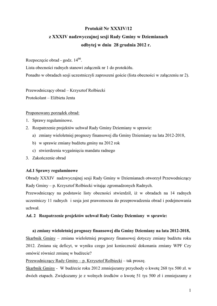 Protokół Nr XXXIV/12 z XXXIV nadzwyczajnej sesji Rady Gminy w Dziemianach odbytej w dniu 28 grudnia 2012 r. Rozpoczęcie obrad - godz. 1400. Lista obecności radnych stanowi załącznik nr 1 do protokółu. Ponadto w obradach sesji uczestniczyli zaproszeni goście (lista obecności w załączeniu nr 2). Przewodniczący obrad – Krzysztof Rolbiecki Protokolant – ElŜbieta Jenta Proponowany porządek obrad: 1. Sprawy regulaminowe. 2. Rozpatrzenie projektów uchwał Rady Gminy Dziemiany w sprawie: a) zmiany wieloletniej prognozy finansowej dla Gminy Dziemiany na lata 2012-2018, b) w sprawie zmiany budŜetu gminy na 2012 rok c) stwierdzenia wygaśnięcia mandatu radnego 3. Zakończenie obrad Ad.1 Sprawy regulaminowe Obrady XXXIV nadzwyczajnej sesji Rady Gminy w Dziemianach otworzył Przewodniczący Rady Gminy – p. Krzysztof Rolbiecki witając zgromadzonych Radnych. Przewodniczący na podstawie listy obecności stwierdził, iŜ w obradach na 14 radnych uczestniczy 11 radnych i sesja jest prawomocna do przeprowadzenia obrad i podejmowania uchwał. Ad. 2 Rozpatrzenie projektów uchwał Rady Gminy Dziemiany w sprawie: a) zmiany wieloletniej prognozy finansowej dla Gminy Dziemiany na lata 2012-2018, Skarbnik Gminy – zmiana wieloletniej prognozy finansowej dotyczy zmiany budŜetu roku 2012. Zmiana się deficyt, w wyniku czego jest konieczność dokonania zmiany WPF Czy omówić równieŜ zmianę w budŜecie? Przewodniczący Rady Gminy – p. Krzysztof Rolbiecki – tak proszę. Skarbnik Gminy - W budŜecie roku 2012 zmniejszamy przychody o kwotę 268 tys 500 zł. w dwóch etapach. Zwiększamy je z wolnych środków o kwotę 51 tys 500 zł i zmniejszamy z 1 tytułu zaciągniętych poŜyczek i kredytów na 320 tys. zł Łączne przychody wynoszą 2 mln 159 tys. 682 zł. Zmniejszamy rozchody, było zaplanowane udzielenie poŜyczki dla stowarzyszenia, która została udzielona w mniejszej kwocie, w związku z tym o kwotę 268 tys. 500 zł zmniejszamy kwotę rozchodu z tytułu udzielonych poŜyczek do wartości udzielonej. Nastąpiła zmiana deficytu, który wynosi 1 mln 285 tyś 932 zł, pokryty z wolnych środków i poŜyczek. Zwiększamy dochody o łączną kwotę 12 tys. 92 zł. Na te zmiany składają się zmiany z tytułu uzyskanych dochodów z Unii Europejskiej. Nie uzyskaliśmy dochodów z tytułu zaliczki na projekt tablice informacyjne, natomiast udało się uzyskać środki z wcześniej zrealizowanych projektów PROW, modernizacja II etapu świetlicy w Raduniu oraz zagospodarowania terenu przy jeziorze w Trzebuniu, pokrywa to niedobór z tytułu zaliczki na tablice informacyjne. Uzyskaliśmy ponadplanowe uzupełnienie subwencji ogólnej dla jednostek samorządu terytorialnego w wysokości 11 tys 627 zł i w całości przeznaczamy to na zakup urządzeń hydraulicznych dla straŜaków. Wójt Gminy – Pani Skarbnik poinformowała, iŜ nie uzyskaliśmy środków z tytułu tablic informacyjnych, co nie oznacza, Ŝe ich nie uzyskamy, tylko nie w tym roku. Jeśli chodzi o zakup sprzętu hydraulicznego dla straŜaków to zakupimy w tym roku pompę hydrauliczną oraz zestaw węŜy, które umoŜliwią prowadzenie akcji. Przewodniczący Rady Gminy – p. Krzysztof Rolbiecki – czy są pytania? Nie widzę Przewodniczący poddał pod głosowanie projekt Uchwały Nr XXXIV/ 160/12 w sprawie zmiany wieloletniej prognozy finansowej dla Gminy Dziemiany na lata 2012-2018, „Za” podjęciem uchwały głosowało 11 radnych. „Przeciw” podjęciu uchwały głosowało 0 radnych „Wstrzymało się” 0 radnych Przewodniczący stwierdził, iŜ uchwała została podjęta jednogłośnie. b) zmiany budŜetu gminy na 2012 rok Przewodniczący Rady Gminy – p. Krzysztof Rolbiecki – czy sa pytania? Nie widzę Przewodniczący Rady Gminy poddał pod głosowanie projekt Uchwały Nr XXXIV/161/12 w sprawie zmiany budŜetu gminy na 2011 rok „Za” podjęciem uchwały głosowało 11 radnych. 2 „Przeciw” podjęciu uchwały głosowało 0 radnych „Wstrzymało się” 0radnych Przewodniczący stwierdził, iŜ uchwała została jednogłośnie. c) stwierdzenia wygaśnięcia mandatu radnego Przewodniczący Rady Gminy – p. Krzysztof Rolbiecki – wojewoda przysłał nam pismo, gdzie wskazuje zmianę podstawy prawnej. Proszę Pana Mateusza o wyjaśnienia. Mateusz Hapka – kwestia przejawia się z odrębnego stanowiska naszej Pani mecenas, a wojewodą. Wszedł w Ŝycie nowy kodeks wyborczy oraz przepisy wprowadzające kodeks wyborczy, który przewiduje przepisy przejściowe w jakim czasie naleŜy stosować odpowiednie przepisy. Art. 16 wprowadzające kodeks wyborczy mówi, Ŝe do nowych i uzupełniających wyborów stosuje się przepisy dotychczasowe, czyli ordynacje wyborczą. Spór jest, bo nic nie mówi się o zasadzie wybieralności. Przewodniczący Rady Gminy – p. Krzysztof Rolbiecki – czy są pytania? Nie widzę. Przewodniczący Rady Gminy poddał pod głosowanie projekt Uchwały Nr XXXIV/162/12 w sprawie stwierdzenia wygaśnięcia mandatu radnego „Za” podjęciem uchwały głosowało 7 radnych. „Przeciw” podjęciu uchwały głosowało 2 radnych „Wstrzymało się” 2 radnych Przewodniczący stwierdził, iŜ uchwała została podjęta 7 głosami „Za”, 2 głosami „przeciw” i 2 głosami „wstrzymującymi się” Ad. 3 Zakończenie obrad Z uwagi na wyczerpanie porządku obrad o godzinie 14:11 Przewodniczący Rady Gminy zamknął obrady XXXIV nadzwyczajnej sesji Rady Gminy w Dziemianach. Protokołowała ElŜbieta Jenta Przewodniczący Rady Gminy Krzysztof Rolbiecki 3