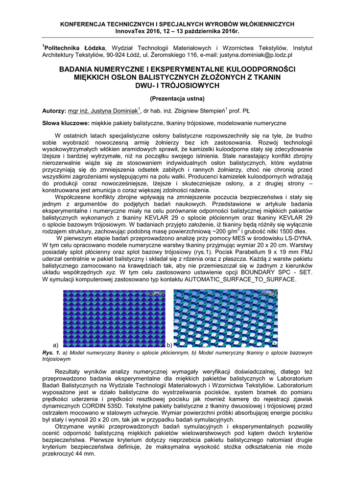 KONFERENCJA TECHNICZNYCH I SPECJALNYCH WYROBÓW WŁÓKIENNICZYCH InnovaTex 2016, 12 – 13 października 2016r. 1 Politechnika Łódzka, Wydział Technologii Materiałowych i Wzornictwa Tekstyliów, Instytut Architektury Tekstyliów, 90-924 Łódź, ul. Żeromskiego 116, e-mail: [email protected] BADANIA NUMERYCZNE I EKSPERYMENTALNE KULOODPORNOŚCI MIĘKKICH OSŁON BALISTYCZNYCH ZŁOŻONYCH Z TKANIN DWU- I TRÓJOSIOWYCH (Prezentacja ustna) 1 1 Autorzy: mgr inż. Justyna Dominiak , dr hab. inż. Zbigniew Stempień prof. PŁ Słowa kluczowe: miękkie pakiety balistyczne, tkaniny trójosiowe, modelowanie numeryczne W ostatnich latach specjalistyczne osłony balistyczne rozpowszechniły się na tyle, że trudno sobie wyobrazić nowoczesną armię żołnierzy bez ich zastosowania. Rozwój technologii wysokowytrzymałych włókien aramidowych sprawił, że kamizelki kuloodporne stały się zdecydowanie lżejsze i bardziej wytrzymałe, niż na początku swojego istnienia. Stale narastający konflikt zbrojny nierozerwalnie wiąże się ze stosowaniem indywidualnych osłon balistycznych, które wydatnie przyczyniają się do zmniejszenia odsetek zabitych i rannych żołnierzy, choć nie chronią przed wszystkimi zagrożeniami występującymi na polu walki. Producenci kamizelek kuloodpornych wdrażają do produkcji coraz nowocześniejsze, lżejsze i skuteczniejsze osłony, a z drugiej strony – konstruowana jest amunicja o coraz większej zdolności rażenia. Współczesne konflikty zbrojne wpływają na zmniejszenie poczucia bezpieczeństwa i stały się jednym z argumentów do podjętych badań naukowych. Przedstawione w artykule badania eksperymentalne i numeryczne miały na celu porównanie odporności balistycznej miękkich pakietów balistycznych wykonanych z tkaniny KEVLAR 29 o splocie płóciennym oraz tkaniny KEVLAR 29 o splocie bazowym trójosiowym. W badaniach przyjęto założenie, iż tkaniny będą różniły się wyłącznie 2 rodzajem struktury, zachowując podobną masę powierzchniową ~200 g/m i grubość nitki 1500 dtex. W pierwszym etapie badań przeprowadzono analizę przy pomocy MES w środowisku LS-DYNA. W tym celu opracowano modele numeryczne warstwy tkaniny przyjmując wymiar 20 x 20 cm. Warstwy posiadały splot płócienny oraz splot bazowy trójosiowy (rys.1). Pocisk Parabellum 9 x 19 mm FMJ uderzał centralnie w pakiet balistyczny i składał się z rdzenia oraz z płaszcza. Każdą z warstw pakietu balistycznego zamocowano na krawędziach tak, aby nie przemieszczał się w żadnym z kierunków układu współrzędnych xyz. W tym celu zastosowano ustawienie opcji BOUNDARY SPC - SET. W symulacji komputerowej zastosowano typ kontaktu AUTOMATIC_SURFACE_TO_SURFACE. a) b) Rys. 1. a) Model numeryczny tkaniny o splocie płóciennym, b) Model numeryczny tkaniny o splocie bazowym trójosiowym Rezultaty wyników analizy numerycznej wymagały weryfikacji doświadczalnej, dlatego też przeprowadzono badania eksperymentalne dla miękkich pakietów balistycznych w Laboratorium Badań Balistycznych na Wydziale Technologii Materiałowych i Wzornictwa Tekstyliów. Laboratorium wyposażone jest w działo balistyczne do wystrzeliwania pocisków, system bramek do pomiaru prędkości uderzenia i prędkości resztkowej pocisku jak również kamerę do rejestracji zjawisk dynamicznych CORDIN 535D. Tekstylne pakiety balistyczne z tkaniny dwuosiowej i trójosiowej przed ostrzałem mocowano w stalowym uchwycie. Wymiar powierzchni próbki absorbującej energie pocisku był stały i wynosił 20 x 20 cm, tak jak w przypadku badań symulacyjnych. Otrzymane wyniki przeprowadzonych badań symulacyjnych i eksperymentalnych pozwoliły ocenić odporność balistyczną miękkich pakietów wielowarstwowych pod kątem dwóch kryteriów bezpieczeństwa. Pierwsze kryterium dotyczy nieprzebicia pakietu balistycznego natomiast drugie kryterium bezpieczeństwa definiuje, że maksymalna wysokość stożka odkształcenia nie może przekroczyć 44 mm.