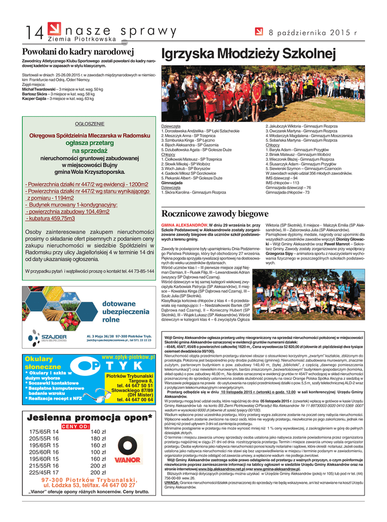14 nasze sprawy 8 października 2015 r Z i e m i a Pi o t r kow s k a Powołani do kadry narodowej Zawodnicy Atletycznego Klubu Sportowego zostali powołani do kadry narodowej kadetów w zapasach w stylu klasycznym. Igrzyska Młodzieży Szkolnej Startowali w dniach 25-26.09.2015 r. w zawodach międzynarodowych w niemieckim Frankfurcie nad Odrą. /Oder/ Niemcy. Zajęli miejsca: Michał Twardowski – 3 miejsce w kat. wag. 50 kg Bartosz Skóra – 3 miejsce w kat. wag. 58 kg Kacper Gajda – 3 miejsce w kat. wag. 63 kg OGŁOSZENIE Okręgowa Spółdzielnia Mleczarska w Radomsku ogłasza przetarg na sprzedaż nieruchomości gruntowej zabudowanej w miejscowości Bujny gmina Wola Krzysztoporska. - Powierzchnia działki nr 447/2 wg ewidencji - 1200m2 - Powierzchnia działki nr 447/2 wg stanu wynikającego z pomiaru - 1194m2 - Budynek murowany 1-kondygnacyjny: - powierzchnia zabudowy 104,49m2 - kubatura 459,75m3 Osoby zainteresowane zakupem nieruchomości prosimy o składanie ofert pisemnych z podaniem ceny zakupu nieruchomości w siedzibie Spółdzielni w Radomsku przy ulicy Jagiellońskiej 4 w terminie 14 dni od daty ukazaniasię ogłoszenia. W przypadku pytań i wątpliwości proszę o kontakt tel. 44 73-85-144 www.optyk-piotrkow.pl Okulary słoneczne * O ku la r y i sz kł a w dużym wyborze * Soczewki kontaktowe * Bezpłatne komputerowe badanie wzroku * Realizacja recept z NFZ P T Y K Piotrków Trybunalski Targowa 8, tel. 44 647 50 51 Słowackiego 87/89 (DH Mister) tel. 44 647 00 64 Jesienna p rom ocja opon* CENY OD: 175/65R 14 140 zł 205/55R 16 180 zł 195/65R 15 160 zł 205/60R 16 100 zł 195/60R 15 160 zł 200 zł 215/55R 16 225/45R 17 200 zł 9 7 - 3 0 0 Pi o t r k ó w Tr y b u n a l s k i , ul. Łódzka 53, tel/fax. 44 647 00 27 „Vianor” oferuje opony różnych koncernów. Ceny brutto. Dziewczęta 1. Dorosławska Andżelika - SP Łęki Szlacheckie 2. Meszczyk Anna - SP Trzepnica 3. Szmburska Kinga - SP Łęczno 4. Bijoch Aleksandra - SP Gazomia 5. Dziubałtowska Agata - SP Golesze Duże Chłopcy 1. Ciołkowski Mateusz - SP Trzepnica 2. Słowik Mikołaj - SP Wolbórz 3.Woch Jakub - SP Boryszów 4. Gadecki Miłosz SP Gorzkowice 5. Piekarski Albert - SP Golesze Duże Gimnazjada Dziewczęta 1. Skóra Karolina - Gimnazjum Rozprza 2. Jakubczyk Wiktoria - Gimnazjum Rozprza 3. Owczarek Martyna - Gimnazjum Rozprza 4.Włodarczyk Magdalena - Gimnazjum Moszczenica 5. Sobańska Martyna - Gimnazjum Rozprza Chłopcy 1. Baryła Adam - Gimnazjum Przygłów 2. Biniek Mateusz - Gimnazjum Wolbórz 3.Wieczorek Błażej - Gimnazjum Rozprza 4. Ślusarczyk Adam - Gimnazjum Przygłów 5. Siewierski Szymon -- Gimnazjum Czarnocin W zawodach wzięło udział 356 młodych zawodników. IMS dziewcząt – 94 IMS chłopców – 113 Gimnazjada dziewcząt – 76 Gimnazjada chłopców - 73 Rocznicowe zawody biegowe GMINA ALEKSANDRÓW. W dniu 29 września br. przy Szkole Podstawowej w Aleksandrowie zostały zorganizowane zawody biegowe dla uczniów szkół podstawowych z terenu gminy. Zawody te poświęcone były upamiętnieniu Dnia Podziemnego Państwa Polskiego, który był obchodzony 27 września. Piękna pogoda sprzyjała rywalizacji sportowej na dostosowanych do wieku uczestników dystansach. Wśród uczniów klas I – III pierwsze miejsce zajął Nejman Damian, II – Rusek Filip, III – Lewandowski Adrian (wszyscy SP Dąbrowa nad Czarną). Wśród dziewczyn w tej samej kategorii wiekowej zwyciężyła Karbowiak Patrycja (SP Aleksandrów), II miejsce – Kowalska Kinga (SP Dąbrowa nad Czarną), III – Szulc Julia (SP Skotniki). Klasyfikacja końcowa chłopców z klas 4 – 6 przedstawiała się następująco: I – Niedziałkowski Bartek (SP Dąbrowa nad Czarną), II – Konieczny Hubert (SP Skotniki), III – Wujek Łukasz (SP Aleksandrów).Wśród dziewczyn w kategorii klas 4 – 6 zwyciężyła Ogłoza Wiktoria (SP Skotniki), II miejsce - Malczyk Emilia (SP Aleksandrów), III – Zaborowska Julia (SP Aleksandrów). Pamiątkowe dyplomy, medale, nagrody oraz upominki dla wszystkich uczestników zawodów wręczyli:Dionizy Głowacki – Wójt Gminy Aleksandrów oraz Paweł Mamrot – Sekretarz Gminy. Zawody zostały zorganizowane przy współpracy Grzegorza Sipy – animatora sportu z nauczycielami wychowania fizycznego w poszczególnych szkołach podstawowych. Wójt Gminy Aleksandrów ogłasza przetarg ustny nieograniczony na sprzedaż nieruchomości położonej w miejscowości Skotniki gmina Aleksandrów oznaczonej w ewidencji gruntów numerami działek: - 454/6, 454/7, 454/8 o powierzchni całkowitej 1620 m˛. Cena wywoławcza 52 820,00 zł (słownie zł: pięćdziesiąt dwa tysiące osiemset dwadzieścia 00/100). Nieruchomość objęta przedmiotem przetargu stanowi obszar o stosunkowo korzystnym „zwartym” kształcie, zbliżonym do prostokąta. Położona jest bezpośrednio przy drodze publicznej (gminnej). Nieruchomość zabudowana murowanym, znacznie zużytym, parterowym budynkiem o pow. zabudowy 140,40 m˛ (byłej „biblioteki”, z częścią „dawnego pomieszczenia telekomunikacji”) oraz niewielkim murowanym, bardzo zniszczonym „bezwartościowym” budynkiem gospodarczym (komórka, skład opału) o pow. zabudowy 46,00 m˛. Na działce oznaczonej w ewidencji gruntów nr 454/7 wchodzącej w skład nieruchomości przeznaczonej do sprzedaży ustanowiona została służebność przesyłu na rzecz Orange Polska Spółka Akcyjna z siedzibą w Warszawie polegająca na prawie do usytuowania na części przedmiotowej działki o pow. 5,5 m˛ szafy teletechnicznej ALD-2 wraz z przyłączem telekomunikacyjnym i energetycznym. Przetarg odbędzie się w dniu 10 listopada 2015 r. (wtorek) o godz. 12.00 w sali konferencyjnej Urzędu Gminy Aleksandrów. W przetargu mogą brać udział osoby, które najpóźniej do dnia 05 listopada 2015 r. (czwartek) wpłacą w gotówce w kasie Urzędu Gminy Aleksandrów lub na konto BS Ziemi Piotrkowskiej O/Paradyż filia Aleksandrów Nr 11 89730003 0020 0410 5369 0007 wa