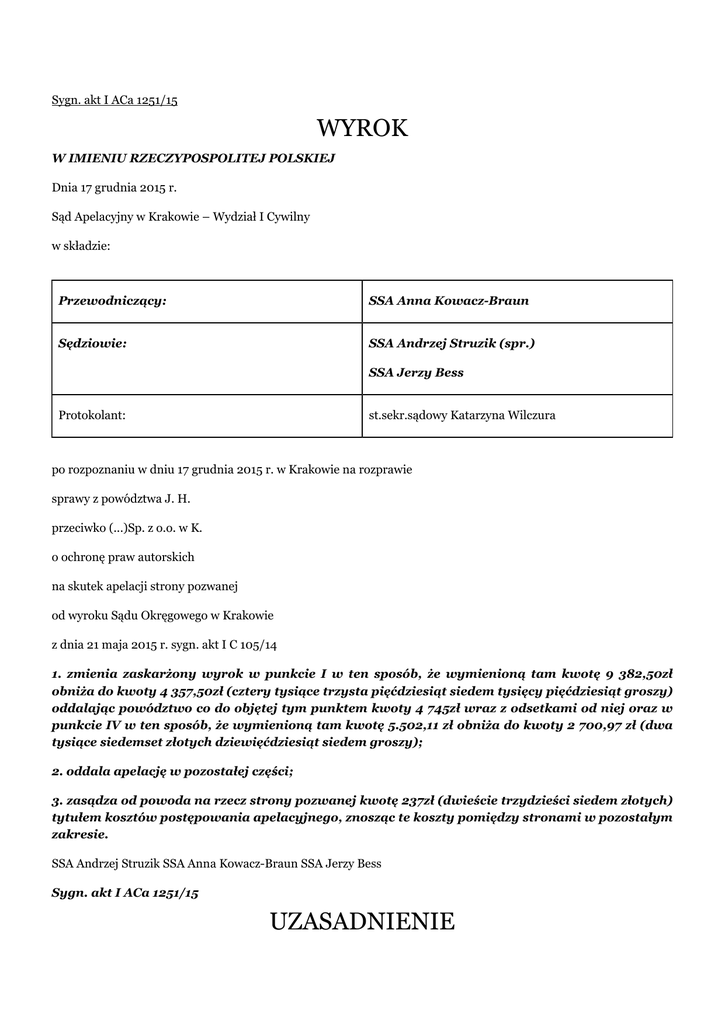 powoda J. H., a także bez wskazania jego autorstwa oraz zapłaty na jego rzecz stosownego wynagrodzenia. Zostało