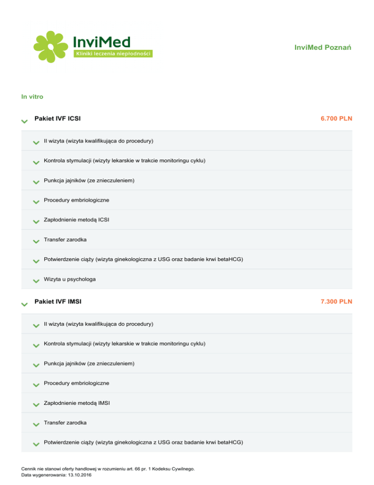 InviMed Poznań In vitro Pakiet IVF ICSI 6.700 PLN II wizyta (wizyta kwalifikująca do procedury) Kontrola stymulacji (wizyty lekarskie w trakcie monitoringu cyklu) Punkcja jajników (ze znieczuleniem) Procedury embriologiczne Zapłodnienie metodą ICSI Transfer zarodka Potwierdzenie ciąży (wizyta ginekologiczna z USG oraz badanie krwi betaHCG) Wizyta u psychologa Pakiet IVF IMSI II wizyta (wizyta kwalifikująca do procedury) Kontrola stymulacji (wizyty lekarskie w trakcie monitoringu cyklu) Punkcja jajników (ze znieczuleniem) Procedury embriologiczne Zapłodnienie metodą IMSI Transfer zarodka Potwierdzenie ciąży (wizyta ginekologiczna z USG oraz badanie krwi betaHCG) Cennik nie stanowi oferty handlowej w rozumieniu art. 66 pr. 1 Kodeksu Cywilnego. Data wygenerowania: 13.10.2016 7.300 PLN Wizyta u psychologa Diagnostyka genetyczna PGS NGS i PGD Przedimplantacyjna diagnostyka genetyczna (PGS NGS) 7.800 - 16.570 PLN 7.800 - 9.650 PLN PGS NGS (1 do 4 zarodków) 7.800 PLN PGS NGS (5 do 9 zarodków) 9.650 PLN Przedimplantacyjna diagnostyka genetyczna (PGD) 11.270 - 16.570 PLN PGD 11.270 PLN PGD 16.570 PLN Opcjonalne procedury Embryo Glue® IVF – transfer mrożonych zarodków 250 PLN 1.500 PLN Mrożenie zarodków 500 PLN Przechowywanie zamrożonych zarodków (1 rok). Cena zawiera VAT. 400 PLN Przechowywanie zamrożonych zarodków (2 lata). Cena zawiera VAT. 800 PLN Mrożenie komórek jajowych 500 PLN Przechowywanie zamrożonych komórek jajowych (do 1 roku). Cena zawiera VAT. 400 PLN Mrożenie nasienia 300 PLN Przechowywanie zamrożonego nasienia (do 1 roku). Cena zawiera VAT. 300 PLN Adopcja komórek jajowych Program Adopcji Komórek Jajowych koszty pobrania komórek jajowych od anonimowej dawczyni, m.in. koszty badań kwalifikacyjnych dawczyni, jej wizyt lekarskich i leków do stymulacji jajników Cennik nie stanowi oferty handlowej w rozumieniu art. 66 pr. 1 Kodeksu Cywilnego. Data wygenerowania: 13.10.2016 16.000 PLN witryfikacja (mrożenie) 8 komórek jajowych ogrzewanie 8 komórek jajowych zapłodnienie IVF lub ICSI transfer zarodka witryfikacja pozostałych zarodków i ich przechowywanie przez rok Badania do kwalifikacji do Programu dla Pary Leki do 1.500 PLN do 400 PLN Inseminacja Zabieg inseminacji 850 PLN Ocena cyklu do inseminacji 300 PLN Zabieg inseminacji z nasieniem dawcy 1.650 PLN Konsultacje Pierwsza wizyta związana z niepłodnością 150 PLN Kolejna wizyta niepłodnościowa 120 PLN Wizyta ginekologiczna 120 PLN Wizyta andrologiczna pierwsza 250 PLN Wizyta andrologiczna kolejna 180 PLN Wizyta urologiczna pierwsza 200 PLN Wizyta urologiczna kolejna 150 PLN Cennik nie stanowi oferty handlowej w rozumieniu art. 66 pr. 1 Kodeksu Cywilnego. Data wygenerowania: 13.10.2016 Wizyta endokrynologiczna 150 PLN Wizyta endokrynologiczna z USG 180 PLN Wizyta kobiety w ciąży 160 PLN Konsultacja - ginekologia estetyczna 120 PLN Wizyta u psychologa 120 PLN Konsultacja u dietetyka 100 PLN Konsultacja u dietetyka - edukacja żywieniowa 120 PLN Konsultacja u dietetyka - ułożenie jadłospisu 160 PLN Konsultacja kontrolna u dietetyka 70 PLN Badania laboratoryjne AMH (Anti-Müllerian Hormone) 180 PLN FSH (pobierane w 2.-3. dniu cyklu) 40 PLN Cytologia 50 PLN Kariotyp 350 PLN TSH 40 PLN LH 45 PLN Progesteron 46 PLN Prolaktyna 48 PLN Cennik nie stanowi oferty handlowej w rozumieniu art. 66 pr. 1 Kodeksu Cywilnego. Data wygenerowania: 13.10.2016 FT3 40 PLN FT4 40 PLN Estradiol 45 PLN Testosteron 45 PLN Glukoza 15 PLN HCG test 40 PLN Wirusologia (HBS AG, HCV, HIV, WR) 180 PLN Grupa krwi 40 PLN APTT 20 PLN Sód 15 PLN Potas 15 PLN Morfologia 20 PLN Toxoplazmoza IgG 50 PLN Toxoplazmoza IgM 50 PLN Rubella IgG 55 PLN Rubella IgM 55 PLN Cytomegalia IgG 50 PLN Cennik nie stanowi oferty handlowej w rozumieniu art. 66 pr. 1 Kodeksu Cywilnego. Data wygenerowania: 13.10.2016 Cytomegalia IgM 50 PLN Wymaz z kanału szyjki macicy 60 PLN Badania nasienia Badanie nasienia rozszerzone 175 PLN MSOME-6600 280 PLN SCD 270 PLN CFTR 400 PLN AZF 400 PLN Biopsja jądra USG 1.500 PLN 50 PLN Prowadzenie ciąży Oferta w promocyjnej cenie (oszczędzasz 500 zł). 9 konsultacji ginekologicznych z USG badanie przeciwciała w kierunku toxoplazmozy IgM badanie przeciwciała w kierunku toxoplazmozy IgG 2 badania VDRL badanie HCV posiew wymazu z odbytu (GBS) (1 badanie) badanie HIV posiew wymazu z pochwy (GBS) (1 badanie) Cennik nie stanowi oferty handlowej w rozumieniu art. 66 pr. 1 Kodeksu Cywilnego. Data wygenerowania: 13.10.2016 2.000 PLN badanie HBS 3 badania czystości pochwy PH 9 badań ogólnych moczu morfologia (9 badań) 3 badania glukozy na czczo we krwi żylnej badanie przeciwciała w kierunku różyczki IgM badanie przeciwciała w kierunku różyczki IgG badanie grupy krwi i RH badanie cytologiczne badanie P.ciała przeciw – CMV IgM badanie P.ciała przeciw – CMV IgG Ginekologia estetyczna MonaLisa Touch™. Rewitalizacja zewnętrznych stref intymnych wraz z konsultacją ginekologiczną 700 - 1.000 PLN MonaLisa Touch™: Rewitalizacja zewnętrznych stref intymnych wraz z konsultacją ginekologiczną 700 PLN MonaLisa Touch™: Rewitalizacja zewnętrznych stref intymnych wraz z konsultacją ginekologiczną. Pakiet dwóch zabiegów. 1.000 PLN MonaLisa Touch™: Nieinwazyjny lifting krocza po porodzie. Zabieg MonaLisa Touch ™ wraz z konsultacją ginekologiczną Zabieg MonaLisa Touch ™. Kolejny zabieg w serii. MonaLisa Touch™. Nieinwazyjny lifting krocza po porodzie. Pakiet dwóch zabiegów. MonaLisa Touch™: Rehabilitacja po porodzie wraz z konsultacją ginekologiczną MonaLisa Touch™: Rehabilitacja po porodzie. Pierwszy zabieg z konsultacją ginekologiczną Cennik nie stanowi oferty handlowej w rozumieniu art. 66 pr. 1 Kodeksu Cywilnego. Data wygenerowania: 13.10.2016 900 - 2.500 PLN 1.900 PLN 900 PLN 2.500 PLN 900 - 2.500 PLN 1.900 PLN MonaLisa Touch™: Rehabilitacja po porodzie. Kolejny zabieg. MonaLisa Touch™: Rehabilitacja po porodzie. Pakiet dwóch zabiegów. MonaLisa Touch™: Nietrzymanie moc