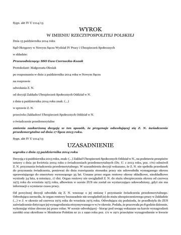Sygn. akt IV U 2114/13 WYROK W IMIENIU RZECZYPOSPOLITEJ POLSKIEJ Dnia 15 października 2014 roku Sąd Okręgowy w Nowym Sączu Wydział IV Pracy i Ubezpieczeń Społecznych w składzie: Przewodniczący: SSO Ewa Czernecka-Kozak Protokolant: Małgorzata Olesiak po rozpoznaniu w dniu 2 października 2014 roku w Nowym Sączu na rozprawie odwołania Z. N. od decyzji Zakładu Ubezpieczeń Społecznych Oddział w N. z dnia 9 października 2014 roku znak: (...) w sprawie Z. N. przeciwko Zakładowi Ubezpieczeń Społecznych Oddział w N. o świadczenie przedemerytalne zmienia zaskarżoną decyzję w ten sposób, że przyznaje odwołującej się Z. N. świadczenie przedemerytalne od dnia 17 lipca 2013 roku. Sygn. akt IV U 2114/13 UZASADNIENIE wyroku z dnia 15 października 2014 roku Decyzją z 9 października 2013 roku, znak: (...) Zakład Ubezpieczeń Społecznych Oddział w N., na podstawie przepisów ustawy z dnia 30 kwietnia 2004 roku o świadczeniach przedemerytalnych (Dz. U. z 2013 roku, poz. 170) odmówił Z. N. przyznania świadczenia przedemerytalnego. W uzasadnieniu decyzji wskazano, że Z. N. nie spełniła przesłanek do przyznania świadczenia, ponieważ do dnia rozwiązania stosunku pracy nie udowodniła wymaganego okresu uprawniającego do emerytury wynoszącego 35 lat. Uznane przez organ rentowy okresy składkowe, nieskładkowe wyniosły 34 lata, 9 miesięcy, 17 dni. Organ rentowy nie uwzględnił Z. N. do stażu ubezpieczenia okresu od czerwca 1975 roku do września 1975 roku, albowiem w ocenie ZUS nie został on wystarczająco udowodniony, gdyż nie ma informacji o wymiarze czasu pracy. Od powyższej decyzji odwołała się Z. N. wnosząc o jej zmianę i przyznanie świadczenia przedemerytalnego. Odwołująca zarzuciła, że organ rentowy bezzasadnie nie uwzględnił jej do stażu ubezpieczeniowego pracy w Zakładzie (...) w J. w okresie od czerwca 1975 roku do września 1975 roku. Odwołująca się podniosła, że przedłożyła do ZUS zaświadczenie dotyczące jej wynagrodzenia otrzymywanego w w/w okresie. Podała, że pracowała po 8 godzin dziennie, wykonując różne zlecone jej prace rolne. W ocenie odwołującej - biorąc pod uwagę wskazane na karcie wynagrodzeń zarobki oraz określone w Monitorze Polskim nr 21 z 1990 roku poz. 171 w 1971 przeciętne wynagrodzenie w kwocie 3.913,00 zł można ustalić czas jej pracy. Z. N. wniosła o przesłuchanie świadków na okoliczność wymiaru czasu pracy w w/w zakładzie. W odpowiedzi na odwołanie organ rentowy wniósł o jego oddalenie podnosząc argumentację, którą posłużył się w zaskarżonej decyzji. Nadto wskazał, że w czasie pracy w Zakładzie (...) J. odwołująca się była pracownikiem dochodzącym, zatrudnionym w okresach natężonej pracy, a dla takich pracowników nie zakładano teczek osobowych. Jedynym zachowanym dokumentem jest lista płac. ZUS wskazał, że zgodnie z rozporządzeniem Ministra Pracy i Polityki Społecznej z dnia 11 października 2011 roku w sprawie postępowania o świadczenia emerytalno – rentowe ( Dz.U., Nr 237, poz. 1412) przy uwzględnieniu do stażu okresu dorywczego zatrudnienia, przypadającego przed datą 1 stycznia 1981 roku uwzględnia się te miesiące, w których praca wykonywana była najmniej 4 godziny dziennie. Brak zaświadczenia zakładu pracy dotyczącego liczby przepracowanych godzin lub dni stanowi – w ocenie organu rentowego – podstawę do odmowy uznania wnioskowanego okresu zatrudnienia. Bezspornym w niniejszej sprawie było, że odwołująca się Z. N., ur. (...), w okresie od 1 stycznia 2001 roku do 31 marca 2012 roku była zatrudniona w Hotelu (...) w Z.. Stosunek pracy został rozwiązany z przyczyn dotyczących zakładu pracy. Od 1 czerwca 2012 roku odwołująca się jest zarejestrowana jako bezrobotna w (...) Urzędzie Pracy w Z., a od 9 czerwca 2012 roku była uprawniona do zasiłku dla bezrobotnych. Dnia 8 grudnia 2012 roku upłynął 6 - miesięczny okres pobierania zasiłku dla bezrobotnych. W okresie pobierania zasiłku odwołująca nie odmówiła bez uzasadnionej przyczyny przyjęcia propozycji zatrudnienia. Zaświadczenie stwierdzające wskazane okoliczności zostało wystawione 17 czerwca 2013 roku. Dnia 16 lipca 2013 roku Z. N. złożyła wniosek o przyznanie świadczenia przedemerytalnego, przedkładając w/w zaświadczenie (...) Urzędu Pracy w Z.. Do dnia rozwiązania stosunku pracy organ rentowy uwzględnił odwołującej się 34 lata, 9 miesięcy i 17 dni okresów składkowych i nieskładkowych: od 25 sierpnia 1976 roku do 24 sierpnia 1979 roku, od 18 czerwca 1980 roku do 20 kwietnia 1983 roku, od 21 kwietnia 1983 roku do 31 grudnia 2000 roku, od 1 stycznia 2001 roku do 31 marca 2012 roku. Sąd ustalił następujący stan faktyczny: W okresie od czerwca 1975 roku do września 1975 roku Z. N. pracowała w Zakładzie (...) w J. jako pracownik stały, dochodzący. Przychodziła do pracy codziennie od poniedziałku do soboty. Pracowała od godziny 7.00 co najmniej po 8 godzin dziennie. Była pracownikiem fizycznym niewykwalifikowanym. Wykonywała głównie prace polowe przy uprawie zboża, buraków, marchwi, ziemniaków. Pracowała też w magazynie np. przy ważeniu i workowaniu zboża lub ziemniaków. W okresie pracy odwołującej się w w/w zakładzie przypadało duże natężenie prac polowych (sianokosy, żniwa, wykopki, zbiór warzyw). Z. N. była zatrudniona przy wszystkich w/w pracach. Czasami pracowała przy zwierzętach hodowlanych np. przy wynoszeniu obornika. Wynagrodzenie odwołującej się było ustalane od efektów jej pracy, tj. np. od ilości zebranych produktów albo powierzchni gruntu, na którym wykonała pracę w danym dniu. Ilość wykonanej pracy sprawdzał brygadzista. W dniach, w których nie było możliwości ustalenia wynagrodzenia akordowego - wynagrodzenie wypłacane było w wysokości 40 zł za dniówkę roboczą. W czerwcu 1975 roku wynagrodzenie odwołującej się wyniosło 1528 zł, w lipcu 906 zł, w sierpniu 102