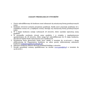 ZASADY PRESELEKCJI UTWORÓW 1. Utwór zakwalifikowany do konkursu musi odznaczać się artystyczną formą przekazywanych treści. 2. Każdemu utworowi zostanie przypisana punktacja. Każdy juror przyznaje punktację od 1 (najsłabsza ocena) do 5 (najlepsza ocena), kierując się artystyczną formą przekazywanych treści. 3. W I etapie konkursu zostaje wybranych 18 utworów, które uzyskały najwyższą sumę punktów. 4. W przypadku uzyskania równej sumy punktów i w związku z regulaminowym ograniczeniem do 18 utworów, które mogą być zakwalifikowane do II etapu konkursu, decydować będzie liczba najwyższych ocen cząstkowych. 5. Wypełnioną kartę głosowania każdy juror odeśle w terminie do 12.06.2016 r. drogą elektroniczną do Organizatora konkursu na adres poczty elektronicznej sekretarza konkursu ([email protected]). 6. Sekretarz konkursu dokona zliczenia punktacji każdego z utworów. 7. Wyniki preselekcji zostaną opublikowane na stronie www.grandpik.pl w terminie do 15.06.2016 r.