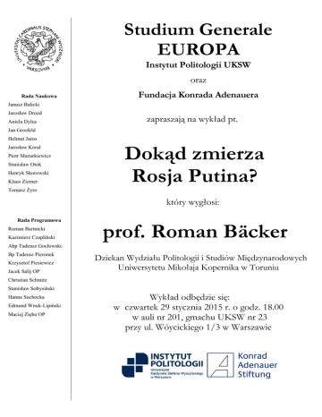 Studium Generale EUROPA Instytut Politologii UKSW oraz Rada Naukowa Fundacja Konrada Adenauera Janusz Balicki Jarosław Drozd Aniela Dylus zapraszają na wykład pt. Jan Grosfeld Helmut Juros Jarosław Koral Piotr Mazurkiewicz Stanisław Otok Henryk Skorowski Klaus Ziemer Dokąd zmierza Rosja Putina? Tomasz Żyro który wygłosi: Rada Programowa Roman Bartnicki Kazimierz Czapliński prof. Roman Bäcker Abp Tadeusz Gocłowski Bp Tadeusz Pieronek Krzysztof Piesiewicz Jacek Salij OP Dziekan Wydziału Politologii i Studiów Międzynarodowych Uniwersytetu Mikołaja Kopernika w Toruniu Christian Schmitz Stanisław Sołtysiński Hanna Suchocka Edmund Wnuk-Lipiński Maciej Zięba OP Wykład odbędzie się: w czwartek 29 stycznia 2015 r. o godz. 18.00 w auli nr 201, gmachu UKSW nr 23 przy ul. Wóycickiego 1/3 w Warszawie