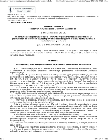Szczegółowy tryb i warunki przeprowadzania czynności w przewodach... 1 z 13 http://lex.law.uni.torun.pl/lex/content.rpc?reqId=1405682248425_156... Wydruk z 2014.07.18 Dz.U.2011.204.1200 - Szczegółowy tryb i warunki przeprowadzania czynności w przewodach doktorskich, w postępowaniu habilitacyjnym oraz w postępowaniu o nadanie tytułu profesora. Wersja 2011.10.01 do ... Dz.U.2011.204.1200 ROZPORZĄDZENIE MINISTRA NAUKI I SZKOLNICTWA WYŻSZEGO1) z dnia 22 września 2011 r. w sprawie szczegółowego trybu i warunków przeprowadzania czynności w przewodach doktorskich, w postępowaniu habilitacyjnym oraz w postępowaniu o nadanie tytułu profesora (Dz. U. z dnia 28 września 2011 r.) Na podstawie art. 31 ustawy z dnia 14 marca 2003 r. o stopniach naukowych i tytule naukowym oraz o stopniach i tytule w zakresie sztuki (Dz. U. Nr 65, poz. 595, z późn. zm.2)) zarządza się, co następuje: Rozdział 1 Szczegółowy tryb przeprowadzania czynności w przewodach doktorskich § 1. 1. Osoba ubiegająca się o nadanie stopnia doktora, zwana dalej "kandydatem", wraz z wnioskiem o wszczęcie przewodu doktorskiego przedstawia kierownikowi jednostki organizacyjnej: 1) oryginał albo poświadczoną przez jednostkę organizacyjną przeprowadzającą przewód doktorski kopię dokumentu stwierdzającego posiadanie tytułu zawodowego, o którym mowa w art. 12 ust. 1 pkt 1 ustawy z dnia 14 marca 2003 r. o stopniach naukowych i tytule naukowym oraz o stopniach i tytule w zakresie sztuki, zwanej dalej "ustawą", lub dyplomu, o którym mowa w art. 191a ust. 3 i 4 ustawy z dnia 27 lipca 2005 r. - Prawo o szkolnictwie wyższym (Dz. U. Nr 164, poz. 1365, z późn. zm.3)); 2) proponowany temat i koncepcję rozprawy doktorskiej, ze wskazaniem obszaru wiedzy, dziedziny i dyscypliny naukowej, w zakresie której ma być otwarty przewód doktorski, propozycję osoby promotora oraz dyscypliny dodatkowej; 3) wykaz prac naukowych, twórczych prac zawodowych albo dorobku artystycznego wraz z odpowiednim zapisem dzieł artystycznych i dokumentacją ich publicznej prezentacji oraz informację o działalności popularyzującej naukę; 4) informację o przebiegu przewodu doktorskiego, jeżeli kandydat ubiegał się uprzednio o nadanie stopnia doktora w tej samej dyscyplinie. 2. W przypadku, o którym mowa w art. 13a ust. 1 ustawy, kandydat przedstawia oryginał albo poświadczoną przez jednostkę organizacyjną przeprowadzającą przewód doktorski kopię dokumentu stwierdzającego posiadanie tytułu zawodowego licencjata, inżyniera albo równorzędnego oraz dokumentu potwierdzającego uzyskanie "Diamentowego Grantu" w ramach programu ustanowionego przez ministra właściwego do spraw nauki. 3. Kandydat może wraz z wnioskiem o wszczęcie przewodu doktorskiego przedstawić: 1) certyfikat potwierdzający znajomość nowożytnego języka obcego; wykaz certyfikatów potwierdzających znajomość nowożytnego języka obcego stanowi załącznik nr 1 do rozporządzenia; 2) wniosek o wyrażenie zgody na przedstawienie rozprawy doktorskiej w innym języku niż język polski. 4. W przypadku wspólnego przeprowadzania przewodu doktorskiego, o którym mowa w art. 14a ust. 1 ustawy, dokumenty wymienione w ust. 1-3 kandydat przedstawia kierownikowi jednostki organizacyjnej wskazanej w porozumieniu. 2014-07-18 12:18 Szczegółowy tryb i warunki przeprowadzania czynności w przewodach... 2 z 13 http://lex.law.uni.torun.pl/lex/content.rpc?reqId=1405682248425_156... § 2. 1. Po wszczęciu przewodu doktorskiego rada jednostki organizacyjnej wyznacza promotora, w celu sprawowania opieki naukowej nad kandydatem. 2. Rada jednostki organizacyjnej określa maksymalną liczbę kandydatów, nad którymi może sprawować opiekę naukową promotor lub promotor pomocniczy. § 3. 1. Rada jednostki organizacyjnej: 1) powołuje komisje przeprowadzające egzaminy doktorskie w zakresie: a) dyscypliny podstawowej odpowiadającej tematowi rozprawy doktorskiej - w składzie co najmniej czterech osób posiadających tytuł profesora lub stopień doktora habilitowanego w zakresie tej dyscypliny naukowej lub artystycznej albo osób, które nabyły uprawnienia równoważne z uprawnieniami doktora habilitowanego, na podstawie art. 21a ustawy, albo osób posiadających kwalifikacje II stopnia w zakresie sztuki i dyscypliny artystycznej, w tym promotora albo promotora i kopromotora, b) dyscypliny dodatkowej - w składzie co najmniej trzech osób, z których co najmniej jedna posiada tytuł profesora lub stopień doktora habilitowanego w zakresie tej dyscypliny naukowej lub artystycznej albo uprawnienia równoważne z uprawnieniami doktora habilitowanego, na podstawie art. 21a ustawy, w zakresie tej dyscypliny naukowej lub artystycznej, albo osób posiadających kwalifikacje II stopnia w zakresie sztuki i dyscypliny artystycznej, c) nowożytnego języka obcego - w składzie co najmniej trzech osób, z których co najmniej jedna naucza tego języka w szkole wyższej; 2) może powołać komisję do przyjęcia rozprawy doktorskiej i przeprowadzenia obrony rozprawy doktorskiej, o której mowa w art. 14 ust. 5 ustawy, zwaną dalej "komisją doktorską", spośród członków rady posiadających tytuł profesora lub stopień doktora habilitowanego w zakresie dyscypliny podstawowej odpowiadającej tematowi rozprawy doktorskiej albo pokrewnej dyscypliny naukowej lub artystycznej albo osób, które nabyły uprawnienia równoważne z uprawnieniami doktora habilitowanego, na podstawie art. 21a ustawy, albo osób posiadających kwalifikacje II stopnia w zakresie sztuki i dyscypliny artystycznej; w skład komisji doktorskiej, liczącej co najmniej siedem osób, wchodzą ponadto recenzenci rozprawy doktorskiej oraz promotor albo promotor i kopromotor. 2. W skład komisji przeprowadzających egzaminy doktorskie i komisji doktorskiej rada jednostki organizacyjnej może powołać promotora pomocniczego bez prawa głosu. § 4. 1. Egzaminy doktorskie zdaje się przed przyjęciem r