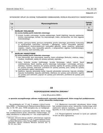 Dziennik Ustaw Nr 4 — 147 — Poz. 32 i 33 Za∏àcznik nr 5 WYSOKOÂå OP¸AT ZA OCEN¢ TO˚SAMOÂCI ODMIANOWEJ ROÂLIN ROLNICZYCH I WARZYWNYCH 33 ROZPORZÑDZENIE MINISTRA ZDROWIA1) z dnia 29 grudnia 2006 r. w sprawie szczegó∏owego zakresu medycznych czynnoÊci ratunkowych, które mogà byç podejmowane przez ratownika medycznego Na podstawie art. 11 ust. 2 ustawy z dnia 8 wrzeÊnia 2006 r. o Paƒstwowym Ratownictwie Medycznym (Dz. U. Nr 191, poz. 1410) zarzàdza si´, co nast´puje: § 1. Medyczne czynnoÊci ratunkowe, które mogà byç podejmowane przez ratownika medycznego, zosta∏y okreÊlone w za∏àczniku nr 1 do rozporzàdzenia. ——————— 1) Minister Zdrowia kieruje dzia∏em administracji rzàdowej — zdrowie, na podstawie § 1 ust. 2 rozporzàdzenia Prezesa Rady Ministrów z dnia 18 lipca 2006 r. w sprawie szczegó∏owego zakresu dzia∏ania Ministra Zdrowia (Dz. U. Nr 131, poz. 924). § 2. Medyczne czynnoÊci ratunkowe, które mogà byç podejmowane przez ratownika medycznego pod nadzorem lekarza systemu, zosta∏y okreÊlone w za∏àczniku nr 2 do rozporzàdzenia. § 3. Rozporzàdzenie wchodzi w ˝ycie po up∏ywie 14 dni od dnia og∏oszenia. Minister Zdrowia: Z. Religa Dziennik Ustaw Nr 4 — 148 — Poz. 33 Za∏àczniki do rozporzàdzenia Ministra Zdrowia z dnia 29 grudnia 2006 r. (poz. 33) Za∏àcznik nr 1 MEDYCZNE CZYNNOÂCI RATUNKOWE, KTÓRE MOGÑ BYå PODEJMOWANE PRZEZ RATOWNIKA MEDYCZNEGO 1. Ocena stanu pacjenta w celu ustalenia post´powania i decyzji o podj´ciu lub odstàpieniu od medycznych czynnoÊci ratunkowych. 2. Uk∏adanie pacjenta w pozycji w∏aÊciwej dla stanu pacjenta lub odniesionych obra˝eƒ. 3. Podj´cie i prowadzenie podstawowej i zaawansowanej resuscytacji krà˝eniowo-oddechowej u doros∏ych i dzieci wed∏ug standardów og∏oszonych w obwieszczeniu wydanym na podstawie art. 43 ustawy z dnia 8 wrzeÊnia 2006 r. o Paƒstwowym Ratownictwie Medycznym. 4. Bezprzyrzàdowe przywracanie dro˝noÊci dróg oddechowych. 5. Przyrzàdowe przywracanie i zabezpieczanie dro˝noÊci dróg oddechowych z zastosowaniem w szczególnoÊci: 1) rurki ustno-gard∏owej; 2) rurki nosowo-gard∏owej; 3) maski krtaniowej; 4) rurki krtaniowej; 5) konikopunkcji. 6. Odsysanie dróg oddechowych. 7. Podj´cie tlenoterapii biernej lub wspomagania oddechu lub wentylacji zast´pczej powietrzem lub tlenem: 1) r´cznie — z u˝yciem: a) maski twarzowej, b) zastawki jednokierunkowej i worka oddechowego; 2) mechanicznie — z u˝yciem respiratora. 8. Intubacja dotchawicza w laryngoskopii bezpoÊredniej w nag∏ym zatrzymaniu krà˝enia przez usta lub przez nos, bez u˝ycia Êrodków zwiotczajàcych oraz prowadzenie wentylacji zast´pczej. 9. Wykonanie defibrylacji r´cznej na podstawie EKG. 12. Monitorowanie czynnoÊci uk∏adu oddechowego. 13. Monitorowanie czynnoÊci uk∏adu krà˝enia metodami nieinwazyjnymi. 14. Wykonanie kaniulacji ˝y∏ obwodowych koƒczyn górnych i dolnych oraz ˝y∏y szyjnej zewn´trznej. 15. Wykonanie dojÊcia doszpikowego przy u˝yciu gotowego zestawu. 16. Podawanie leków drogà do˝ylnà, domi´Êniowà, podskórnà, dotchawiczà, doustnà, doodbytniczà i wziewnà oraz doszpikowà, przy u˝yciu gotowego zestawu. 17. Odbarczenie odmy pr´˝nej drogà nak∏ucia jamy op∏ucnowej. 18. Pobieranie krwi ˝ylnej i w∏oÊniczkowej do badaƒ laboratoryjnych. 19. Oznaczanie poziomu parametrów krytycznych z u˝yciem dost´pnego sprz´tu, w tym w szczególnoÊci: 1) poziomu glukozy w surowicy; 2) poziomu elektrolitów w surowicy; 3) badania gazometrycznego krwi w∏oÊniczkowej. 20. Opatrywanie ran. 21. Tamowanie krwotoków. 22. Unieruchamianie z∏amaƒ, zwichni´ç i skr´ceƒ. 23. Unieruchamianie kr´gos∏upa ze uwzgl´dnieniem odcinka szyjnego. szczególnym 24. Odebranie porodu nag∏ego w warunkach pozaszpitalnych. 25. Segregacja medyczna. 26. Podejmowanie dzia∏aƒ zabezpieczajàcych w celu ograniczenia skutków zdrowotnych zdarzenia. 10. Wykonanie defibrylacji zautomatyzowanej. 27. Przygotowanie pacjenta i opieka medyczna podczas transportu. 11. Wykonanie EKG. 28. Podawanie leków wymienionych w tabeli. Dziennik Ustaw Nr 4 — 149 — Poz. 33 Dziennik Ustaw Nr 4 — 150 — Poz. 33 Za∏àcznik nr 2 MEDYCZNE CZYNNOÂCI RATUNKOWE, KTÓRE MOGÑ BYå PODEJMOWANE PRZEZ RATOWNIKA MEDYCZNEGO POD NADZOREM LEKARZA SYSTEMU 1. Intubacja dotchawicza w laryngoskopii bezpoÊredniej w przypadku innym ni˝ nag∏e zatrzymanie krà˝enia z u˝yciem Êrodków zwiotczajàcych. 2. Wykonywanie kardiowersji elektrycznej i elektrostymulacji zewn´trznej. 3. Asystowanie przy drobnych zabiegach chirurgicznych (zszywanie ran, zak∏adanie drenów) i innych procedurach medycznych. 4. Cewnikowanie p´cherza moczowego. 5. Zak∏adanie sondy ˝o∏àdkowej i p∏ukanie ˝o∏àdka. 6. Podawanie na zlecenie lekarza leków innych ni˝ wymienione w za∏àczniku nr 1 do rozporzàdzenia. — 151 — — 152 — Egzemplarze bie˝àce oraz archiwalne mo˝na nabywaç: – w Wydziale Wydawnictw i Poligrafii Centrum Obs∏ugi Kancelarii Prezesa Rady Ministrów, ul. Powsiƒska 69/71, 02-903 Warszawa, tel. 0-22 694-67-00, 0-22 694-60-96 — na podstawie nades∏anego zamówienia (wy∏àcznie sprzeda˝ wysy∏kowa); – w punktach sprzeda˝y Dziennika Ustaw i Monitora Polskiego w Warszawie (sprzeda˝ wy∏àcznie za gotówk´): – ul. Powsiƒska 69/71, tel. 0-22 694-62-96 – al. Szucha 2/4, tel. 0-22 629-61-73 Reklamacje z powodu niedor´czenia poszczególnych numerów zg∏aszaç nale˝y na piÊmie do Wydzia∏u Wydawnictw i Poligrafii Centrum Obs∏ugi Kancelarii Prezesa Rady Ministrów, ul. Powsiƒska 69/71, 02-903 Warszawa, do 15 dni po otrzymaniu nast´pnego kolejnego numeru O wszelkich zmianach nazwy lub adresu prenumeratora prosimy niezw∏ocznie informowaç na piÊmie Wydzia∏ Wydawnictw i Poligrafii Centrum Obs∏ugi Kancelarii Prezesa Rady Ministrów Dziennik Ustaw i Monitor Polski (spis treÊci) dost´pne sà w Internecie pod adresem www.cokprm.gov.p