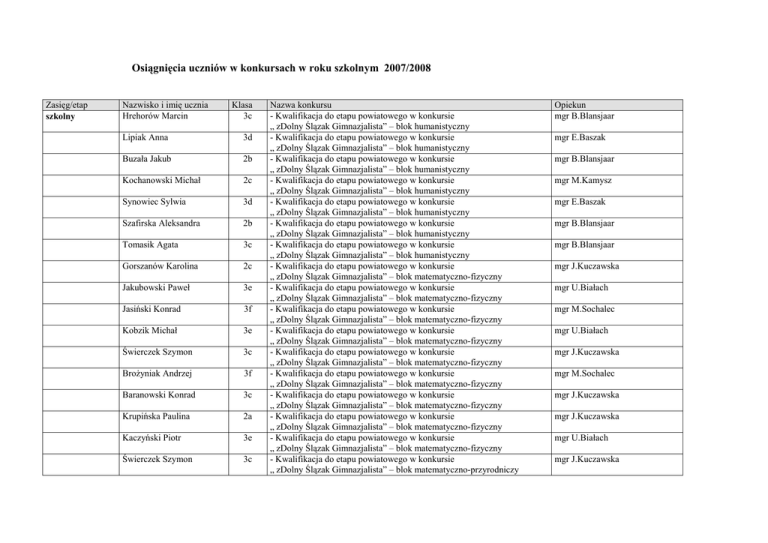 Osiągnięcia uczniów w konkursach w roku szkolnym 2007/2008 Zasięg/etap szkolny Nazwisko i imię ucznia Hrehorów Marcin Klasa 3c Lipiak Anna 3d Buzała Jakub 2b Kochanowski Michał 2c Synowiec Sylwia 3d Szafirska Aleksandra 2b Tomasik Agata 3c Gorszanów Karolina 2c Jakubowski Paweł 3e Jasiński Konrad 3f Kobzik Michał 3e Świerczek Szymon 3c BroŜyniak Andrzej 3f Baranowski Konrad 3c Krupińska Paulina 2a Kaczyński Piotr 3e Świerczek Szymon 3c Nazwa konkursu - Kwalifikacja do etapu powiatowego w konkursie „ zDolny Ślązak Gimnazjalista” – blok humanistyczny - Kwalifikacja do etapu powiatowego w konkursie „ zDolny Ślązak Gimnazjalista” – blok humanistyczny - Kwalifikacja do etapu powiatowego w konkursie „ zDolny Ślązak Gimnazjalista” – blok humanistyczny - Kwalifikacja do etapu powiatowego w konkursie „ zDolny Ślązak Gimnazjalista” – blok humanistyczny - Kwalifikacja do etapu powiatowego w konkursie „ zDolny Ślązak Gimnazjalista” – blok humanistyczny - Kwalifikacja do etapu powiatowego w konkursie „ zDolny Ślązak Gimnazjalista” – blok humanistyczny - Kwalifikacja do etapu powiatowego w konkursie „ zDolny Ślązak Gimnazjalista” – blok humanistyczny - Kwalifikacja do etapu powiatowego w konkursie „ zDolny Ślązak Gimnazjalista” – blok matematyczno-fizyczny - Kwalifikacja do etapu powiatowego w konkursie „ zDolny Ślązak Gimnazjalista” – blok matematyczno-fizyczny - Kwalifikacja do etapu powiatowego w konkursie „ zDolny Ślązak Gimnazjalista” – blok matematyczno-fizyczny - Kwalifikacja do etapu powiatowego w konkursie „ zDolny Ślązak Gimnazjalista” – blok matematyczno-fizyczny - Kwalifikacja do etapu powiatowego w konkursie „ zDolny Ślązak Gimnazjalista” – blok matematyczno-fizyczny - Kwalifikacja do etapu powiatowego w konkursie „ zDolny Ślązak Gimnazjalista” – blok matematyczno-fizyczny - Kwalifikacja do etapu powiatowego w konkursie „ zDolny Ślązak Gimnazjalista” – blok matematyczno-fizyczny - Kwalifikacja do etapu powiatowego w konkursie „ zDolny Ślązak Gimnazjalista” – blok matematyczno-fizyczny - Kwalifikacja do etapu powiatowego w konkursie „ zDolny Ślązak Gimnazjalista” – blok matematyczno-fizyczny - Kwalifikacja do etapu powiatowego w konkursie „ zDolny Ślązak Gimnazjalista” – blok matematyczno-przyrodniczy Opiekun mgr B.Blansjaar mgr E.Baszak mgr B.Blansjaar mgr M.Kamysz mgr E.Baszak mgr B.Blansjaar mgr B.Blansjaar mgr J.Kuczawska mgr U.Białach mgr M.Sochalec mgr U.Białach mgr J.Kuczawska mgr M.Sochalec mgr J.Kuczawska mgr J.Kuczawska mgr U.Białach mgr J.Kuczawska Sobala Robert 3d Biłan Klaudia 3d - Kwalifikacja do etapu powiatowego w konkursie „ zDolny Ślązak Gimnazjalista” – blok matematyczno-przyrodniczy - I miejsce w II Ogólnopolskiej Olimpiadzie Zdrowia mgr M.Sochalec Lipiak Anna 3d - I miejsce w II Ogólnopolskiej Olimpiadzie Zdrowia mgr I.RóŜyło, mgr M.Jóźwiak Leśniak Anna 3e - I miejsce w II Ogólnopolskiej Olimpiadzie Zdrowia mgr I.RóŜyło, mgr M.Jóźwiak Rak Atina 2e Hrehorów Marcin 3c Barczyk Ewa 2f Kurasiewicz Anna 2b mgr E.śemełka, mgr J.Rębisz, mgr D.Wiecheć mgr E.śemełka, mgr J.Rębisz, mgr D.Wiecheć mgr E.śemełka, mgr J.Rębisz, mgr D.Wiecheć mgr B.Blansjaar Grzybowska Katarzyna 3a Wenecka Karolina 3a Szkolna Kamila 3b Amrogowicz Aureliusz 3b Ćwieluch Maciej 1f Synowiec Laura 3d Synowiec Sylwia 3d Jezierski Rafał 3c Makowska Agnieszka 2a Kubala Anna 2a Kobzik Jakub 1e - I miejsce w Ogólnopolskim Konkursie Języka Niemieckiego etap szkolny - II miejsce w Ogólnopolskim Konkursie Języka Niemieckiego etap szkolny - III miejsce w Ogólnopolskim Konkursie Języka Niemieckiego etap szkolny - wyróŜnienie w III etapie Konkursu dziennikarskiego o tytuł „ Dziennikarza roku 2008 ” - wyróŜnienie w III etapie Konkursu dziennikarskiego o tytuł „ Dziennikarza roku 2008 ” - wyróŜnienie w III etapie Konkursu dziennikarskiego o tytuł „ Dziennikarza roku 2008 ” - wyróŜnienie w III etapie Konkursu dziennikarskiego o tytuł „ Dziennikarza roku 2008 ” - wyróŜnienie w III etapie Konkursu dziennikarskiego o tytuł „ Dziennikarza roku 2008 ” - wyróŜnienie w III etapie Konkursu dziennikarskiego o tytuł „ Dziennikarza roku 2008 ” - wyróŜnienie w III etapie Konkursu dziennikarskiego o tytuł „ Dziennikarza roku 2008 ” - wyróŜnienie w III etapie Konkursu dziennikarskiego o tytuł „ Dziennikarza roku 2008 ” - wyróŜnienie w III etapie Konkursu dziennikarskiego o tytuł „ Dziennikarza roku 2008 ” - wyróŜnienie w III etapie Konkursu dziennikarskiego o tytuł „ Dziennikarza roku 2008 ” - wyróŜnienie w III etapie Konkursu dziennikarskiego o tytuł „ Dziennikarza roku 2008 ” - I miejsce w Konkursie Wiedzy o Bolesławie Chrobrym Bednarz Paweł 1e - I miejsce w Konkursie Wiedzy o Bolesławie Chrobrym mgr I.RóŜyło, mgr M.Jóźwiak mgr W.Kościukiewicz mgr W.Kościukiewicz mgr W.Kościukiewicz mgr W.Kościukiewicz mgr A.Kufel mgr E.Baszak mgr E.Baszak mgr B.Blansjaar mgr B.Blansjaar mgr B.Blansjaar mgr U.Zubrzycka mgr K.Sikorska mgr U.Zubrzycka mgr K.Sikorska Bohonos Joanna 1b - II miejsce w Konkursie Wiedzy o Bolesławie Chrobrym Zubel Damian 1b - II miejsce w Konkursie Wiedzy o Bolesławie Chrobrym Nowakowski Michał 1d - III miejsce w Konkursie Wiedzy o Bolesławie Chrobrym Nowak Mateusz 1d - III miejsce w Konkursie Wiedzy o Bolesławie Chrobrym Pfloegel Malwina Wrzosek Marta Lipiak Anna Hućko Paweł Biłan Klaudia Leśniak Anna Wróblewska Agata Synowiec Sylwia Pytko Aneta Olejarz Dominik Cieślukowski Pablo Zubel Damian Krupińska Paulina Mikołajczyk Wojciech Danielski Daniel Kochanowski Michał Wcisło Natalia Lewińska Justyna 3a 2e 3d 3d 3d 3e 3d 3d 3b 3d 3d 1b 2a 1c 1d 2e 2c 3d Siwiec Kamil 3c Lipiak Anna 3d Lichocka Martyna 1b Zajfert karolina 1f Aleksandrowicz Ewa 1b Hućko Paweł 3d - I miejsce w konkursie „ Znani ludzie z naszego regionu” - 