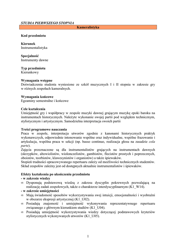 STUDIA PIERWSZEGO STOPNIA Kameralistyka Kod przedmiotu Kierunek Instrumentalistyka Specjalność Instrumenty dawne Typ przedmiotu Kierunkowy Wymagania wstępne Doświadczenia studenta wyniesione ze szkół muzycznych I i II stopnia w zakresie gry w różnych zespołach kameralnych. Wymagania końcowe Egzaminy semestralne i końcowe Cele kształcenia Umiejętność gry i współpracy w zespole muzyki dawnej grającym muzykę epoki baroku na instrumentach historycznych. Należyte wykonanie swojej partii pod względem technicznym, stylistycznym i artystycznym. Samodzielna interpretacja swoich partii Treści programowe nauczania Praca w zespole, interpretacja utworów zgodnie z kanonami historycznych praktyk wykonawczych, odpowiednie intonowanie wspólne oraz indywidualne, wspólne frazowanie i artykulacja, wspólna praca w sekcji (np. basso continuo, realizacja głosu na zasadzie cola parte). Zajęcia przeznaczone są dla instrumentalistów grających na instrumentach dawnych (skrzypków, altowiolistów, wiolonczelistów, gambistów, flecistów prostych i poprzecznych, oboistów, teorbistów, klawesynistów i organistów) a także śpiewaków. Stopień trudności opracowywanego repertuaru zależy od możliwości technicznych studentów. Skład zespołów zależny jest od dostępnych aktualnie instrumentalistów i śpiewaków. Efekty kształcenia po ukończeniu przedmiotu - w zakresie wiedzy • Dysponują podstawową wiedzą z zakresu dyscyplin pokrewnych pozwalającą na realizację zadań zespołowych, także o charakterze interdyscyplinarnym (K1_W14). - w zakresie umiejętności • Mają świadomość sposobów wykorzystywania swej intuicji, emocjonalności i wyobraźni w obszarze ekspresji artystycznej (K1_U02). • Posiadają znajomość i umiejętność wykonywania reprezentatywnego repertuaru związanego z głównym kierunkiem studiów (K1_U04). • Posiadają umiejętność wykorzystywania wiedzy dotyczącej podstawowych kryteriów stylistycznych wykonywanych utworów (K1_U05). 1 • Są przygotowani do współpracy z innymi muzykami w różnego typu zespołach oraz w ramach innych wspólnych prac i projektów, także o charakterze multidyscyplinarnym (K1_U07). • Posiadają umiejętność współpracy z solistą w różnych formacjach zespołowych. Samodzielna interpretacja swoich partii zgodna z dawnymi praktykami wykonawczymi, umiejętność pracy zespołowej, częściowa lub całkowita umiejętność poprowadzenia zespołu (K1_U08). - w zakresie kompetencji społecznych • Posiadają umiejętność organizacji pracy własnej i zespołowej w ramach realizacji wspólnych zadań i projektów (K1_K03). • Posiadają umiejętność współpracy i integracji podczas realizacji zespołowych zadań projektowych oraz przy pracach organizacyjnych i artystycznych związanych z różnymi przedsięwzięciami kulturalnymi (K1_K07). Metody nauczania Wykład, zajęcia grupowe. Nakład pracy studenta potrzebny do osiągnięcia efektów uczenia się ROK SEMESTR Punkty ECTS Ilość godzin w semestrze Rodzaj zaliczenia LEGENDA I 1 II 2 III 3 4 5 6 3 3 3 3 30 30 30 30 egz egz egz egz zal – zaliczony; zs – zaliczenie ze stopniem; egz – egzamin; ed – egzamin dyplomowy Kryteria oceny Każdy semestr zespołów kameralnych muzyki dawnej kończy się egzaminem. Program egzaminu powinien składać się z dwóch form cyklicznych zróżnicowanych stylistycznie bądź okresowo o czasie trwania ok. 20 min. Repertuar programu powinien dotyczyć epoki baroku, dopuszczalne jest poszerzenie repertuaru o utwory renesansowe oraz klasycystyczne. Program należy wykonać z nut. Przy ustalaniu oceny z egzaminu komisja bierze pod uwagę następujące aspekty: - rzetelność wykonania – zgodność z zapisem nutowym, - poprawność stylistyczna, - walory artystyczne – interpretacja, - jakość i sposób kształtowania dźwięku, - całokształt pracy studentów w semestrze, - szczególne osiągnięcia zespołu - udział w audycjach, koncertach i konkursach. Literatura (piśmiennictwo) Źródła: Agriccola Martin Musica instrumentalis deudsch (Wittemberga 1529) 2 Agazzari Augusto, Del sonare sopra’l basso con tutti li Stromenti (Siena 1607); przekład polski w serii Practica Musica IV. Jak realizować basso continuo A. Szweykowska (Kraków 1997) Bianchieri Adrian , Dialogo Musicale [estratto da] L’organo suonarino (Wenecja 1611); przekład polski w serii Practica Musica IV. Jak realizować basso continuo A. Szweykowska (Kraków 1997) Bianciardi Francesco, Breve Regola per imparar’ a Sonare sopra il Basso con ogni sorte d’istrumento (Siena 1607); przekład polski w serii Practica Musica IV. Jak realizować basso continuo A. Szweykowska (Kraków 1997) Bach Carl Philipp Emanuel Versuch über die wahre Art das Clavier zu spielen (Berlin 1753) Berardi Angelo Arcani musicali (Bologna 1690) Caccini Giulio, Le nuove Musiche (Florencja 1602) Caccini Giulio, Le nuove Musiche e nuova Maniera di Scriverle (Florencja 1614) Mersenne Marin Harmonie universelle (Paryż 1636) Muffat Georg, Florilegium Primum (Augsburg 1695) Muffat Georg, Florilegium Secundum (Passau 1698) Praetorius Michael Theatrum Instrumentorum (Wolfenbüttel 1620) Praetorius Michael Syntagma Musicum – De Organographia (Wolfenbüttel 1619) Rognoni Francesco, Selva de Varii Passaggi Secondo l’uso Moderno, per cantare, et suonare con ogni sorte de Stromenti... (Mediolan 1620) Quantz Johann Joachim , Einer Anweisung die Flőte traversiere zu spielen (Berlin 1752) Teksty współczesne: Bukofzer Manfred Music in the Baroque Period. From Monteverdi to Bach, The sonata in the baroque era (Nowy Jork 1950) Dreyfus Laurence, The String instruments in the Bach’s continuo group (Harvard 1987) Harnoncourt Nikolaus, Musik als Klangrede. Wege zu einem neuen Musikverständnis (Wiedeń 1982) Harnoncourt Nikolaus, Der musikalische Dialog. Gedanken zu Monteverdi, Bach und Mozart (Wiedeń 1984) Szlagowska Danuta, Muzyka baroku (Gdańsk 1988) Tarling Judy Baroq