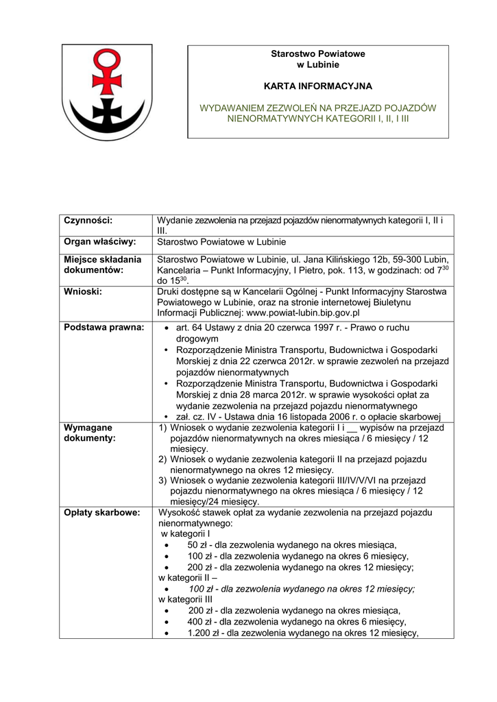 Starostwo Powiatowe w Lubinie KARTA INFORMACYJNA WYDAWANIEM ZEZWOLEŃ NA PRZEJAZD POJAZDÓW NIENORMATYWNYCH KATEGORII I, II, I III Czynności: Organ właściwy: Miejsce składania dokumentów: Wnioski: Podstawa prawna: Wymagane dokumenty: Opłaty skarbowe: Wydanie zezwolenia na przejazd pojazdów nienormatywnych kategorii I, II i III. Starostwo Powiatowe w Lubinie Starostwo Powiatowe w Lubinie, ul. Jana Kilińskiego 12b, 59-300 Lubin, Kancelaria – Punkt Informacyjny, I Pietro, pok. 113, w godzinach: od 730 do 1530. Druki dostępne są w Kancelarii Ogólnej - Punkt Informacyjny Starostwa Powiatowego w Lubinie, oraz na stronie internetowej Biuletynu Informacji Publicznej: www.powiat-lubin.bip.gov.pl art. 64 Ustawy z dnia 20 czerwca 1997 r. - Prawo o ruchu drogowym • Rozporządzenie Ministra Transportu, Budownictwa i Gospodarki Morskiej z dnia 22 czerwca 2012r. w sprawie zezwoleń na przejazd pojazdów nienormatywnych • Rozporządzenie Ministra Transportu, Budownictwa i Gospodarki Morskiej z dnia 28 marca 2012r. w sprawie wysokości opłat za wydanie zezwolenia na przejazd pojazdu nienormatywnego • zał. cz. IV - Ustawa dnia 16 listopada 2006 r. o opłacie skarbowej 1) Wniosek o wydanie zezwolenia kategorii I i __ wypisów na przejazd pojazdów nienormatywnych na okres miesiąca / 6 miesięcy / 12 miesięcy. 2) Wniosek o wydanie zezwolenia kategorii II na przejazd pojazdu nienormatywnego na okres 12 miesięcy. 3) Wniosek o wydanie zezwolenia kategorii III/IV/V/VI na przejazd pojazdu nienormatywnego na okres miesiąca / 6 miesięcy / 12 miesięcy/24 miesięcy. Wysokość stawek opłat za wydanie zezwolenia na przejazd pojazdu nienormatywnego: w kategorii I 50 zł - dla zezwolenia wydanego na okres miesiąca, 100 zł - dla zezwolenia wydanego na okres 6 miesięcy, 200 zł - dla zezwolenia wydanego na okres 12 miesięcy; w kategorii II – 100 zł - dla zezwolenia wydanego na okres 12 miesięcy; w kategorii III 200 zł - dla zezwolenia wydanego na okres miesiąca, 400 zł - dla zezwolenia wydanego na okres 6 miesięcy, 1.200 zł - dla zezwolenia wydanego na okres 12 miesięcy, 2.000 zł - dla zezwolenia wydanego na okres 24 miesięcy; Opłata skarbowa 17zł - w przypadku złożenia dokumentu stwierdzającego udzielenie pełnomocnictwa lub prokury oraz jego odpisu, wypisu lub kopii (nie dotyczy pełnomocnictw udzielanych małżonkowi, wstępnemu, zstępnemu lub rodzeństwu, albo gdy mocodawcą jest podmiot zwolniony z opłaty skarbowej) Termin załatwienia sprawy: Tryb odwoławczy: Uwagi i dodatkowe informacje: Opłatę skarbową należy uiścić w kasie Starostwa Powiatowego w Lubinie. Sprawy niewymagające postępowania wyjaśniającego załatwia się niezwłocznie. W przypadku sprawy wymajającej postępowania wyjaśniającego - nie później niż w ciągu miesiąca. W przypadku sprawy szczególnie skomplikowanej nie później niż w ciągu dwóch miesięcy od dnia wszczęcia postępowania. Podstawa prawna: art. 35 ustawy Kodeks Postępowania Administracyjnego. W sprawie nie przysługuje odwołanie. 1) Termin ważności zezwolenia rozpoczyna się nie wcześniej niż w dniu następującym po dniu jego wystawienia. 2) Przejazdy mogą odbywać się po drogach publicznych w ramach ograniczeń wynikających z obowiązującego oznakowania dróg. 3) Za szkody wywołane przejazdem pojazdów nienormatywnych odpowiada podmiot ubiegający się o zezwolenie i osoba wykonująca przejazd w jego imieniu. 4) Za przejazd po drogach publicznych pojazdów nienormatywnych bez zezwolenia lub niezgodnie z warunkami określonymi dla tego zezwolenia, wymierzana jest kara pieniężna w drodze decyzji administracyjnej.