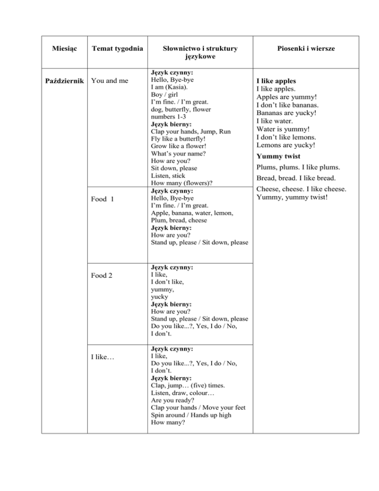 Miesiąc Temat tygodnia Październik You and me Food 1 Food 2 I like… Słownictwo i struktury językowe Język czynny: Hello, Bye-bye I am (Kasia). Boy / girl I’m fine. / I’m great. dog, butterfly, flower numbers 1-3 Język bierny: Clap your hands, Jump, Run Fly like a butterfly! Grow like a flower! What’s your name? How are you? Sit down, please Listen, stick How many (flowers)? Język czynny: Hello, Bye-bye I’m fine. / I’m great. Apple, banana, water, lemon, Plum, bread, cheese Język bierny: How are you? Stand up, please / Sit down, please Język czynny: I like, I don’t like, yummy, yucky Język bierny: How are you? Stand up, please / Sit down, please Do you like...?, Yes, I do / No, I don’t. Język czynny: I like, Do you like...?, Yes, I do / No, I don’t. Język bierny: Clap, jump… (five) times. Listen, draw, colour… Are you ready? Clap your hands / Move your feet Spin around / Hands up high How many? Piosenki i wiersze I like apples I like apples. Apples are yummy! I don’t like bananas. Bananas are yucky! I like water. Water is yummy! I don’t like lemons. Lemons are yucky! Yummy twist Plums, plums. I like plums. Bread, bread. I like bread. Cheese, cheese. I like cheese. Yummy, yummy twist!