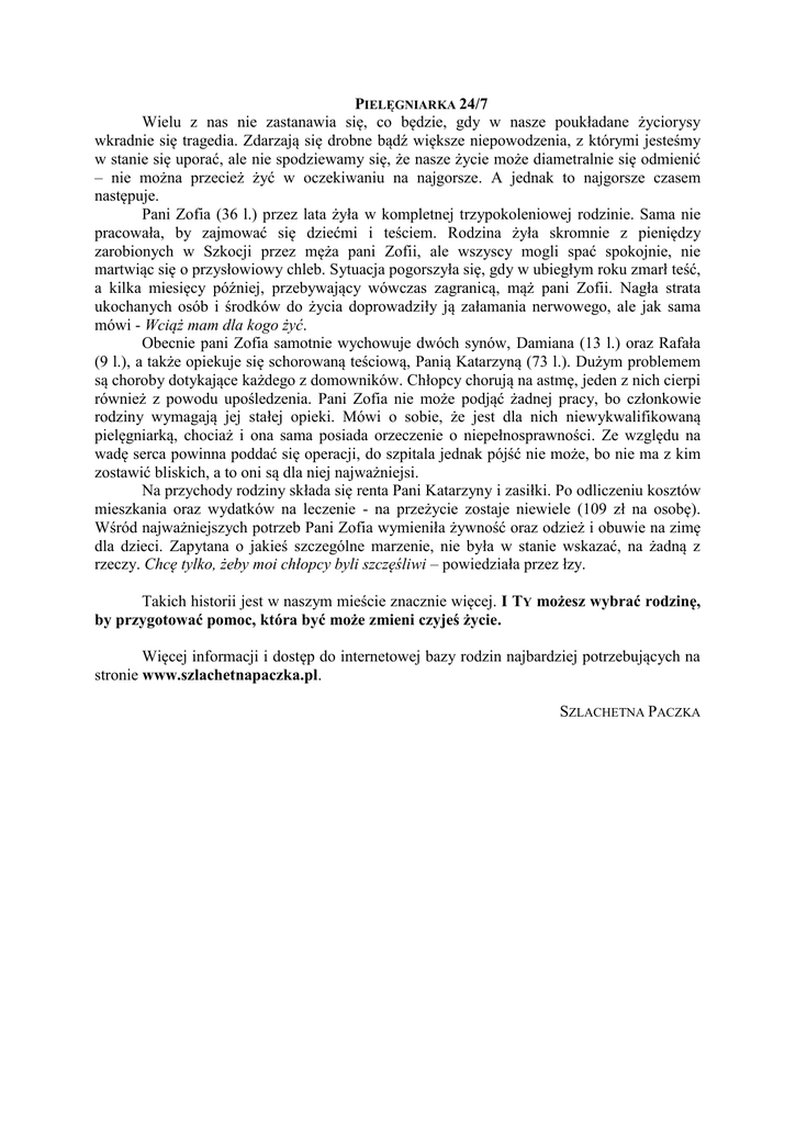 PIELĘGNIARKA 24/7 Wielu z nas nie zastanawia się, co będzie, gdy w nasze poukładane życiorysy wkradnie się tragedia. Zdarzają się drobne bądź większe niepowodzenia, z którymi jesteśmy w stanie się uporać, ale nie spodziewamy się, że nasze życie może diametralnie się odmienić – nie można przecież żyć w oczekiwaniu na najgorsze. A jednak to najgorsze czasem następuje. Pani Zofia (36 l.) przez lata żyła w kompletnej trzypokoleniowej rodzinie. Sama nie pracowała, by zajmować się dziećmi i teściem. Rodzina żyła skromnie z pieniędzy zarobionych w Szkocji przez męża pani Zofii, ale wszyscy mogli spać spokojnie, nie martwiąc się o przysłowiowy chleb. Sytuacja pogorszyła się, gdy w ubiegłym roku zmarł teść, a kilka miesięcy później, przebywający wówczas zagranicą, mąż pani Zofii. Nagła strata ukochanych osób i środków do życia doprowadziły ją załamania nerwowego, ale jak sama mówi - Wciąż mam dla kogo żyć. Obecnie pani Zofia samotnie wychowuje dwóch synów, Damiana (13 l.) oraz Rafała (9 l.), a także opiekuje się schorowaną teściową, Panią Katarzyną (73 l.). Dużym problemem są choroby dotykające każdego z domowników. Chłopcy chorują na astmę, jeden z nich cierpi również z powodu upośledzenia. Pani Zofia nie może podjąć żadnej pracy, bo członkowie rodziny wymagają jej stałej opieki. Mówi o sobie, że jest dla nich niewykwalifikowaną pielęgniarką, chociaż i ona sama posiada orzeczenie o niepełnosprawności. Ze względu na wadę serca powinna poddać się operacji, do szpitala jednak pójść nie może, bo nie ma z kim zostawić bliskich, a to oni są dla niej najważniejsi. Na przychody rodziny składa się renta Pani Katarzyny i zasiłki. Po odliczeniu kosztów mieszkania oraz wydatków na leczenie - na przeżycie zostaje niewiele (109 zł na osobę). Wśród najważniejszych potrzeb Pani Zofia wymieniła żywność oraz odzież i obuwie na zimę dla dzieci. Zapytana o jakieś szczególne marzenie, nie była w stanie wskazać, na żadną z rzeczy. Chcę tylko, żeby moi chłopcy byli szczęśliwi – powiedziała przez łzy. Takich historii jest w naszym mieście znacznie więcej. I TY możesz wybrać rodzinę, by przygotować pomoc, która być może zmieni czyjeś życie. Więcej informacji i dostęp do internetowej bazy rodzin najbardziej potrzebujących na stronie www.szlachetnapaczka.pl. SZLACHETNA PACZKA
