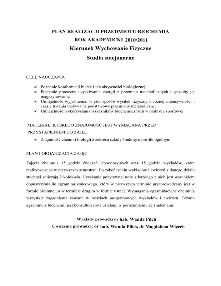 PLAN REALIZACJI PRZEDMIOTU BIOCHEMIA