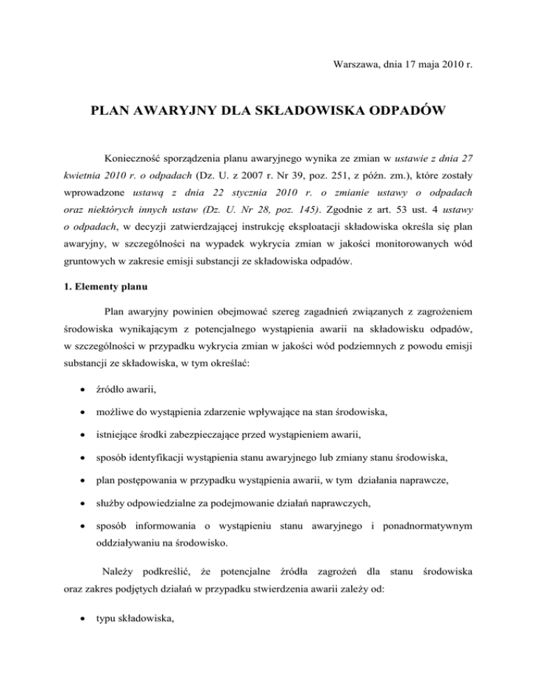 Warszawa, dnia 17 maja 2010 r. PLAN AWARYJNY DLA SKŁADOWISKA ODPADÓW Konieczność sporządzenia planu awaryjnego wynika ze zmian w ustawie z dnia 27 kwietnia 2010 r. o odpadach (Dz. U. z 2007 r. Nr 39, poz. 251, z późn. zm.), które zostały wprowadzone ustawą z dnia 22 stycznia 2010 r. o zmianie ustawy o odpadach oraz niektórych innych ustaw (Dz. U. Nr 28, poz. 145). Zgodnie z art. 53 ust. 4 ustawy o odpadach, w decyzji zatwierdzającej instrukcję eksploatacji składowiska określa się plan awaryjny, w szczególności na wypadek wykrycia zmian w jakości monitorowanych wód gruntowych w zakresie emisji substancji ze składowiska odpadów. 1. Elementy planu Plan awaryjny powinien obejmować szereg zagadnień związanych z zagrożeniem środowiska wynikającym z potencjalnego wystąpienia awarii na składowisku odpadów, w szczególności w przypadku wykrycia zmian w jakości wód podziemnych z powodu emisji substancji ze składowiska, w tym określać: źródło awarii, możliwe do wystąpienia zdarzenie wpływające na stan środowiska, istniejące środki zabezpieczające przed wystąpieniem awarii, sposób identyfikacji wystąpienia stanu awaryjnego lub zmiany stanu środowiska, plan postępowania w przypadku wystąpienia awarii, w tym działania naprawcze, służby odpowiedzialne za podejmowanie działań naprawczych, sposób informowania o wystąpieniu stanu awaryjnego i ponadnormatywnym oddziaływaniu na środowisko. Należy podkreślić, że potencjalne źródła zagrożeń dla stanu środowiska oraz zakres podjętych działań w przypadku stwierdzenia awarii zależy od: typu składowiska, jego wyposażenia, parametrów technicznych, sposobu eksploatacji, charakterystyki jakościowej i ilościowej unieszkodliwianych odpadów. Oddziaływania wynikające z potencjalnego wystąpienia awarii na składowisku odpadów powinny obejmować wszystkie komponenty środowiska (jakość wód gruntowych jest tylko przykładem). 2. Przykładowe źródła awarii W każdym przypadku, uwzględniając specyfikę składowiska odpadów, należy określić potencjalne zagrożenia dla środowiska, które związane są z eksploatacją instalacji. Zagrożenia dla środowiska mogą przykładowo powstać w przypadku awarii składowiska odpadów innych niż niebezpieczne i obojętne, na którym składowane są odpady komunalne, polegającej na: utracie szczelności izolacji kwater lub zbiornika odcieków (w tym przebicia uszczelnienia). Może ona nastąpić np. w wyniku uszkodzeń spowodowanych przez ciężki sprzęt pracujący na kwaterze (szczególnie w strefach przyskarpowych). Awaria może spowodować przepływ odcieków do gruntu i wód gruntowych – w tym przypadku powstanie zagrożenie dla wód podziemnych i powierzchniowych. Wystąpienie tej sytuacji awaryjnej sygnalizowane byłoby pojawieniem się zanieczyszczeń w najbliższych piezometrach - a więc wiadome byłoby dopiero po wystąpieniu zanieczyszczenia środowiska; pożarze złoża odpadów. Może on nastąpić jako rezultat ewentualnego zapłonu i/lub wybuchu gazu składowiskowego albo też w przypadku samozapłonu złoża składowanych odpadów. Należy pamiętać, że ewentualny pożar powoduje emisję gazów i pyłów do atmosfery; wybuchu biogazu. Gaz składowiskowy może uchodzić we wszystkich kierunkach. Znane są przypadki migracji gazu z nieczynnych, zamkniętych składowisk odpadów do oddalonych o kilkadziesiąt, a nawet kilkaset metrów domów mieszkalnych. Najczęściej jednak, w terenie zurbanizowanym gaz migruje istniejącymi przewodami 2 infrastruktury komunalnej. Wybuch gazu możliwy jest również w przypadku nieprawidłowej eksploatacji składowiska lub awarii instalacji służącej do spalania gazu składowiskowego; podtopieniu składowiska. Może ono wystąpić w przypadku wielodniowych ulewnych deszczy. Wynikiem nadmiaru wód opadowych może być przelanie zbiornika magazynowego na odcieki lub w sytuacji krytycznej przelanie odcieków przez obwałowanie składowiska, co może spowodować migrację odcieków do gruntu, wód gruntowych i powierzchniowych; utraty stateczności nasypu odpadów. Utrata stateczności skarp może być spowodowana ich nasyceniem wodą w trakcie długotrwałych opadów lub też może wynikać ze zbyt dużej wysokości i zbyt ostrego nachylenia skarp. Awaria ta nie musi powodować nadzwyczajnych zagrożeń środowiska, o ile nie zostaną zniszczone instalacje służące do ujęcia i odprowadzenia odcieków oraz gazu składowiskowego, a także uszczelnienia podłoża; utraty drożności drenażu odcieków. Może być to spowodowane mechanicznym uszkodzeniem drenażu wskutek osiadania podłoża lub nacisku odpadów albo zarastaniem drenażu osadami biologicznymi lub chemicznymi. W planie awaryjnym dla każdego potencjalnego zagrożenia należy określić działania, jaki należy podjąć, aby wyeliminować źródła zagrożenia lub co najmniej ograniczyć jego negatywny wpływ na zdrowie i życie ludzi oraz na środowisko. Ponadto należy pamiętać, że zarządzający składowiskiem odpadów powinien spełniać wymagania ochrony środowiska (w tym zapobiegania występowania i ograniczania skutków awarii), a w szczególności: przeciwdziałać zanieczyszczeniom, poprzez zapobieganie ich powstawaniu, a jeżeli nie jest to możliwe - poprzez skuteczne ograniczanie wprowadzania do środowiska substancji lub energii, zidentyfikować możliwe zdarzenia, opracować i wdrożyć właściwe procedury oraz posiadać odpowiednie środki i możliwości techniczne dla podejmowania odpowiednich działań w przypadku powstania zakłóceń w procesach technologicznych i operacjach technicznych w celu ograniczenia ich skutków 3 dla środowiska, zapewnić, że emisja z instalacji w warunkach odbiegających od normalnych (w okresie rozruchu, awarii oraz w trakcie likwidacji instalacji) będzie uzasadniona potrzebami technicznymi i nie będzie występować dłużej niż jest to konieczne, eksploatować instal