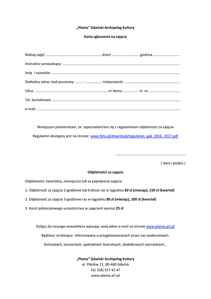 „Plama” Gdański Archipelag Kultury Karta zgłoszenia na zajęcia Rodzaj zajęć: .........................................................dzień ............................ godzina ........................... Instruktor prowadzący: ....................................................................................................................... Imię i nazwisko: .................................................................................................................................. Dokładny adres; kod pocztowy: ........ - ................ miejscowość: ........................................................ Ulica: .......................................................................... nr domu : ............. nr m. ............................... Tel. kontaktowe: …............................................................................................................................... e-mail: .................................................................................................................................................. Niniejszym potwierdzam, że zapoznałam/em się z regulaminem odpłatności za zajęcia Regulamin dostępny jest na stronie: www.feta.pl/download/regulamin_gak_2016_2017.pdf ....................................................................... / data i podpis / Odpłatności za zajęcia Odpłatności: kwartalna, miesięczna lub za pojedyncze zajęcia: 1. Odpłatność za zajęcia 2-godzinne lub krótsze raz w tygodniu 60 zł (miesiąc), 150 zł (kwartał) 2. Odpłatność za zajęcia 3-godzinne raz w tygodniu 80 zł (miesiąc), 200 zł (kwartał) 3. Koszt jednorazowego uczestnictwa w zajęciach wynosi 25 zł Dołącz do naszego newslettera wpisując swój adres e-mail na stronie www.plama.art.pl Będziesz na bieżąco informowany o przygotowywanych przez nas wydarzeniach: festiwalach, koncertach, spektaklach teatralnych, dodatkowych warsztatach... „Plama” Gdański Archipelag Kultury ul. Pilotów 11, 80-460 Gdańsk Tel. (58) 557 42 47 www.plama.art.pl