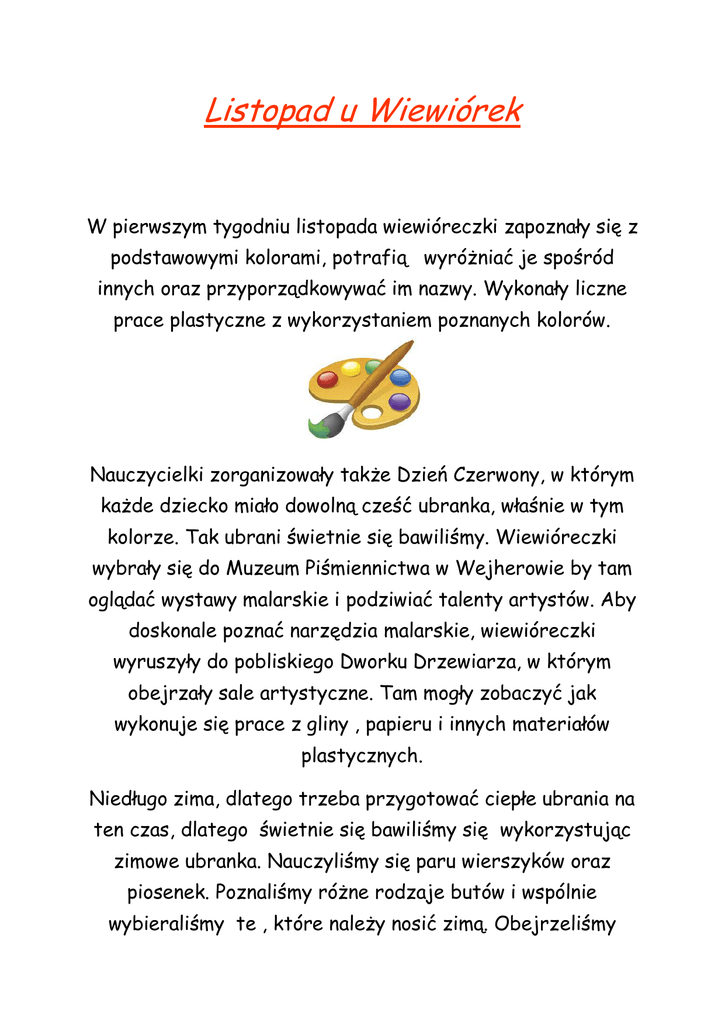 Listopad u Wiewiórek W pierwszym tygodniu listopada wiewióreczki zapoznały się z podstawowymi kolorami, potrafią wyróżniać je spośród innych oraz przyporządkowywać im nazwy. Wykonały liczne prace plastyczne z wykorzystaniem poznanych kolorów. Nauczycielki zorganizowały także Dzień Czerwony, w którym każde dziecko miało dowolną cześć ubranka, właśnie w tym kolorze. Tak ubrani świetnie się bawiliśmy. Wiewióreczki wybrały się do Muzeum Piśmiennictwa w Wejherowie by tam oglądać wystawy malarskie i podziwiać talenty artystów. Aby doskonale poznać narzędzia malarskie, wiewióreczki wyruszyły do pobliskiego Dworku Drzewiarza, w którym obejrzały sale artystyczne. Tam mogły zobaczyć jak wykonuje się prace z gliny , papieru i innych materiałów plastycznych. Niedługo zima, dlatego trzeba przygotować ciepłe ubrania na ten czas, dlatego świetnie się bawiliśmy się wykorzystując zimowe ubranka. Nauczyliśmy się paru wierszyków oraz piosenek. Poznaliśmy różne rodzaje butów i wspólnie wybieraliśmy te , które należy nosić zimą. Obejrzeliśmy także technikę wiązania butów i samodzielnie próbowaliśmy bawić się w przewlekanie sznurków przez otwory np. dużych guzików lub bucików . Bacznie obserwowaliśmy zmiany zachodzące w przyrodzie podczas licznych spacerów, na które samodzielnie się ubieraliśmy. Kolejny tydzień był powiązany z listonoszem, dlatego nie mogło go zabraknąć w naszym przedszkolu. nadzieję, że Zdradził nam tajemnicę jak szybko docierają do nas listy i opowiedział o swojej odpowiedzialnej i trudnej pracy. Pojechaliśmy autokarem na pocztę w Wejherowie , by podejrzeć prace pań tam pracujących . Wspólnie z naszymi paniami napisaliśmy i narysowaliśmy list do Świętego Mikołaja. Pod koniec miesiąca poznaliśmy naszych małych przyjaciół – ptaszki, którym będziemy pomagali podczas zimy. Zapamiętaliśmy nazwy niektórych z nich: wróbelek, gil, sikorka. Przygotowaliśmy im także wspaniałe mieszkanko na zimowe dni. Opracowała mgr Aleksandra Ruth Poznane piosenki „Przyjdź do mnie mały Jezusiku” Ref: Przyjdź do mnie mały Jezusiku, Zamieszkaj w moim pokoiku, w lalczynym łóżku cię położę, przyjdź tylko do mnie mały Boże. 1. Lalka ci miejsca ustąpiła, Teraz sie pięknie pokłoniła, I nawet wielki groźny lew, W kornym pokłonie spuścił łeb. Ref: Przyjdź do mnie... 2. Pieska uwiąże by nie szczekał Pajac ukłonił się z daleka A miś na straży stanie z boku, By nikt nie zrobił krzywdy Bogu 3. A jeszcze lepiej mały Boże w serduszku moim cie ułożę Będziesz cieplutkie miał mieszkanie, Przyjdź tylko do mnie mały Panie Pan Listonosz 1.Przez ulice długie od samego rana idzie pan listonosz torbę ma wypchaną Ref: Czy pogoda, Czy dzień mglisty pan listonosz nosi listy x2 2. Stuku Puku proszę wpuśćcie listonosza x2 Ref: Czy pogoda, Czy dzień mglisty pan listonosz nosi listy x2 Święty Mikołaj 1.Święty Mikołaj nocą wędruje W okna zagląda i nasłuchuje Gwiazdką w okna świeci -gdzie są grzeczne dzieci x2 2.O każdym grzecznym dziecku zawsze pamięta Dobry dziadunio, Mikołaj Święty Co za radość będzie, gdy do nas przybędzie x2 Kolędy: Przybieżeli do Betlejem Przybieżeli do Betlejem pasterze, Grając skocznie Dzieciąteczku na lirze. Chwała na wysokości, chwała na wysokości, A pokój na ziemi. Lulajże Jezuniu Lulajże, Jezuniu, moja perełko, Lulaj, ulubione me pieścidełko. Lulajże, Jezuniu, lulajże, lulaj, A Ty Go, Matulu, w płaczu utulaj..