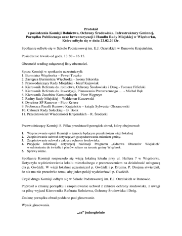 Protokół z posiedzenia Komisji Rolnictwa, Ochrony Środowiska, Infrastruktury Gminnej, Porządku Publicznego oraz Inwentaryzacji i Handlu Rady Miejskiej w Więcborku, Które odbyło się w dniu 22.02.2013r. Spotkanie odbyło się w Szkole Podstawowej im. E.J. Orzelskich w Runowie Krajeńskim. Posiedzenie trwało od godz. 13:30 – 16:15. Obecność według załączonej listy obecności. Spoza Komisji w spotkaniu uczestniczyli: 1. Burmistrz Więcborka – Paweł Toczko 2. Zastępca Burmistrza Więcborka - Iwona Sikorska 3. Przewodniczący Rady Miejskiej - Józef Kujawiak 4. Kierownik Referatu ds. rolnictwa, Ochrony Środowiska i Dróg - Tomasz Fifielski 5. Kierownik Referatu ds. Inwestycji, Planowania Przestrzennego … - Michał Bąk 6. Kierownik Zasobów Komunalnych – Piotr Węgrzyn 7. Radny Rady Miejskiej – Waldemar Kuszewski 8. Dyrektor SP Runowo – Piotr Kriese 9. Proboszcz Parafii Runowo Krajeńskie – ksiądz Sylwester Olszanowski 10. Członek Rady Sołeckiej – B. Bonk 11. Przedstawiciel Wiadomości Krajeńskich – R. Środecki Przewodniczący Komisji S. Piłka przedstawił porządek obrad, który obejmował: Wypracowanie opinii Komisji w temacie będącym przedmiotem wizji lokalnej Zaopiniowanie uchwał dotyczących gospodarowania mieniem gminy. Zaopiniowanie uchwał z zakresu ochrony środowiska. Przyjęcie informacji dotyczącej realizacji Programu „Odnowa Obszarów w odniesieniu do świetlic i placów zabaw na terenie gminy Więcbork. 5. Sprawy różne. 1. 2. 3. 4. Wiejskich” Spotkanie Komisji rozpoczęło się wizją lokalną lokalu przy ul. Hallera 7 w Więcborku. Dotyczyło wydzierżawienia lokalu mieszkalnego z przeznaczeniem na działalność usługową dla p. Gwóźdź. W wizji lokalnej uczestniczył p. Gwóźdź i p. Drojma. P. Drojma stwierdził, że nie ma nic przeciwko temu, aby jeden pokój wydzierżawił p. Gwóźdź. Część druga Komisji odbyła się w Szkole Podstawowej im. E.J. Orzelskich w Runowie. Poprosił o zmianę porządku i zaopiniowanie uchwał z zakresu ochrony środowiska, z uwagi na pilny wyjazd Kierownika Referatu Rolnictwa, Ochrony Środowiska i Dróg. Zmianę porządku obrad poddano pod głosowanie. Wynik głosowania. „za” jednogłośnie T. Fifielski przedstawił pierwszy projekt uchwały dot. aktualizacji programu azbestowego. Wyjaśnił, że chodzi o uzyskanie dotacji przez mieszkańców na demontaż, utylizację oraz transport azbestu. Zmienia się ilość ton azbestu. Dodał, że jesteśmy gminą, która dzielnie walczy z azbestem. W tym roku złożono wnioski na 280 ton. Pytań nie było. Przystąpiono do głosowania. Wynik głosowania. „za” jednogłośnie Projekt drugiej uchwały dot. opieki nad zwierzętami bezdomnymi oraz zapobiegania bezdomności zwierząt w Gminie Więcbork w 2013 r. T. Fifielski wyjaśnił, że uchwała ta podejmowana jest corocznie. Nic się nie zmieniło. Dalej jest przytulisko na oczyszczalni w Runowie, umowa z Trzcianką, umowa na tymczasowe zatrzymanie zwierząt gospodarskich. Zmienia się jedynie kwota w § 12 – 15 tys. zł na zakup pożywienia i niezbędnych zabiegów weterynajryjnych. R. Mroczkowski poprosił, aby ponownie pochylić się nad problemem psów bezdomnych. Uważa, że psy można czipować. Jego zdaniem problem jest do rozwiązania. T. Fifielski odpowiedział, że w listopadzie Komisja Budżetu i Finansów złożyła wniosek, w którym zobowiązała Burmistrza do opracowania systemu ewidencjonowania zwierząt. Skontaktował się z fundacją, która ma biuro identyfikacji zwierząt i gminy za jej pośrednictwem próbują problem rozwiązać. Przytoczył e-maile prowadzone z fundacją. Należałoby zakupić transponder z aplika torem – 12 zł, czytnik, 1100 zł, książeczka dla każdego psa 3 zł. W gminie jest 1500 psów. Prawnie jest to do zrobienia. System taki może być wprowadzony art. 11aust.2 pkt 3 ustawy o ochronie zwierząt. Koszty pozostają po stronie urzędu. Wystarczyłoby zawrzeć umowę z gabinetami weterynaryjnymi. Żeby jednak zadziałało trzeba wydać jakieś 30 tys. zł. Tak wynika z wyliczeń referatu. W. Kuszewski odpowiedział, że o problemie mówimy już od jakiegoś czasu. Mówiliśmy, że koszt czipowania jednego psa nie przekracza rocznej opłaty za psa. W pierwszym roku wyszłoby na zero. Chodzi o wprowadzenie porządku. Na psy bezdomne gmina też płaci. Dodał, że nie wie skąd wzięła się kwota 30 tys. zł. Pamiętajmy, że z tytułu posiadania psa wpłyną opłaty. T. Fifielski dodał, że rolnicy są zwolnieni z opłaty do 2 psów oraz emeryci. Ludzie narzekają, że 45 zł to duża kwota. Poddaję to pod rozwagę. Burmistrz P. Toczko dodał, że można zaczipować zwierzęta, wydać 30 tys. zł. Na dzień dzisiejszy ustawodawca zakazał handlu zwierzętami bez dokumentów. Miało to ograniczyć liczbę bezpańskich zwierząt. Ustawa została pominięta. Dochodzi do sytuacji, że sprzedaje się obrożę za 500 zł, a zwierzę gratis. Sytuacja zmieni się dopiero wówczas kiedy będzie przepis nakazujący sterylizację zwierząt niehodowlanych. System ewidencjonowania można wprowadzić na terenie miasta. Na wsi zawsze jest możliwość wytłumaczenia. W. Kuszewski odpowiedział, że ma świadomość, że mówimy głównie o mieście. Chodzi o zanieczyszczenie chodników. M. Wobszal dodał, że czipowanie jest dobre kiedy chodzi o odnalezienie psa. Każdy właściciel powinien dbać o swojego psa. Zgodził się z tym, co mówi p. Burmistrz. Potrzebna jest edukacja ludzi. Porządny właściciel nie wypuści psa. J. Antczak zapytał ile jest psów w naszym przytulisku. W zeszłym roku dużo ludzi wzięło psy. T. Fifielski odpowiedział, że 20-25 szt. W ciągu roku. Po „akcji żużlowej” zeszliśmy do 13. W tym roku mamy mniej środków finansowych i schodzimy z żużlu na rzecz gruzu. Są mieszkańcy zainteresowani. Prowadzimy negocjacje i będziemy się starali jakiś materiał zabezpieczyć. Więcej pytań nie było. Przystąpiono d