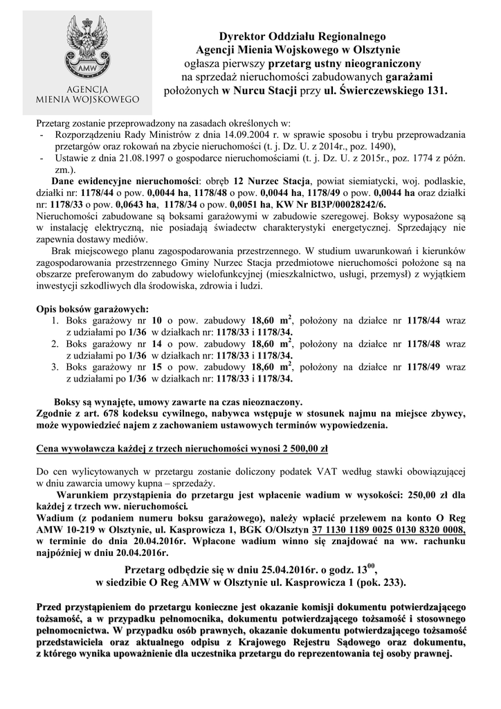 Dyrektor Oddziału Regionalnego Agencji Mienia Wojskowego w Olsztynie ogłasza pierwszy przetarg ustny nieograniczony na sprzedaż nieruchomości zabudowanych garażami położonych w Nurcu Stacji przy ul. Świerczewskiego 131. Przetarg zostanie przeprowadzony na zasadach określonych w: - Rozporządzeniu Rady Ministrów z dnia 14.09.2004 r. w sprawie sposobu i trybu przeprowadzania przetargów oraz rokowań na zbycie nieruchomości (t. j. Dz. U. z 2014r., poz. 1490), - Ustawie z dnia 21.08.1997 o gospodarce nieruchomościami (t. j. Dz. U. z 2015r., poz. 1774 z późn. zm.). Dane ewidencyjne nieruchomości: obręb 12 Nurzec Stacja, powiat siemiatycki, woj. podlaskie, działki nr: 1178/44 o pow. 0,0044 ha, 1178/48 o pow. 0,0044 ha, 1178/49 o pow. 0,0044 ha oraz działki nr: 1178/33 o pow. 0,0643 ha, 1178/34 o pow. 0,0051 ha, KW Nr BI3P/00028242/6. Nieruchomości zabudowane są boksami garażowymi w zabudowie szeregowej. Boksy wyposażone są w instalację elektryczną, nie posiadają świadectw charakterystyki energetycznej. Sprzedający nie zapewnia dostawy mediów. Brak miejscowego planu zagospodarowania przestrzennego. W studium uwarunkowań i kierunków zagospodarowania przestrzennego Gminy Nurzec Stacja przedmiotowe nieruchomości położone są na obszarze preferowanym do zabudowy wielofunkcyjnej (mieszkalnictwo, usługi, przemysł) z wyjątkiem inwestycji szkodliwych dla środowiska, zdrowia i ludzi. Opis boksów garażowych: 1. Boks garażowy nr 10 o pow. zabudowy 18,60 m2, położony na działce nr 1178/44 wraz z udziałami po 1/36 w działkach nr: 1178/33 i 1178/34. 2. Boks garażowy nr 14 o pow. zabudowy 18,60 m2, położony na działce nr 1178/48 wraz z udziałami po 1/36 w działkach nr: 1178/33 i 1178/34. 3. Boks garażowy nr 15 o pow. zabudowy 18,60 m2, położony na działce nr 1178/49 wraz z udziałami po 1/36 w działkach nr: 1178/33 i 1178/34. Boksy są wynajęte, umowy zawarte na czas nieoznaczony. Zgodnie z art. 678 kodeksu cywilnego, nabywca wstępuje w stosunek najmu na miejsce zbywcy, może wypowiedzieć najem z zachowaniem ustawowych terminów wypowiedzenia. Cena wywoławcza każdej z trzech nieruchomości wynosi 2 500,00 zł Do cen wylicytowanych w przetargu zostanie doliczony podatek VAT według stawki obowiązującej w dniu zawarcia umowy kupna – sprzedaży. Warunkiem przystąpienia do przetargu jest wpłacenie wadium w wysokości: 250,00 zł dla każdej z trzech ww. nieruchomości. Wadium (z podaniem numeru boksu garażowego), należy wpłacić przelewem na konto O Reg AMW 10-219 w Olsztynie, ul. Kasprowicza 1, BGK O/Olsztyn 37 1130 1189 0025 0130 8320 0008, w terminie do dnia 20.04.2016r. Wpłacone wadium winno się znajdować na ww. rachunku najpóźniej w dniu 20.04.2016r. Przetarg odbędzie się w dniu 25.04.2016r. o godz. 1300, w siedzibie O Reg AMW w Olsztynie ul. Kasprowicza 1 (pok. 233). Przed przystąpieniem do przetargu konieczne konieczne jest okazanie komisji dokumentu potwierdzającego tożsamość, a w przypadku pełnomocnika, dokumentu potwierdzającego tożsamość i stosownego pełnomocnictwa. W przypadku osób prawnych, okazanie dokumentu potwierdzającego tożsamość przedstawiciela oraz aktualnego odpisu odpisu z Krajowego Rejestru Sądowego oraz dokumentu, z którego wynika upoważnienie dla uczestnika przetargu do reprezentowania tej osoby prawnej. Termin do złożenia wniosku przez osoby, którym przysługuje pierwszeństwo w nabyciu nabyciu nieruchomości na podstawie art. 34 ust. 1 pkt. 1 i 2 ustawy o gospodarce nieruchomościami, minął 14.12.2015r. Osoby, którym przysługiwało pierwszeństwo w nabyciu, o których mowa w ustawie z dnia 8 lipca 2005r. o realizacji prawa do rekompensaty z tytułu pozostawienia nieruchomości poza obecnymi granicami RP (Dz. U. z 2014r 2014r., poz. 1090) 1090) zwalnia się z obowiązku wniesienia wadium, jeżeli w terminie do dnia 20.04.201 6r. zgłoszą uczestnictwo w przetargu przedstawiając oryginał zaświadczenia lub decyzji 20.04.2016 potwierdzającej prawo do rekompensaty z adnotacją wojewody o wybranej formie realizacji prawa do rekompensaty zgodnie z art. 7 i 8 powołanej ustawy oraz złożą pisemne zobowiązanie do uiszczenia kwoty równej wysokości wadium ustalonego w razie uchylenia się się od zawarcia umowy. W dniu przetargu (przed jego otwarciem) powinny także okazać komisji, wypisy z rejestrów, o których mowa w art. 19 powołanej ustawy. Wadium wpłacone przez uczestnika, który przetarg wygrał zostanie zaliczone na poczet ceny nabycia. nabycia. Osobom, które przetarg przegrały, wadium zostanie niezwłocznie zwrócone. Nie podpisanie protokołu z przetargu z przyczyn niezależnych od Agencji oraz nie przystąpienie bez usprawiedliwienia do zawarcia umowy w miejscu i w terminie terminie wskazanym wskazanym przez Agencję, może spowodować odstąpienie organizatora przetargu od zawarcia umowy i zgodnie z Art. 41 ust 2 ustawy z dnia 21.08.1997r. o gospodarce nieruchomościami (t. j. Dz. U. z 2015r., poz. 1774) wpłacone wadium nie podlega podlega zwrotowi. Wygrywający przetarg będzie zobowiązany do zapłaty ceny ustalonej w drodze przetargu (pomniejszonej o wpłacone wadium) na cztery dni przed zawarciem notarialnej umowy kupna sprzedaży, pokrycia kosztów związanych z zawarciem aktu notarialnego notarialnego i opłatą sądową. W przypadku cudzoziemców mają zastosowanie przepisy ustawy z dnia 24.03.1920r. o nabywaniu nieruchomości przez cudzoziemców (t. j. D z. U. z 2014 r., poz. 1380 z późn. zm.). zm.). Dyrektor Oddziału Regionalnego AMW Olsztyn może odwołać przetarg podając przyczynę. Szczegółowych informacji dotyczących przetargu udzielają pracownicy OON AMW w Olsztynie ul. Kasprowicza 1 pok. 214, tel.: (89) 536-32-37 lub (89) 536-31-31, 693 080 653. Nieruchomość można obejrzeć po uzgodnieniu telefonicznym w dniach od poniedziałku do piątku w godz. 8 00 – 15 00, tel.: (85) 746 06 44 wew.129. Niniejsze ogłoszenie zostało opublikowane na st