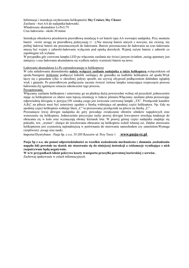 Informacje i instrukcja użytkowania helikopterów Sky Cruiser, Sky Chaser. Zasilanie - 6szt AA do nadajnika/ładowarki. Wbudowany akumulator Li-Po3,7V Czas ładowania - około 30 minut Instrukcja obrazkowa przedstawia prawidłową instalację 6 szt baterii typu AA wewnątrz nadajnika. Przy montażu baterii zwróć uwagę na prawidłową polaryzację (+ -).Nie mieszaj baterii starych z nowymi, nie zwieraj, nie próbuj ładować baterii nie przeznaczonych do ładowania. Baterie przeznaczone do ładowania na czas ładowania muszą być wyjęte z zabawki-ładowanie wyłącznie pod opieką dorosłych. Wyjmij zużyte baterie z zabawki co zapobiegnie ich wylaniu. W przypadku gdy czerwona lampka LED po włączeniu zasilania nie świeci jasnym światłem ,zasięg aparatury jest mniejszy i czas ładowania akumulatora się wydłuża należy wymienić baterie na nowe. Ładowanie akumulatora Li-Po zainstalowanego w helikopterze W celu naładowania akumulatorka należy wyłączyć zasilanie nadajnika a także helikoptera wyłącznikiem od spodu.Następnie delikatnie podłączyć kabelek zasilający do gniazdka na kadłubie helikoptera od spodu.Wtyk łączy się z gniazdem tylko w określony jedyny sposób, nie używaj siły,przed podłączeniem dokładnie oglądnij wtyk i gniazdo. Po prawidłowym podłączeniu zacznie świecić zielona lampka oznaczająca rozpoczęcie procesu ładowania.Jej zgaśnięcie oznacza zakończenie tego procesu. Przygotowanie Włączamy zasilanie helikoptera i ustawiamy go na płaskiej dużej powierzchni wolnej od przeszkód ,jednocześnie stając za helikopterem co ułatwi nam lepszą orientację w trakcie pilotażu.Włączamy zasilanie pilota przesuwając odpowiednią dźwignię w pozyjcę ON oznaką czego jest świecenie czerwonej lampki „TX”. Przełącznik kanałów A,B,C na pilocie musi być ustawiony zgodnie z literką widniejąca od spodniej częćsi helikoptera. Np. Gdy na spodniej części helikoptera widnieje litera „C” to przesuwamy przełącznik na pilocie na literkę „C”. Przesunięcie lewej dźwigni nadajnika do góry powoduje zwiększanie obrotów silników napędowych oraz wznoszenie się helikoptera. Jednocześnie precyzyjne ruchy prawej dźwigni lewo-prawo niwelują tendencje do obracania się w koło oraz wyznaczają obrany kierunek lotu. W prawej górnej części nadajnika znajduje się pokrętło, tzw. „trymer”, służące do niwelowania obracania się helikoptera wokół własnej osi. Zdalne sterowanie helikopterem jest czynnością najtrudniejszą w porównaniu do sterowania samochodem czy samolotem.Wymaga cierpliwości ,uwagi oraz nauki. Importer/Dystrybutor : Pasja Sp. z o.o. 35-205 Rzeszów ul. Przy Torze 1 www.pasja-rc.pl Pasja Sp z o.o. nie ponosi odpowiedzialności za wszelkie uszkodzenia mechaniczne ( złamania ,uszkodzenia napędu itd) powstałe na skutek nie stosowania się do niniejszej instrukcji a reklamacje wynikające z nich rozpatrywane będą negatywnie. W w/w przypadkach klient pokrywa koszty transportu przesyłki powrotnej kurierskiej z serwisu . Zachowaj opakowanie w celach informacyjnych.