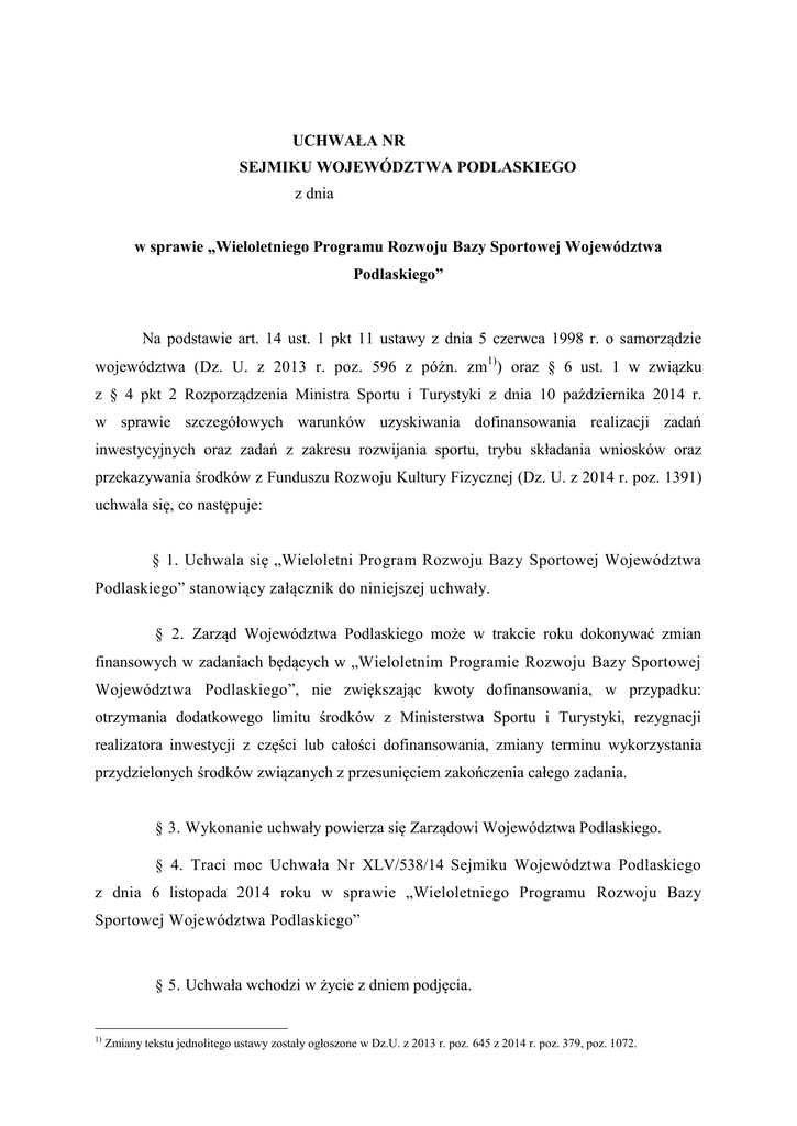 UCHWAŁA NR SEJMIKU WOJEWÓDZTWA PODLASKIEGO z dnia w sprawie „Wieloletniego Programu Rozwoju Bazy Sportowej Województwa Podlaskiego” Na podstawie art. 14 ust. 1 pkt 11 ustawy z dnia 5 czerwca 1998 r. o samorządzie województwa (Dz. U. z 2013 r. poz. 596 z późn. zm1)) oraz § 6 ust. 1 w związku z § 4 pkt 2 Rozporządzenia Ministra Sportu i Turystyki z dnia 10 października 2014 r. w sprawie szczegółowych warunków uzyskiwania dofinansowania realizacji zadań inwestycyjnych oraz zadań z zakresu rozwijania sportu, trybu składania wniosków oraz przekazywania środków z Funduszu Rozwoju Kultury Fizycznej (Dz. U. z 2014 r. poz. 1391) uchwala się, co następuje: § 1. Uchwala się „Wieloletni Program Rozwoju Bazy Sportowej Województwa Podlaskiego” stanowiący załącznik do niniejszej uchwały. § 2. Zarząd Województwa Podlaskiego może w trakcie roku dokonywać zmian finansowych w zadaniach będących w „Wieloletnim Programie Rozwoju Bazy Sportowej Województwa Podlaskiego”, nie zwiększając kwoty dofinansowania, w przypadku: otrzymania dodatkowego limitu środków z Ministerstwa Sportu i Turystyki, rezygnacji realizatora inwestycji z części lub całości dofinansowania, zmiany terminu wykorzystania przydzielonych środków związanych z przesunięciem zakończenia całego zadania. § 3. Wykonanie uchwały powierza się Zarządowi Województwa Podlaskiego. § 4. Traci moc Uchwała Nr XLV/538/14 Sejmiku Województwa Podlaskiego z dnia 6 listopada 2014 roku w sprawie „Wieloletniego Programu Rozwoju Bazy Sportowej Województwa Podlaskiego” § 5. Uchwała wchodzi w życie z dniem podjęcia. 1) Zmiany tekstu jednolitego ustawy zostały ogłoszone w Dz.U. z 2013 r. poz. 645 z 2014 r. poz. 379, poz. 1072. UZASADNIENIE Pismem z dnia 24 lutego 2015 r. Ministerstwo Sportu i Turystyki poinformowało, iż limit dla Województwa Podlaskiego na 2015 r. wynosi 6 342,4 tys. zł. Zobowiązania wynikające z tytułu zawartych umów na dofinansowanie w latach poprzednich samorządów Województwa Podlaskiego wynosi ogółem 3 829,3 tys. zł. w związku z powyższym kwota przeznaczona na inwestycje noworozpoczynane w roku 2015 wynosi 2 513,1 tys. zł. Zgodnie z Rozporządzeniem Ministra Sportu i Turystyki w sprawie dofinansowania zadań ze środków Funduszu Rozwoju Kultury Fizycznej, wnioski inwestycyjne inwestorzy muszą złożyć w nieprzekraczalnym terminie do 31 maja br. Dlatego też należy dokonać aktualizacji „Wieloletniego Programu Rozwoju Bazy Sportowej Województwa Podlaskiego”. Zgodnie z zasadami realizacji „Inwestycji Terenowych” ze środków FRKF oraz Rozporządzenia Ministra Sportu i Turystyki w sprawie dofinansowania zadań ze środków FRKF, kwota środków Funduszu na dofinansowanie realizacji zadań inwestycyjnych, nie może być niższa niż 20% kosztu całkowitego zadania inwestycyjnego i nie może przekroczyć 33% wartości kosztorysowej inwestycji określonej w zbiorczym zestawieniu kosztów, zwanej dalej „wartością kosztorysową inwestycji”. Dopuszcza się dofinansowanie do 70% wartości kosztów kwalifikowanych inwestycji realizowanych w gminach w których wskaźnik G (Wskaźnik G - podstawowe dochody podatkowe na 1 mieszkańca gminy przyjęty do obliczania subwencji wyrównawczej) jest mniejszy lub równy 40% wskaźnika Gg (Wskaźnik gminny Gg dla kraju). Proponuje się dofinansowanie poniższych inwestycji: 1. Białostocki Klub Sportowy Hetman – budowa pełnowymiarowej sali gimnastycznej z zapleczem sanitarno – administracyjnym (zwiększenie dofinansowania inwestycji realizowanej o 100 tys. zł) Transza w 2015 r. – 500 tys. zł; 2. Miasto Suwałki – budowa boisk sportowych wraz z zagospodarowaniem terenu przy ZS nr 9 w Suwałkach, wartość kosztorysowa – 1 467 tys. zł. Dofinansowanie ogółem 450 tys. zł (30,6%). Transza w 2015 r. – 380 tys. zł; 3. Miasto Suwałki – budowa bieżni przy SP nr 7 w Suwałkach, wartość kosztorysowa – 358 tys. zł. Dofinansowanie ogółem 105 tys. zł (29,3%). Transza w 2015 r. – 105 tys. zł; 4. Miasto Suwałki – budowa street workaut i parkur park oraz siłowni zewnętrznych, wartość kosztorysowa – 602 tys. zł. Dofinansowanie ogółem 180 tys. zł (29,9%). Transza w 2015 r. – 130 tys. zł; 5. Miasto i Gmina Łapy – budowa sportowych obiektów przyszkolnych przy ZS w Płonce Kościelnej oraz PG nr 1 w Łapach wartość kosztorysowa – 310 tys. zł. Dofinansowanie ogółem 100 tys. zł (32,2%). Transza w 2015 r. 60 tys. zł; 6. Miasto Wasilków – remont sal gimnastycznych w SP w Wasilkowie, wartość kosztorysowa – 350 tys. zł. Dofinansowanie ogółem 105 tys. zł (30%). Transza w 2015 r. 105 tys. zł; 7. Gmina Sokoły – remont boiska przy ZS w Sokołach, wartość kosztorysowa – 370 tys. zł. Dofinansowanie ogółem 111 tys. zł (30%). Transza w 2015 r. 50 tys. zł; 8. Gmina Czarna Białostocka – budowa boiska wielofunkcyjnego przy ZS w Czarnej Wsi Kościelnej, wartość kosztorysowa – 410 tys. zł. Dofinansowanie ogółem 123 tys. zł (30%). Transza w 2015 r. 50 tys. zł; 9. Gmina Białowieża – budowa placu zabaw przy Zespole Szkolno Przedszkolnym w Białowieży, wartość kosztorysowa – 160 tys. zł. Dofinansowanie ogółem 50 tys. zł (31%). Transza w 2015 r. 50 tys. zł; 10. Miasto Augustów - budowa boiska do piłki nożnej, bieżni i skoczni do skoku w dal przy Gimnazjum nr 2 w Augustowie, wartość kosztorysowa – 1 238 tys. zł. Dofinansowanie ogółem 371 tys. zł (29,9%). Transza w 2015 r. 100 tys. zł; 11. Miasto Augustów – modernizacja kortu tenisowego przy Centrum Sportu i Rekreacji w Augustowie, wartość kosztorysowa – 337 tys. zł. Dofinansowanie ogółem 100 tys. zł (29,6%). Transza w 2015 r. 100 tys. zł; 12. Gmina Suchowola – przebudowa boiska na boisko wielofunkcyjne lekkoatletyczne przy ZS w Suchowoli, wartość kosztorysowa – 1 294 tys. zł. Dofinansowanie ogółem 388 tys. zł (29,9%). Transza w 2015 r. 50 tys. zł; 13. 