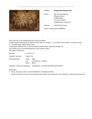 [ Informacje dodatkowe: https://www.museum-digital.de/meckpomm/index.php?t=objekt&oges=208 vom 09.03.2017 ] Obiekty: Gruppenfoto Belegschaft Muzea: Otto-Lilienthal-Museum Ellbogenstraße 1 17389 Anklam +49-3971-245500 [email protected] Kolekcje: Lilienthal-Sammlung Numer inwentarzowy: 9299/B/001 Otto Lilienthal mit der Belegschaft seiner Maschinenfabrik Großformatiger Papierabzug auf Original-Karton Sign VS: "Photogr. v. W. K. Böhme, Berlin 1887. II, Dresdner Straße II" , Aussilberungen, differenzieller Glanz Gruppenbild aufgenommen im Hof der Maschinenfabrik Berlin, Köpenicker Straße 113 (vgl. Einführung der Gewinnbeteiligung für seine Arbeiter 1890) RS: spätere Handschrift Wymiary: 17,5*22,2 cm Materiał / Technika: Papier, Film Sfotografowanie ... kiedy: 1887 kto: Fotoatelier W. K. Böhme gdzie: Berlin [Związek z osobą lub instytucją] ... Dampfkessel- und Maschinenfabrik Otto Lilienthal Bibliografia: * Runge, Manuela; Lukasch, Bernd (2005/2007): Erfinderleben. Berlin * Seifert, Karl-Dieter; Lukasch, Bernd; Weiß, Reiner (2004): Der Dampfmotor des Flugpioniers. Anklam / Patrimonia 271