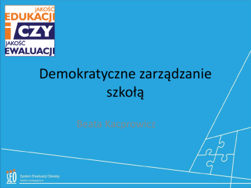 Demokratyczne zarządzanie szkołą Beata Kacprowicz W skład demokratycznego zarządzania szkołą wchodzą: delegowanie uprawnień zespoły zadaniowe wspólny wybór celów rozwojowych dla szkoły włączenie w działalność szkoły środowiska lokalnego (rodzice, dziadkowie, absolwenci, mieszkańcy) transparentność zarządzania 1. Delegowanie uprawnień: Więcej niż jeden lider Nauczyciele są autorami projektów Odpowiedzialność nauczycieli za wdrażane pomysły Wspólne ustalanie szkolnego prawa Powoływanie dodatkowych podmiotów mających wpływ na działanie szkoły 2. Zespoły Zadaniowe i wspólny wybór celów rozwojowych dla szkoły A: rada pedagogiczna rozpoczynająca rok szkolny sprawozdanie z działalności szkoły w poprzednim roku burza mózgów głosowanie nad konkretnymi celami deklaracje nauczycieli 2. Zespoły Zadaniowe i wspólny wybór celów rozwojowych dla szkoły B: Rok szkolny szczegółowy plan działania zespołu podział obowiązków w ramach zespołów realizacja planu (monitoring dyrekcji) ewaluacja 3.Włączenie w działalność szkoły środowiska lokalnego (rodzice, dziadkowie, absolwenci, mieszkańcy) Powołanie Rady Szkoły Powołanie Stowarzyszenia Wspólne organizowanie imprez środowiskowych Wspólne pisanie projektów Szkoła jako centrum edukacyjno-kulturalne dzielnicy 4. Transparentność zarządzania: Dostęp do dokumentacji Tworzenie dokumentów przez liderów Tworzenie dokumentów przez różne podmioty szkoły i środowiska Poddawanie dyrektora procesowi ewaluacji Przyznawanie nagród przez zespoły Otwarte drzwi do gabinetu dyrektora 5. Styl „dyrektorowania” Otwartość /szczerość poczucie humoru empatia gust/styl/wygląd odpowiedzialność umiejętność przyjmowania krytyki zaangażowanie i pasja dobry gospodarz Umiejętność rozwiązywania konfliktów Dziękuję za uwagę [email protected]