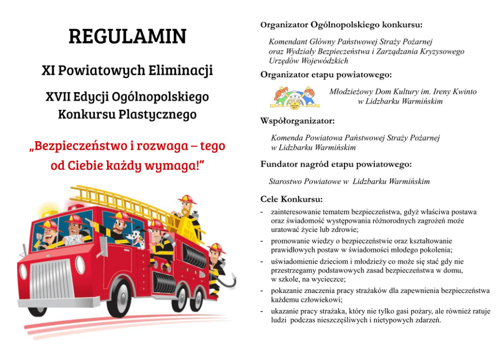 Organizator Ogólnopolskiego konkursu: Komendant Główny Państwowej Straży Pożarnej oraz Wydziały Bezpieczeństwa i Zarządzania Kryzysowego Urzędów Wojewódzkich Organizator etapu powiatowego: Młodzieżowy Dom Kultury im. Ireny Kwinto w Lidzbarku Warmińskim Współorganizator: Komenda Powiatowa Państwowej Straży Pożarnej w Lidzbarku Warmińskim Fundator nagród etapu powiatowego: Starostwo Powiatowe w Lidzbarku Warmińskim Cele Konkursu: - - - zainteresowanie tematem bezpieczeństwa, gdyż właściwa postawa oraz świadomość występowania różnorodnych zagrożeń może uratować życie lub zdrowie; promowanie wiedzy o bezpieczeństwie oraz kształtowanie prawidłowych postaw w świadomości młodego pokolenia; uświadomienie dzieciom i młodzieży co może się stać gdy nie przestrzegamy podstawowych zasad bezpieczeństwa w domu, w szkole, na wycieczce; pokazanie znaczenia pracy strażaków dla zapewnienia bezpieczeństwa każdemu człowiekowi; ukazanie pracy strażaka, który nie tylko gasi pożary, ale również ratuje ludzi podczas nieszczęśliwych i nietypowych zdarzeń. Uczestnicy konkursu: - I grupa – uczniowie klas I – III szkoły podstawowej II grupa – uczniowie klas IV – VI szkoły podstawowej III grupa – uczniowie gimnazjum - IV grupa – uczniowie i wychowankowie świetlic terapeutycznych, ośrodków terapii zajęciowej i ośrodków szkolno - wychowawczych (bez ograniczeń wiekowych) W tych też kategoriach komisja będzie oceniała nadesłane prace. Etapy eliminacji: Eliminacje powiatowe – do 23 marca 2015r. Eliminacje wojewódzkie – do 08 maja 2015r. Eliminacje centralne – 10 czerwca 2015r. Przebieg eliminacji koordynują Wydziały Bezpieczeństwa i Zarządzania Kryzysowego Urzędów Wojewódzkich. Do konkursu na szczeblu wojewódzkim kwalifikuje się po 5 prac finałowych z każdej z czterech określonych grup wiekowych. Prace należy przesłać do Młodzieżowego Domu Kultury im. Ireny Kwinto w Lidzbarku Warmińskim ul. Poniatowskiego 3 do dnia 6 marca 2015r. O uroczystości zakończenia konkursu, osoby nagrodzone zostaną powiadomione telefonicznie. Informacje dodatkowe: Organizatorzy nie przewidują zwrotu nadesłanych prac. Wybrane prace finałowe mogą być eksponowane na wystawach oraz w budynkach Komendy Głównej PSP, jak również zamieszczone na stronie internetowej www.straz.gov.pl. Nadesłane prace staną się własnością Komendy Głównej PSP i będą stanowiły element promocyjny Państwowej Straży Pożarnej. Nagrodzone prace mogą zostać także wykorzystane do projektowania materiałów popularyzatorskich i promocyjnych opracowywanych przez Komendę Główną Państwowej Straży Pożarnej. Praca powinna być podpisana według załączonych wzorów. (załączniki do regulaminu) Technika wykonywania prac: - dopuszczalne techniki : rysunek, malarstwo, grafika, kolaż, malowanie na tkaninie; - format prac – A4, A3, B2 (największy); - prace zbiorowe, składane, rolowane, malowidła na szkle, kompozycje przestrzenne rzeźby oraz prace wykonane z plasteliny i materiałów sypkich nie będą brane pod uwagę. Życzymy sukcesów w zmaganiu z pędzlem, ołówkiem i kredką