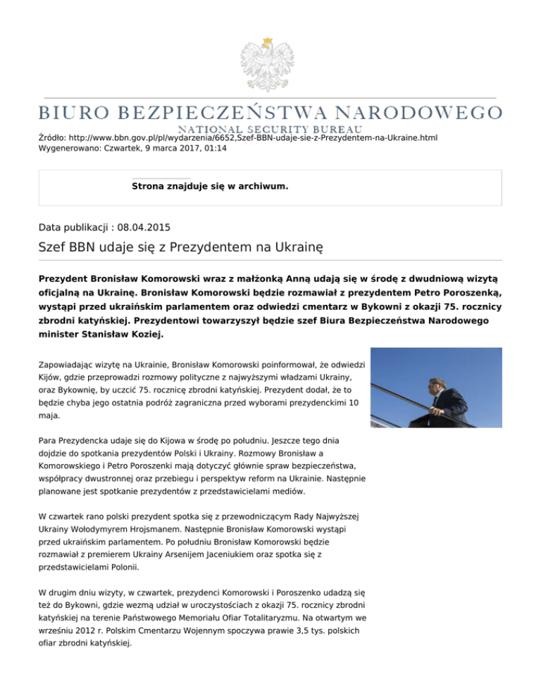 Źródło: http://www.bbn.gov.pl/pl/wydarzenia/6652,Szef-BBN-udaje-sie-z-Prezydentem-na-Ukraine.html Wygenerowano: Czwartek, 9 marca 2017, 01:14 Strona znajduje się w archiwum. Data publikacji : 08.04.2015 Szef BBN udaje się z Prezydentem na Ukrainę Prezydent Bronisław Komorowski wraz z małżonką Anną udają się w środę z dwudniową wizytą oficjalną na Ukrainę. Bronisław Komorowski będzie rozmawiał z prezydentem Petro Poroszenką, wystąpi przed ukraińskim parlamentem oraz odwiedzi cmentarz w Bykowni z okazji 75. rocznicy zbrodni katyńskiej. Prezydentowi towarzyszył będzie szef Biura Bezpieczeństwa Narodowego minister Stanisław Koziej. Zapowiadając wizytę na Ukrainie, Bronisław Komorowski poinformował, że odwiedzi Kijów, gdzie przeprowadzi rozmowy polityczne z najwyższymi władzami Ukrainy, oraz Bykownię, by uczcić 75. rocznicę zbrodni katyńskiej. Prezydent dodał, że to będzie chyba jego ostatnia podróż zagraniczna przed wyborami prezydenckimi 10 maja. Para Prezydencka udaje się do Kijowa w środę po południu. Jeszcze tego dnia dojdzie do spotkania prezydentów Polski i Ukrainy. Rozmowy Bronisław a Komorowskiego i Petro Poroszenki mają dotyczyć głównie spraw bezpieczeństwa, współpracy dwustronnej oraz przebiegu i perspektyw reform na Ukrainie. Następnie planowane jest spotkanie prezydentów z przedstawicielami mediów. W czwartek rano polski prezydent spotka się z przewodniczącym Rady Najwyższej Ukrainy Wołodymyrem Hrojsmanem. Następnie Bronisław Komorowski wystąpi przed ukraińskim parlamentem. Po południu Bronisław Komorowski będzie rozmawiał z premierem Ukrainy Arsenijem Jaceniukiem oraz spotka się z przedstawicielami Polonii. W drugim dniu wizyty, w czwartek, prezydenci Komorowski i Poroszenko udadzą się też do Bykowni, gdzie wezmą udział w uroczystościach z okazji 75. rocznicy zbrodni katyńskiej na terenie Państwowego Memoriału Ofiar Totalitaryzmu. Na otwartym we wrześniu 2012 r. Polskim Cmentarzu Wojennym spoczywa prawie 3,5 tys. polskich ofiar zbrodni katyńskiej. W organizowanych w Bykowni obchodach rocznicy zbrodni katyńskiej weźmie udział kilkaset osób z Polski, w tym przedstawiciele rodzin katyńskich, harcerze, żołnierze i przedstawiciele miejscowej Polonii. Bykownia leży w granicach administracyjnych Kijowa, dawniej była to osobna wieś. Masyw leśny w Bykowni był miejscem potajemnych masowych pochówków ofiar stalinowskiego Wielkiego Terroru z lat 30., lecz jeszcze w latach 80. władze radzieckie utrzymywały, że są to ofiary "reżimu faszystowskiego". Dzięki pracom archeologiczno-ekshumacyjnym prowadzonym od 2001 roku potwierdzono, że w Bykowni pochowane są osoby z tzw. ukraińskiej listy katyńskiej. Lista zawierała dane 3435 aresztowanych polskich obywateli wysłanych w listopadzie 1940 r. przez NKWD z Ukrainy do centrali NKWD w Moskwie. Kopia dokumentu została przekazana polskim prokuratorom przez stronę ukraińską w 1994 roku, co umożliwiło rozpoczęcie poszukiwań szczątków ofiar. Badania przeprowadzone w Bykowni w latach 2000-2004 wykazały, że jest to największe na Ukrainie miejsce pochówku ofiar komunizmu. Szacuje się, że pogrzebano tam 100-120 tys. ludzi. Cmentarz w Bykowni jest czwartym cmentarzem katyńskim, po cmentarzach w Lesie Katyńskim, Miednoje i Charkowie-Piatichatkach. Źródło: prezydent.pl Generuj PDF Drukuj Powiadom znajomego Tweetnij