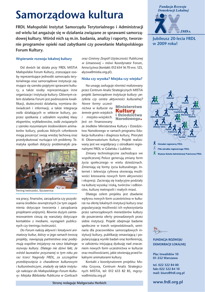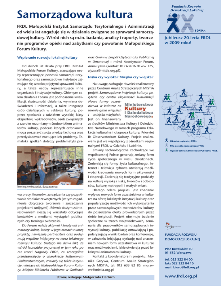 Samorządowa kultura FRDL Małopolski Instytut Samorządu Terytorialnego i Administracji od wielu lat angażuje się w działania związane ze sprawami samorządowej kultury. Wśród nich są m.in. badania, analizy i raporty, tworzenie programów opieki nad zabytkami czy powołanie Małopolskiego Forum Kultury. Wspieranie rozwoju lokalnej kultury Od dwóch lat działa przy FRDL MISTiA Małopolskie Forum Kultury, zrzeszające osoby reprezentujące jednostki samorządu terytorialnego oraz samorządowe instytucje zajmujące się szeroko pojętymi sprawami kultury, a także osoby reprezentujące inne organizacje i instytucje kultury. Głównym celem działania Forum jest podnoszenie kwalifikacji, skuteczności działania, wymiana doświadczeń i informacji, a także integracja osób działających w sektorze kultury, poprzez spotkania z udziałem wysokiej klasy ekspertów, wykładowców, osób związanych z szeroko rozumianym środowiskiem animatorów kultury, podczas których członkowie mogą poszerzyć swoją wiedzę fachową oraz przedyskutować nurtujące ich problemy. Tematyka spotkań dotyczy problematyki pra- Trening twórczości, Szczawnica wa pracy, finansów, zarządzania czy pozyskiwania środków zewnętrznych (w tym zagadnienia dotyczące tworzenia i zarządzania projektami unijnymi). Równie dużym zainteresowaniem cieszą się warsztaty dotyczące kontaktów z mediami, wystąpień publicznych czy treningu twórczości. Do Forum należą aktywni i kreatywni animatorzy kultur, którzy w jego ramach tworzą projekty, nawiązują partnerstwa oraz podejmują wspólne inicjatywy na rzecz lokalnego rozwoju kultury. Dlatego nie dziwi fakt, że wśród laureatów przyznanej w tym roku po raz trzeci Nagrody FRDL, za szczególne przedsięwzięcia o charakterze kulturowym i kulturotwórczym, znalazły się także instytucje należące do Małopolskiego Forum Kultury: Miejska Biblioteka Publiczna w Gorlicach Jubileusz 20-lecia FRDL w 2009 roku! oraz Gminny Zespół Użyteczności Publicznej w Limanowej – mówi Koordynator Forum, Anna Łyżwa (kontakt: 012 634 16 70 ww. 125, [email protected]). Niska czy wysoka? Miejska czy wiejska? Na uwagę zasługuje również realizowany przez Centrum Analiz Strategicznych MISTiA projekt Samorządowe instytucje kultury: peryferia czy centra aktywności kulturalnej? Nowe formy uczestnictwa w kulturze na terenie gmin wiejskich i miejsko-wiejskich. Jest on finansowany ze środków Ministerstwa Kultury i Dziedzictwa Narodowego w ramach programu Edukacja kulturalna i diagnoza kultury, Priorytet II: Obserwatorium Kultury. Projekt realizowany jest we współpracy z ośrodkami regionalnymi FRDL w Gdańsku i Lublinie. Zmiany technologiczne zachodzące we współczesnej Polsce generują zmiany form życia społecznego w wielu dziedzinach. Zmieniają się formy życia kulturalnego. Internet i telewizja cyfrowa otwierają możliwości kreowania nowych form aktywności i ekspresji. Zacierają się tradycyjne podziały na kulturę wysoką i niską, twórców i odbiorców, kulturę metropolii i małych miast. Dlatego celem projektu jest zbadanie wpływu nowych form uczestnictwa w kulturze na ofertę lokalnych instytucji kultury oraz popularyzację możliwości ich wykorzystania przez samorządowych menedżerów kultury do poszerzenia oferty prowadzonych przez siebie instytucji. Projekt obejmuje badanie społeczne w trzech województwach, seminaria dla pracowników samorządowych instytucji kultury, publikację omawiającą i popularyzującą wyniki badań oraz konferencję, w założeniu inicjującą dyskusję nad znaczeniem nowych form uczestnictwa w kulturze oraz możliwościami, jakie otwierają przed lokalnymi animatorami kultury. Kontakt z koordynatorem projektu: Monika Grzywa, Centrum Analiz Strategicznych MISTiA, tel: 012 633 82 85, [email protected] Stronę redaguje Małgorzata Herbich FUNDACJA ROZWOJU DEMOKRACJI LOKALNEJ Plac Inwalidów 10 01-552 Warszawa tel. 022 322 84 00 faks 022 322 84 10 mail: [email protected] www.frdl.org.pl