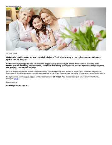 http://mojekgw.pl 20 maj 2016 Ostatnie dni konkursu na najpiękniejszy Tort dla Mamy - na zgłoszenia czekamy tylko do 29 maja! Codziennie spływają do nas smakowite zdjęcia przygotowanych przez Was tortów z okazji Dnia Matki! Już nie możemy się doczekać, kiedy opublikujemy je na portalu i sami będziecie mogli wybrać ten jedyny, ten najpiękniejszy! Jeszcze każdy tort może znaleźć się w finałowej 10-tce! Do wygrania jest m.in. wywiad z członkami zwycięskiej Organizacji, opublikowany na łamach kwartalnika "mojeKGW" oraz zestaw garnków ufundowany prze firmę Altom. Na zgłoszenia zawięrające zdjęcia tortów czekamy do 29 maja. Aby zapoznać się ze szczegółami konkursu, kliknijcie tutaj! Zapraszamy! Redakcja mojeKGW.pl ..