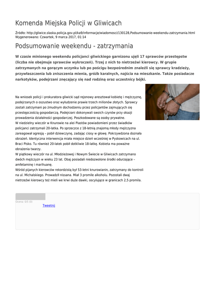 Komenda Miejska Policji w Gliwicach Źródło: http://gliwice.slaska.policja.gov.pl/ka9/informacje/wiadomosci/130128,Podsumowanie-weekendu-zatrzymania.html Wygenerowano: Czwartek, 9 marca 2017, 01:14 Podsumowanie weekendu - zatrzymania W czasie minionego weekendu policjanci gliwickiego garnizonu ujęli 17 sprawców przestępstw (liczba nie obejmuje sprawców wykroczeń). Trzej z nich to nietrzeźwi kierowcy. W grupie zatrzymanych na gorącym uczynku lub po pościgu bezpośrednim znaleźli się sprawcy kradzieży, przywłaszczenia lub zniszczenia mienia, gróźb karalnych, najścia na mieszkanie. Także posiadacze narkotyków, podejrzani znęcający się nad rodziną oraz uczestnicy bójki. Na wniosek policji i prokuratora gliwicki sąd rejonowy aresztował kobietę i mężczyznę, podejrzanych o oszustwo oraz wyłudzenie prawie trzech milionów złotych. Sprawcy zostali zatrzymani po żmudnym dochodzeniu przez policjantów zajmujących się przestępczością gospodarczą. Podejrzani dokonywali swoich czynów przy okazji prowadzenia działalności gospodarczej. Poszkodowane są osoby prywatne. W niedzielny wieczór w Knurowie na alei Piastów powiadomieni przez świadków policjanci zatrzymali 20-latka. Po sprzeczce z 18-letnią znajomą młody mężczyzna zareagował agresją – pobił dziewczynę, zadając ciosy w głowę. Pokrzywdzona doznała obrażeń. Identyczna interwencja miała miejsce dzień wcześniej w Pyskowicach na ul. Braci Pisko. Tu również 20-latek pobił dotkliwie 18-latkę. Kobieta ma poważne obrażenia twarzy. W piątkowy wieczór na ul. Młodzieżowej i Nowym Świecie w Gliwicach zatrzymano dwóch mężczyzn w wieku 23 lat. Obaj posiadali niedozwolone środki odurzające – amfetaminę i marihuanę. Wśród pijanych kierowców rekordzistą był 53-letni knurowianin, zatrzymany do kontroli na ul. Michalskiego. Prowadził nissana. Miał 3 promile alkoholu. Pozostali dwaj nietrzeźwi kierowcy też mieli we krwi duże dawki, oscylujące w granicach 2,5 promila. Ocena: 0/5 (0) Tweetnij