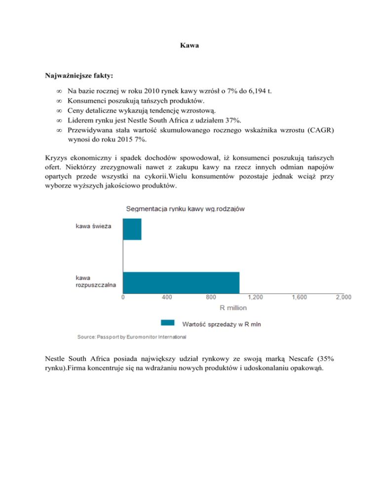 Kawa Najważniejsze fakty: • • • • • Na bazie rocznej w roku 2010 rynek kawy wzrósł o 7% do 6,194 t. Konsumenci poszukują tańszych produktów. Ceny detaliczne wykazują tendencję wzrostową. Liderem rynku jest Nestle South Africa z udziałem 37%. Przewidywana stała wartość skumulowanego rocznego wskaźnika wzrostu (CAGR) wynosi do roku 2015 7%. Kryzys ekonomiczny i spadek dochodów spowodował, iż konsumenci poszukują tańszych ofert. Niektórzy zrezygnowali nawet z zakupu kawy na rzecz innych odmian napojów opartych przede wszystki na cykorii.Wielu konsumentów pozostaje jednak wciąż przy wyborze wyższych jakościowo produktów. Nestle South Africa posiada największy udział rynkowy ze swoją marką Nescafe (35% rynku).Firma koncentruje się na wdrażaniu nowych produktów i udoskonalaniu opakowąń. Firmy i ich marki Nazwa firmy Marka Caturra Coffee Co Caturra (Caturra Coffee Co) Global Coffee Exports Importers (Pioneer Food Group Ltd), St Olivers (Pioneer Food Group Ltd) Kraft Foods Inc Jacobs (Kraft Foods Inc) Michielsons (Pty) Ltd Douwe Egberts (Sara Lee Corp) National Brands Ltd Ciro (AVI Ltd), House of Coffees (AVI Ltd), Kenna (AVI Ltd) Nestlé South Africa (Pty) Ltd Nescafé (Nestlé SA) Prognoza: Przewiduje się, iż bardziej zamożni konsumenci poszukiwać będą odmian premium. Rosnąć będzie także rynek kawy ekologicznej (organic) a także koncentratów porcjowanych. Żródło: Euromonitor International Kurs na dzień 15.10.2012 : 1 USD = 8,70 R Oprac.: WPHI Johannesburg