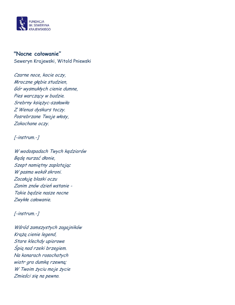 "Nocne całowanie” Seweryn Krajewski, Witold Pniewski Czarne noce, kocie oczy, Mroczne głębie studzien, Gór wysmukłych cienie dumne, Pies warczący w budzie. Srebrny księżyc-szaławiła Z Wenus dyskurs toczy. Posrebrzane Twoje włosy, Zakochane oczy. [-instrum.-] W wodospadach Twych kędziorów Będę nurzać dłonie, Szept namiętny zaplatając W pasma wokół skroni. Zacałuję blaski oczu Zanim znów dzień wstanie Takie będzie nasze nocne Zwykłe całowanie. [-instrum.-] Wśród zamszystych zagajników Krążą cienie legend, Stare klechdy upiorowe Śpią nad rzeki brzegiem. Na konarach rosochatych wiatr gra dumkę rzewną; W Twoim życiu moje życie Zmieści się na pewno. [-instrum.-]