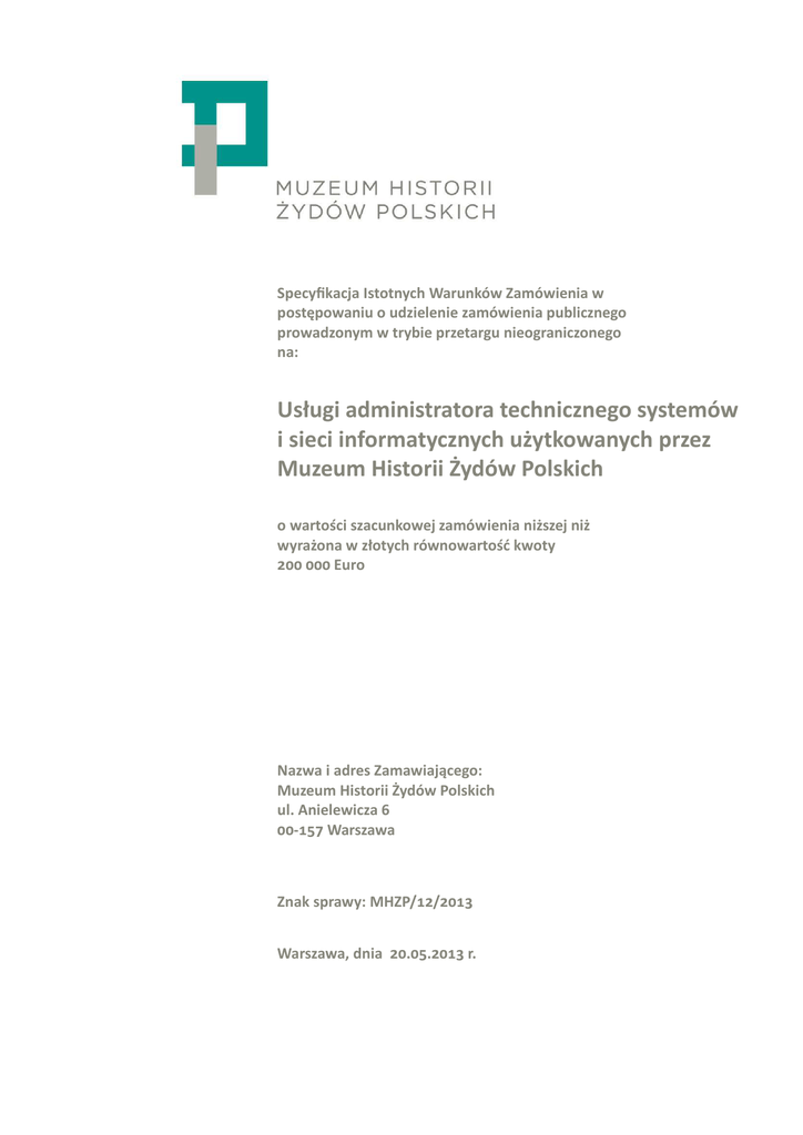 Specyfikacja Istotnych Warunków Zamówienia w postępowaniu o udzielenie zamówienia publicznego prowadzonym w trybie przetargu nieograniczonego na: Usługi administratora technicznego systemów i sieci informatycznych użytkowanych przez Muzeum Historii Żydów Polskich o wartości szacunkowej zamówienia niższej niż wyrażona w złotych równowartość kwoty *++ +++ Euro Nazwa i adres Zamawiającego: Muzeum Historii Żydów Polskich ul. Anielewicza 1 ++-345 Warszawa Znak sprawy: MHZP/3*/*+37 Warszawa, dnia *+.+4.*+37 r. Rozdział 3 Informacje ogólne . 2. 0. 3. ". Zamawiającym jest Muzeum Historii Żydów Polskich z siedzibą w Warszawie ( - "#) przy ul. Anielewicza (, wpisane do rejestru instytucji kultury prowadzonego przez miasto stołeczne Warszawę pod numerem IKM/0/ ", posiadające NIP "2"-203-##-24 i Regon 3 0 0#(2, zwane dalej „Zamawiającym”. Dane teleadresowe Zamawiającego: a. adres do korespondencji: ul. Anielewicza (, - "# Warszawa; b. numer telefonu: 22 3# 0 "0; c. numer faksu: 22 402 2 30; d. adres poczty e-mail: [email protected]; e. strona internetowa: www.jewishmuseum.org.pl Godziny pracy Zamawiającego: od poniedziałku do piątku (z wyłączeniem dni ustawowo wolnych od pracy) w godzinach od >: do #: . Postępowanie o udzielenie zamówienia publicznego prowadzone jest w trybie przetargu nieograniczonego na podstawie przepisów ustawy z dnia 2> stycznia 2 3 roku – Prawo zamówień publicznych (tj. Dz. U. z 2 r. Nr 0, poz. #">, z późn. zm.), na podstawie aktów wykonawczych do ustawy oraz w oparciu o postanowienia niniejszej Specyfikacji Istotnych Warunków Zamówienia, zwanej dalej „SIWZ”. Postępowanie prowadzone jest w języku polskim. Ogłoszenie o zamówieniu zostanie zamieszczone: a. w Biuletynie Zamówień Publicznych udostępnianym na stronach portalu internetowego Urzędu Zamówień Publicznych; b. w Biuletynie Zamówień Publicznych Urzędu m.st. Warszawy; c. na stronie internetowej Zamawiającego: www.jewishmuseum.org.pl; d. na tablicy ogłoszeń w siedzibie Zamawiającego. Rozdział * Opis przedmiotu zamówienia . 2. 0. Przedmiotem zamówienia są Usługi administratora technicznego systemów i sieci informatycznych użytkowanych przez Muzeum Historii Żydów Polskich. Szczegółowy opis przedmiotu zamówienia zawarty jest w dokumencie: Załącznik do SIWZ. Wspólny Słownik Zamówień (CPV): #2 -" Usługi informatyczne: konsultacyjne, opracowywania oprogramowania, internetowe i wsparcia. Rozdział 7 Informacje dodatkowe . 2. 0. Zamawiający nie dopuszcza składania ofert częściowych. Zamawiający nie dopuszcza składania ofert wariantowych. Zamawiający nie przewiduje zawarcia umowy ramowej. 3. ". (. #. 4. >. Zamawiający przewiduje możliwość udzielenia zamówień uzupełniających, o których mowa w art. (# ust. pkt ( ustawy, stanowiących nie więcej niż 3 % wartości zamówienia podstawowego i polegających na powtórzeniu tego samego rodzaju zamówień. Zamawiający nie przewiduje przeprowadzenia aukcji elektronicznej. Zamawiający nie przewiduje udzielania zaliczek na poczet wykonania zamówienia. Zamawiający nie przewiduje zwrotu kosztów udziału wykonawców w postępowaniu o udzielenie zamówienia, z zastrzeżeniem postanowień art. >0 ust. 3 ustawy. Zamawiający nie ogranicza możliwości ubiegania się o zamówienie publiczne tylko dla wykonawców, u których ponad " % pracowników stanowią osoby niepełnosprawne. Na podstawie art. 0( ust. 3 ustawy wykonawca jest zobowiązany umieścić w składanej ofercie informację o części zamówienia, którą zamierza powierzyć podwykonawcom. Zamawiający nie zastrzega żadnej części zamówienia, która nie może być powierzona podwykonawcom. Rozdział ; Termin wykonania zamówienia Wymagany termin realizacji zamówienia: 2 miesięcy od dnia zawarcia umowy. Rozdział 4 Warunki udziału w postępowaniu oraz opis sposobu dokonywania oceny spełniania tych warunków . O udzielenie zamówienia mogą się ubiegać wykonawcy, którzy spełniają warunki dotyczące: a. posiadania uprawnień do wykonywania określonej działalności lub czynności, jeżeli przepisy prawa nakładają obowiązek ich posiadania – Zamawiający nie wyznacza szczegółowego warunku w tym zakresie; b. posiadania wiedzy i doświadczenia – w celu potwierdzenia spełnienia warunku Wykonawca musi wykazać, że w okresie ostatnich trzech lat przed upływem terminu składania ofert, a jeżeli okres prowadzenia działalności jest krótszy – w tym okresie, wykonał, a w przypadku świadczeń okresowych lub ciągłych również wykonuje należycie, co najmniej jedną usługę odpowiadającą swoim rodzajem przedmiotowi zamówienia, tj. polegającą na obsłudze administracyjnej infrastruktury centralnej IT o wartości nie mniejszej niż " , zł bruNo każda (usługa wykonana w ramach jednej umowy); c. dysponowania odpowiednim potencjałem technicznym oraz osobami zdolnymi do wykonania zamówienia – w celu potwierdzenia spełnienia warunku Wykonawca zobowiązany jest wykazać, iż dysponuje osobami zdolnymi do wykonania zamówienia, które łącznie spełniają następujące wymagania: − posiadają poniższe kwalifikacje: tytuł MicrosoO CerPfied Professional, tytuł MicrosoO CerPfied Technology Specialist, tytuł Windows Server VirtualizaPon, ConfiguraPon, certyfikat firmy Leviton z zakresu uprawnień do projektowania, wykonywania instalacji, serwisowania oraz nadzoru wymaganego do objęcia instalacji 2"-letnim Programem Rozszerzonej Gwarancji Leviton, certyfikat CCTT firmy Fluke Networks lub równoważny potwierdzający praktyczne umiejętności posiadacza w zakresie diagnostyki i certyfikacji okablowania strukturalnego, znajomość języka angielskiego branży technicznej − posiadają odpowiedni zakres wiedzy technicznej pozwalający na wykonywanie obowiązków określonych w Załączniku do SIWZ oraz doświadczenie obejmujące: administrację: systemami Windows Server 2 4 R2 i 2 2 w środowiskach fizy