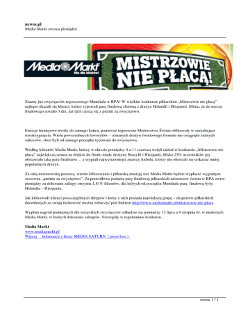newss.pl Media Markt zwraca pieniądze Znamy już zwycięzców tegorocznego Mundialu w RPA! W wielkim konkursie piłkarskim „Mistrzowie nie płacą” najlepsi okazali się klienci, którzy typowali parę finałową złożoną z drużyn Holandii i Hiszpanii. Mimo, że do meczu finałowego zostało 3 dni, już dziś cieszą się z premii za zwycięstwo. Emocje turniejowe trwały do samego końca, ponieważ tegoroczne Mistrzostwa Świata obfitowały w zaskakujące rozstrzygnięcia. Wielu powszechnych faworytów – uznanych drużyn światowego formatu nie osiągnęło żadnych sukcesów, choć byli od samego początku typowani do zwycięstwa. Według klientów Media Markt, którzy w okresie pomiędzy 4 a 11 czerwca wzięli udział w konkursie „Mistrzowie nie płacą” największą szansę na dojście do finału miały drużyny Brazylii i Hiszpanii, blisko 25% uczestników gry obstawiało taką parę finalistów… a wygrali najwytrawniejsi znawcy futbolu, którzy nie obawiali się wskazać mniej popularnych drużyn. Za taką mistrzowską postawę, wierne kibicowanie i piłkarską intuicję sieć Media Markt będzie wypłacać wygranym stosowne „premie za zwycięstwo”. Za prawidłowe podanie pary finałowej piłkarskich mistrzostw świata w RPA zwrot pieniędzy za dokonane zakupy otrzyma 1,81% klientów, dla których od początku Mundialu parą finałową były: Holandia – Hiszpania. Jak kibicowali klienci poszczególnych sklepów i który z nich posiada największą grupę – ekspertów piłkarskich docenionych za swoją fachowość można zobaczyć pod linkiem http://www.mediamarkt.pl/mistrzowie-nie-placa . Wypłata nagród pieniężnych dla wszystkich zwycięzców odbędzie się pomiędzy 12 lipca a 9 sierpnia br. w marketach Media Markt, w których dokonano zakupów. Szczegóły w regulaminie konkursu. Media Markt www.mediamarkt.pl Więcej informacji z firmy MEDIA SATURN ( press box ) strona 1 / 1