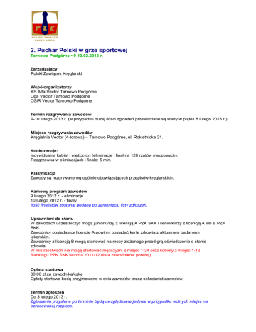 2. Puchar Polski w grze sportowej Tarnowo Podgórne • 9-10.02.2013 r. Zarządzający Polski Zawiązek Kręglarski Współorganizatorzy KS Alfa-Vector Tarnowo Podgórne Liga Vector Tarnowo Podgórne OSiR Vector Tarnowo Podgórne Termin rozgrywania zawodów 9-10 lutego 2013 r. (w przypadku dużej ilości zgłoszeń przewidziane są starty w piątek 8 lutego 2013 r.). Miejsce rozgrywania zawodów Kręgielnia Vector (4-torowa) – Tarnowo Podgórne, ul. Rokietnicka 21. Konkurencje: Indywidualna kobiet i mężczyzn (eliminacje i finał na 120 rzutów meczowych). Rozgrzewka w eliminacjach i finale: 5 min. Klasyfikacja Zawody są rozgrywane wg ogólnie obowiązujących przepisów kręglarskich. Ramowy program zawodów 9 lutego 2012 r. - eliminacje 10 lutego 2012 r. - finały Ilość finalistów zostanie podana po zamknięciu listy zgłoszeń. Uprawnieni do startu W zawodach uczestniczyć mogą juniorki/rzy z licencją A PZK SKK i seniorki/rzy z licencją A lub B PZK SKK. Zawodnicy posiadający licencję A powinni posiadać kartę zdrowia z aktualnym badaniem lekarskim. Zawodnicy z licencją B mogą startować na mocy złożonego przed grą oświadczenia o stanie zdrowia. W mistrzostwach nie mogą startować mężczyźni z miejsc 1-24 oraz kobiety z miejsc 1-12 Rankingu PZK SKK sezonu 2011/12 (lista zawodników poniżej). Opłata startowa 30,00 zł za zawodnika/czkę Opłaty startowe będą przyjmowane w dniu zawodów przez sekretariat zawodów. Termin zgłoszeń Do 3 lutego 2013 r. Zgłoszenia przysłane po terminie będą uwzględniane jedynie w przypadku wolnych miejsc na opracowanej rozpisce. Kontakt do zgłoszeń Imiennych zgłoszeń można dokonywać telefonicznie lub drogą mailową: e-mail: [email protected] tel. 605 318 918 (Jarosław Bonk) Termin ogłoszenia szczegółowego planu startów: 4 lutego 2013 r. do godz. 20.00 Sędziowie: Sędzia Główny - Bronisław Bednarek (klasa państwowa). Komisja Sędziowska wyznaczona będzie przez Kolegium Sędziów PZK SKK. Sprawy sporne Wszystkie sporne sytuacje rozstrzyga Sędzia Główny zawodów. Nagrody: 1 m. 300 zł, puchar, dyplom 2 m. 200 zł, puchar, dyplom 3 m. 100 zł, puchar, dyplom 4-6 m. - upominek, dyplom Sprawy techniczne i kosmetyka torów: Zawodnicy zobowiązani są do zgłoszenia się u Sędziego Głównego w stroju sportowym najpóźniej 20 min. przed startem. Zawodnik, który nie zgłosi się u sędziego głównego zawodów na 20 minut przed wyznaczoną godziną startu nie będzie mógł startować o innej porze bez względu na okoliczności (wolny tor itp.). Organizatorzy w przypadku wolnych torów zastrzegają sobie możliwość przyspieszenia startu zawodników rozpisanych na późniejsze bloki. Szachownice pryskane siliconem co 4 bloki w eliminacjach. Szachownice pryskane siliconem przed 5 blokiem w finale. Informacje: Wiadomości o turnieju ukażą się w internecie, w lokalnych mediach a także w formie plakatów. Wyniki turnieju będę publikowane live po każdym bloku w internecie oraz na kręgielni. Adresy stron internetowych: www.puchar.pzkregl.pl www.kregle.net Noclegi: Współorganizatorzy nie pośredniczą w rezerwacji noclegów Adresy miejsc noclegowych w Tarnowie Podgórnym: OSiR - Tarnowo Podgórne, ul. Nowa 15, tel. 61 816 60 86 Motel ONYKS - Tarnowo Podgórne, ul. Owocowa 18, tel. 61 816 46 75 Hotel VECTOR - Tarnowo Podgórne, ul. Rokietnicka 21, tel. 61 816 41 78 LISTA ZAWODNIKÓW NIEUPRAWNIONYCH DO GRY W MISTRZOSTWACH KOBIETY M-ce Nazw is ko i Im ię Klub 1 Lajtke Joanna KS Polonia 1912 Leszno 2 Orłow ska Dorota TKKF Dębinki Gdańsk 3 Neczyńska Joanna Wielkopolski OZK 4 Leopold Małgorzata KS Alfa-Vector Tarnow o Podgórne 5 Konopa Kinga KS Polonia 1912 Leszno 6 Marażew ska Monika KS Polonia 1912 Leszno 7 Runka Justyna MLKS Tucholanka Tuchola 8 Chw astyniak Anna KS Polonia 1912 Leszno 9 Torka Izabela KS Alfa-Vector Tarnow o Podgórne 10 Włodarczyk Beata KS Polonia 1912 Leszno 11 Bonk Joanna KS Alfa-Vector Tarnow o Podgórne 12 Serw ińska Karolina TKKF Dębinki Gdańsk MĘŻCZYŹNI M -ce Nazw isko i im ię Klub 1 Dutkiew icz Włodzimierz KS Start Gostyń 2 Śliw iński Tadeusz KS Pilica Tomaszów Mazow iecki 3 Strzelczak Daw id KS Alfa-Vector Tarnow o Podgórne 4 Osiew icz Jakub KS Start Gostyń 5 Szulc Adrian KS Polonia 1912 Leszno 6 Konopka Mikołaj KS Polonia 1912 Leszno 7 Grzesiak Marcin KS Alfa-Vector Tarnow o Podgórne 8 Torka Leszek KS Alfa-Vector Tarnow o Podgórne 9 Kieliba Piotr TKKF Platan Pleszew 10 Włodarczyk Bartosz KS Polonia 1912 Leszno 11 Bonk Jarosław KS Alfa-Vector Tarnow o Podgórne 12 Dębicki Michał KS Pilica Tomaszów Mazow iecki 13 Mocarski Konrad KS Pilica Tomaszów Mazow iecki 14 Piosik Sebastian KS Polonia 1912 Leszno 15 Soból Krzysztof TKKF Sokół Brzesko 16 Masłow ski Tomasz KS Alfa-Vector Tarnow o Podgórne 17 Maćkow iak Jarosław KS Czarna Kula Poznań 18 Przytarski Jarosław MLKS Tucholanka Tuchola 19 Stachow iak Piotr KS Start Gostyń 20 Mendyka Piotr KS Start Gostyń 21 Kląskała Maciej KK Dziew iątka Wronki 22 Stachecki Arkadiusz KS Zatoka Puck 23 Witek Maciej KS Pilica Tomaszów Mazow iecki 24 Katarzyński Piotr KS Start Gostyń Powyższe informacje i regulamin zatwierdziło Prezydium PZK SKK dnia 16.01.2013 r. W imieniu organizatorów Jarosław Bonk KS Alfa-Vector Tarnowo Podgórne