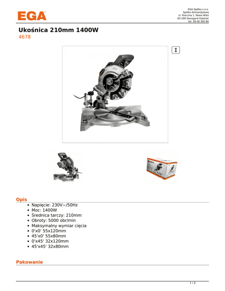 EGA Spółka z o.o. Spółka Komandytowa ul. Rzeczna 1, Nowa Wieś 83-200 Starogard Gdański tel. 58 56 300 80 Ukośnica 210mm 1400W 4678 Opis Napięcie: 230V~/50Hz Moc: 1400W Średnica tarczy: 210mm Obroty: 5000 obr/min Maksymalny wymiar cięcia 0'x0' 55x120mm 45'x0' 55x80mm 0'x45' 32x120mm 45'x45' 32x80mm Pakowanie 1/2 EGA Spółka z o.o. Spółka Komandytowa ul. Rzeczna 1, Nowa Wieś 83-200 Starogard Gdański tel. 58 56 300 80 Jednostkowe Karton: 1 szt. Warianty Lp. Nr katalogowy 1 4678 EAN 2/2 Powered by TCPDF (www.tcpdf.org)