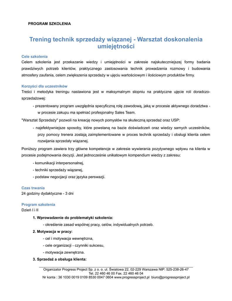PROGRAM SZKOLENIA Trening technik sprzedaży wiązanej - Warsztat doskonalenia umiejętności Cele szkolenia Celem szkolenia jest przekazanie wiedzy i umiejętności w zakresie najskuteczniejszej formy badania prawdziwych potrzeb kilentów, praktycznego zastosowania technik prowadzenia rozmowy i budowania atmosfery zaufania, celem zwiększenia sprzedaży w ujęciu wartościowym i ilościowym produktów firmy. Korzyści dla uczestników Treści i metodyka treningu nastawiona jest w maksymalnym stopniu na praktyczne ujęcie roli doradczosprzedażowej: - prezentowany program uwzględnia specyficzną rolę zawodową, jaką w procesie aktywnego doradztwa w procesie zakupu ma spełniać profesjonalny Sales Team. "Warsztat Sprzedaży" pozwoli na kreację nowych pomysłów na skuteczną sprzedaż oraz USP: - najefektywniejsze sposoby, które powstaną na bazie doświadczeń oraz wiedzy samych uczestników, przy pomocy trenera zostają zaimplementowane w proces technik sprzedaży i obsługi klienta celem rozwijania sprzedały wiązanej. Poniższy program zawiera trzy główne kompetencje w zakresie wywierania pozytywnego wpływu na klienta w procesie podejmowania decyzji. Jest jednocześnie unikatowym kompendium wiedzy z zakresu: - komunikacji interpersonalnej, - techniki sprzedaży wiązanej, - podstaw negocjacji oraz języka perswazji. Czas trwania 24 godziny dydaktyczne - 3 dni Program szkolenia Dzień I i II 1. Wprowadzenie do problematyki szkolenia: - określenie zasad wspólnej pracy, celów, indywidualnych potrzeb. 2. Motywacja w pracy: - cel i motywacja wewnętrzna, - cele organizacji - czynniki sukcesu, - motywacja zewnętrzna. 3. Sprzedaż a obsługa klienta: _________________________________________________________________________________ Organizator Progress Project Sp. z o. o. ul. Światowa 22, 02-229 Warszawa NIP: 525-238-26-47 Tel. 22 460 46 00 Fax. 22 460 46 04 Nr konta : 36 1030 0019 0109 8530 0047 0604 www.progressproject.pl [email protected] PROGRAM SZKOLENIA - co nie jest sprzedażą? - charakterystyka profesjonalnego procesu sprzedaży, - fazy procesu sprzedaży oraz obsługi klienta. 4. Komunikacja interpersonalna w procesie sprzedaży: - model komunikacji wg A.Mehrabiana, - znaczenie komunikacji interpersonalnej w sprzedaży, - warunki efektywnej komunikacji, - znaczenie umiejętności słuchania w sprzedaży, - techniki "dopasowania" i "prowadzenia" w komunikacji. 5. Analiza konkurencji: - kto i jak działa? - obszary konkurencji, - wpływ na nas, - wpływ na klienta. 6. Sprzedaż i techniki wiązania transakcji: - przygotowanie się do rozmowy z klientem, - nawiązanie pierwszego kontaktu, - rozpoznawanie potrzeb, - prezentacja rozwiązania, - radzenie sobie z zastrzeżeniami klientów, - zamykanie procesu sprzedaży, - obsługa posprzedażowa. 7. Techniki perswazji oraz podstawy procesu negocjacyjnego: - rola procesów negocjacyjnych w sprzedaży wiązanej, - jak wykorzystywać techniki kotwiczenia emocji? - sposoby myślenia innych ludzi - jak funkcjonują metaprogramy oraz ich zastosowanie w sprzedaży, - język wpływu i perswazji w procesie wiązania transakcji. 8. Zajęcia warsztatowe w oparciu o przygotowane studium przypadku: - praca z kamerą, analiza scenek, korekty indywidualne. Dzień III - Praktyczny trening 1. Cele realizacji: - diagnoza efektów pracy uczestników po szkoleniu oraz ocena implementacji nauczonych technik w praktyce, _________________________________________________________________________________ Organizator Progress Project Sp. z o. o. ul. Światowa 22, 02-229 Warszawa NIP: 525-238-26-47 Tel. 22 460 46 00 Fax. 22 460 46 04 Nr konta : 36 1030 0019 0109 8530 0047 0604 www.progressproject.pl [email protected] PROGRAM SZKOLENIA - wspólna analiza przeprowadzonych "na gorąco" procesów obsługi klienta oraz sprzedaży wiązanej - analiza błędów i bieżąca korekta, - korekta/modelowanie zachowań uczestników w realnych warunkach. 2. Efekty treningu: - poszerzenie repertuaru kompetencji zawodowych uczestników przy jednoczesnym, silnym ugruntowaniu ich wewnętrznej motywacji do pracy i wiary we własne możliwości. Harmonogram Harmonogram Rejestracja uczestników Zajęcia Przerwa Zajęcia Obiad Zajęcia Przerwa Zajęcia Dzień 1 9:45 - 10:00 Dzień 2 Dzień 3 10:00 - 11:00 11:00 - 11:15 11:15 - 13:00 13:00 - 13:45 13:45 - 15:00 15:00 - 15:10 15:10 - 17:00 9:00 - 11:00 11:00 - 11:15 11:15 - 13:00 13:00 - 13:45 13:45 - 15:00 15:00 - 15:10 15:10 - 16:00 9:00 - 11:00 11:00 - 11:15 11:15 - 13:00 13:00 - 13:45 13:45 - 15:00 15:00 - 15:10 15:10 - 16:00 Koszt inwestycji W celu poznania szczegółów, zapraszamy do kontaktu. Informacje dodatkowe W przypadku zainteresowania jednym szkoleniem większej liczby osób (powyżej 3-4) z jednej firmy jesteśmy w stanie zorganizować dodatkowe terminy w dogodnej lokalizacji przy założeniu, że szkolenie będzie zaplanowane z co najmniej półtora miesięcznym wyprzedzeniem. Każdy temat możemy również przygotować według Państwa wymagań oraz potrzeb firmy w formie szkolenia dedykowanego, wyjazdu integracyjnego lub doradztwa. Zapraszamy do kontaktu, Progress Project sp. z o.o. ul. Światowa 22 02-229 Warszawa Tel. 22 460 46 00 Fax. 22 460 46 04 e-mail: [email protected] www.progressproject.pl _________________________________________________________________________________ Organizator Progress Project Sp. z o. o. ul. Światowa 22, 02-229 Warszawa NIP: 525-238-26-47 Tel. 22 460 46 00 Fax. 22 460 46 04 Nr konta : 36 1030 0019 0109 8530 0047 0604 www.progressproject.pl [email protected]