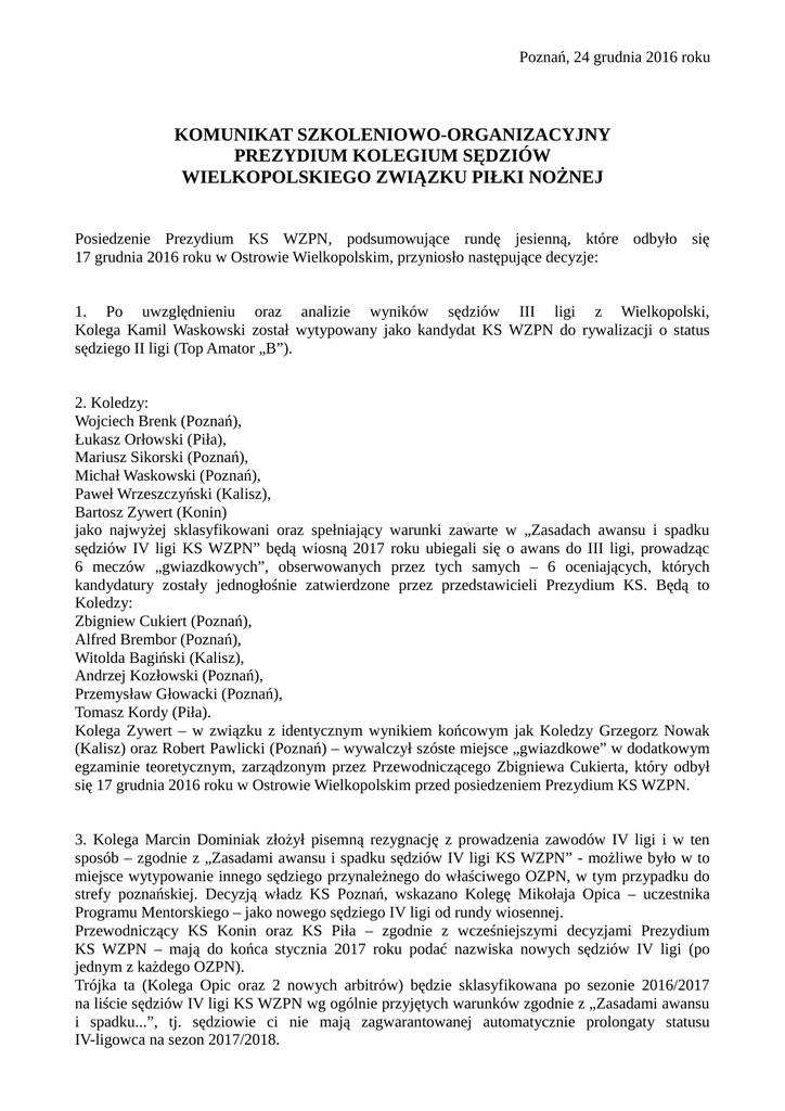 Poznań, 24 grudnia 2016 roku KOMUNIKAT SZKOLENIOWO-ORGANIZACYJNY PREZYDIUM KOLEGIUM SĘDZIÓW WIELKOPOLSKIEGO ZWIĄZKU PIŁKI NOŻNEJ Posiedzenie Prezydium KS WZPN, podsumowujące rundę jesienną, które odbyło się 17 grudnia 2016 roku w Ostrowie Wielkopolskim, przyniosło następujące decyzje: 1. Po uwzględnieniu oraz analizie wyników sędziów III ligi z Wielkopolski, Kolega Kamil Waskowski został wytypowany jako kandydat KS WZPN do rywalizacji o status sędziego II ligi (Top Amator „B”). 2. Koledzy: Wojciech Brenk (Poznań), Łukasz Orłowski (Piła), Mariusz Sikorski (Poznań), Michał Waskowski (Poznań), Paweł Wrzeszczyński (Kalisz), Bartosz Zywert (Konin) jako najwyżej sklasyfikowani oraz spełniający warunki zawarte w „Zasadach awansu i spadku sędziów IV ligi KS WZPN” będą wiosną 2017 roku ubiegali się o awans do III ligi, prowadząc 6 meczów „gwiazdkowych”, obserwowanych przez tych samych – 6 oceniających, których kandydatury zostały jednogłośnie zatwierdzone przez przedstawicieli Prezydium KS. Będą to Koledzy: Zbigniew Cukiert (Poznań), Alfred Brembor (Poznań), Witolda Bagiński (Kalisz), Andrzej Kozłowski (Poznań), Przemysław Głowacki (Poznań), Tomasz Kordy (Piła). Kolega Zywert – w związku z identycznym wynikiem końcowym jak Koledzy Grzegorz Nowak (Kalisz) oraz Robert Pawlicki (Poznań) – wywalczył szóste miejsce „gwiazdkowe” w dodatkowym egzaminie teoretycznym, zarządzonym przez Przewodniczącego Zbigniewa Cukierta, który odbył się 17 grudnia 2016 roku w Ostrowie Wielkopolskim przed posiedzeniem Prezydium KS WZPN. 3. Kolega Marcin Dominiak złożył pisemną rezygnację z prowadzenia zawodów IV ligi i w ten sposób – zgodnie z „Zasadami awansu i spadku sędziów IV ligi KS WZPN” - możliwe było w to miejsce wytypowanie innego sędziego przynależnego do właściwego OZPN, w tym przypadku do strefy poznańskiej. Decyzją władz KS Poznań, wskazano Kolegę Mikołaja Opica – uczestnika Programu Mentorskiego – jako nowego sędziego IV ligi od rundy wiosennej. Przewodniczący KS Konin oraz KS Piła – zgodnie z wcześniejszymi decyzjami Prezydium KS WZPN – mają do końca stycznia 2017 roku podać nazwiska nowych sędziów IV ligi (po jednym z każdego OZPN). Trójka ta (Kolega Opic oraz 2 nowych arbitrów) będzie sklasyfikowana po sezonie 2016/2017 na liście sędziów IV ligi KS WZPN wg ogólnie przyjętych warunków zgodnie z „Zasadami awansu i spadku...”, tj. sędziowie ci nie mają zagwarantowanej automatycznie prolongaty statusu IV-ligowca na sezon 2017/2018. 4. Kolega Maciej Cebulski – zgodnie z „Zasadami awansu i spadku sędziów IV ligi KS WZPN” oraz zaleceniami KS PZPN i trendami ogólnopolskimi - jako asystent szczebla centralnego został włączony w poczet sędziów IV ligi. 5. Uzgodniono, że egzaminy sędziów IV ligi KS WZPN odbędą się dnia 11 marca 2017 roku (sobota) w Poznaniu. Szczegóły organizacyjne (dokładne miejsce, harmonogram godzinowy itd.) zostaną opublikowane bliżej tego terminu. 6. Wypracowano schemat postępowania w przypadku potrzeby odwołania się sędziów od uwag oraz ocen zawartych w arkuszach obserwacji z zawodów IV ligi. Odwołanie należy przesłać w formie mailowej w nieprzekraczalnym terminie do 7 dni - od otrzymania taką samą drogą arkusza obserwacji - równolegle na 2 adresy: [email protected] oraz [email protected] 7. Prezydium ustaliło również, że do ewidencji meczów zaliczane będą wszystkie mecze futsalu pod oficjalnymi auspicjami Polskiego Związku Piłki Nożnej. Wyrażono potrzebę odpowiedniej współpracy oraz komunikacji na partnerskich, przyjaznych zasadach między sędziami futsalu a referentami obsady w poszczególnych OZPN-ach, zwłaszcza w zakresie dyspozycyjności arbitrów halowych z uwagi na ich centralne wyznaczenia futsalowe. Zbigniew Cukiert Szymon Lizak Przewodniczący Kolegium Sędziów Wielkopolskiego Związku Piłki Nożnej Przewodniczący Komisji Szkoleniowej Kolegium Sędziów Wielkopolskiego Związku Piłki Nożnej