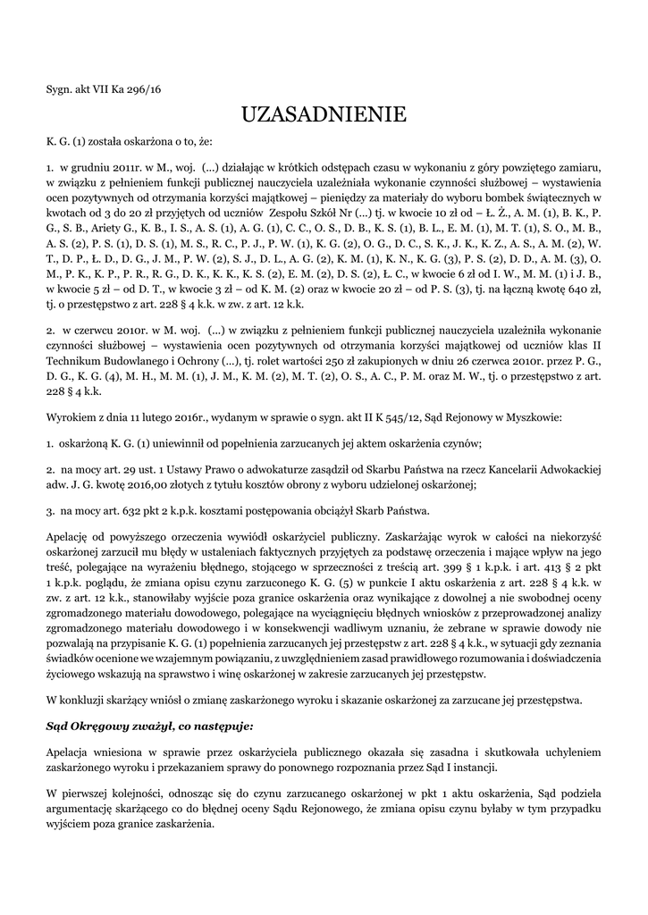 Sygn. akt VII Ka 296/16 UZASADNIENIE K. G. (1) została oskarżona o to, że: 1. w grudniu 2011r. w M., woj. (...) działając w krótkich odstępach czasu w wykonaniu z góry powziętego zamiaru, w związku z pełnieniem funkcji publicznej nauczyciela uzależniała wykonanie czynności służbowej – wystawienia ocen pozytywnych od otrzymania korzyści majątkowej – pieniędzy za materiały do wyboru bombek świątecznych w kwotach od 3 do 20 zł przyjętych od uczniów Zespołu Szkół Nr (...) tj. w kwocie 10 zł od – Ł. Ż., A. M. (1), B. K., P. G., S. B., Ariety G., K. B., I. S., A. S. (1), A. G. (1), C. C., O. S., D. B., K. S. (1), B. L., E. M. (1), M. T. (1), S. O., M. B., A. S. (2), P. S. (1), D. S. (1), M. S., R. C., P. J., P. W. (1), K. G. (2), O. G., D. C., S. K., J. K., K. Z., A. S., A. M. (2), W. T., D. P., Ł. D., D. G., J. M., P. W. (2), S. J., D. L., A. G. (2), K. M. (1), K. N., K. G. (3), P. S. (2), D. D., A. M. (3), O. M., P. K., K. P., P. R., R. G., D. K., K. K., K. S. (2), E. M. (2), D. S. (2), Ł. C., w kwocie 6 zł od I. W., M. M. (1) i J. B., w kwocie 5 zł – od D. T., w kwocie 3 zł – od K. M. (2) oraz w kwocie 20 zł – od P. S. (3), tj. na łączną kwotę 640 zł, tj. o przestępstwo z art. 228 § 4 k.k. w zw. z art. 12 k.k. 2. w czerwcu 2010r. w M. woj. (...) w związku z pełnieniem funkcji publicznej nauczyciela uzależniła wykonanie czynności służbowej – wystawienia ocen pozytywnych od otrzymania korzyści majątkowej od uczniów klas II Technikum Budowlanego i Ochrony (...), tj. rolet wartości 250 zł zakupionych w dniu 26 czerwca 2010r. przez P. G., D. G., K. G. (4), M. H., M. M. (1), J. M., K. M. (2), M. T. (2), O. S., A. C., P. M. oraz M. W., tj. o przestępstwo z art. 228 § 4 k.k. Wyrokiem z dnia 11 lutego 2016r., wydanym w sprawie o sygn. akt II K 545/12, Sąd Rejonowy w Myszkowie: 1. oskarżoną K. G. (1) uniewinnił od popełnienia zarzucanych jej aktem oskarżenia czynów; 2. na mocy art. 29 ust. 1 Ustawy Prawo o adwokaturze zasądził od Skarbu Państwa na rzecz Kancelarii Adwokackiej adw. J. G. kwotę 2016,00 złotych z tytułu kosztów obrony z wyboru udzielonej oskarżonej; 3. na mocy art. 632 pkt 2 k.p.k. kosztami postępowania obciążył Skarb Państwa. Apelację od powyższego orzeczenia wywiódł oskarżyciel publiczny. Zaskarżając wyrok w całości na niekorzyść oskarżonej zarzucił mu błędy w ustaleniach faktycznych przyjętych za podstawę orzeczenia i mające wpływ na jego treść, polegające na wyrażeniu błędnego, stojącego w sprzeczności z treścią art. 399 § 1 k.p.k. i art. 413 § 2 pkt 1 k.p.k. poglądu, że zmiana opisu czynu zarzuconego K. G. (5) w punkcie I aktu oskarżenia z art. 228 § 4 k.k. w zw. z art. 12 k.k., stanowiłaby wyjście poza granice oskarżenia oraz wynikające z dowolnej a nie swobodnej oceny zgromadzonego materiału dowodowego, polegające na wyciągnięciu błędnych wniosków z przeprowadzonej analizy zgromadzonego materiału dowodowego i w konsekwencji wadliwym uznaniu, że zebrane w sprawie dowody nie pozwalają na przypisanie K. G. (1) popełnienia zarzucanych jej przestępstw z art. 228 § 4 k.k., w sytuacji gdy zeznania świadków ocenione we wzajemnym powiązaniu, z uwzględnieniem zasad prawidłowego rozumowania i doświadczenia życiowego wskazują na sprawstwo i winę oskarżonej w zakresie zarzucanych jej przestępstw. W konkluzji skarżący wniósł o zmianę zaskarżonego wyroku i skazanie oskarżonej za zarzucane jej przestępstwa. Sąd Okręgowy zważył, co następuje: Apelacja wniesiona w sprawie przez oskarżyciela publicznego okazała się zasadna i skutkowała uchyleniem zaskarżonego wyroku i przekazaniem sprawy do ponownego rozpoznania przez Sąd I instancji. W pierwszej kolejności, odnosząc się do czynu zarzucanego oskarżonej w pkt 1 aktu oskarżenia, Sąd podziela argumentację skarżącego co do błędnej oceny Sądu Rejonowego, że zmiana opisu czynu byłaby w tym przypadku wyjściem poza granice zaskarżenia. Należy zaznaczyć, że Sąd Rejonowy dokonał prawidłowych ustaleń faktycznych w zakresie okoliczności czynu zarzucanego oskarżonej. Ustalenia te są oparte na prawidłowo zgromadzonym materiale dowodowym, ocenionym zgodnie z zasadami swobodnej oceny dowodów i przy uwzględnieniu zasad doświadczenia życiowego. Sąd Okręgowy przyjmuje te ustalenia za własne. Należy też zwrócić uwagę, że rozbieżności w zeznaniach tak dużej ilości świadków są naturalne i świadczą raczej o ich spontaniczności i wiarygodności. Różnice dotyczące tego, na jaki cel miały zostać przeznaczone pieniądze ze sprzedaży bombek, czy należało przynieść wykonaną przez siebie bombkę, czy tylko zysk ze sprzedaży, i tego za co dokładnie miała należeć się ocena pozytywna spowodowane są tym, że różny był stopień skupienia uczniów podczas lekcji, ich zainteresowanie tematem robienia bombek, różne zdolności percepcji, a dodatkowo niektórzy uczniowie historię znali tylko ze słyszenia, co mogło w różnym stopniu wpłynąć na odbiór sytuacji. Jednak nieścisłości w zeznaniach świadków nie były w stanie obalić tego, że ewidentnie oskarżona zaproponowała na forum klasy wystawienie ocen pozytywnych w zamian za przyniesienia jej pieniędzy ze sprzedaży bombek Nie budzi wątpliwości, że oskarżona zakupiła materiały do zrobienia bombek, które następnie sprzedała uczniom. Ze sprzedaży tej nie miała zysku. Kluczowe w sprawie jest ustalenie, iż oskarżona wskazała uczniom, że powinni oni sprzedać zrobioną przez siebie bombkę za kwotę minimum 10 złotych i przekazać jej pieniądze pochodzące ze sprzedaży, od czego uzależniała uzyskanie oceny pozytywnej. Przy tak ustalonym stanie faktycznym, Sąd Rejonowy dokonał jednak błędnej oceny prawnej wskazując, że chociaż powyższe zachowanie oskarżonej mogłoby być rozpatrywane w kategoriach czynu, o którym mowa w art. 228 § 4 k.k. to przypisanie g