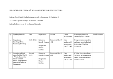 SPRAWOZDANIE Z DZIAŁAŃ W RAMACH ROKU JANUSZA KORCZAKA Szkoła .Zespół Szkół Ogólnokształcących nr2 w Sosnowcu, ul. Czeladzka 58 VI Liceum Ogólnokształcące im. Janusza Korczaka Szkoła Podstawowa nr 45 im. Janusza Korczaka Lp. Tytuł wydarzenia Data 1. 10.01.2012r. Katarzyna Reszel – Łagoń Organizacja Szkolnego Dnia Kuchni Żydowskiej. Organizator Małgorzata Marosz Kochan 2. Organizacja lekcji muzealnej dla klas IV – VI pt. „Sosnowiecmiasto czterech kultur” (współpraca z Pałacem Schoena w Sosnowcu). Styczeń 2012r. Katarzyna Reszel – Łagoń Małgorzata Marosz Kochan Adresat Liczba uczestników Przebieg wydarzenia, charakterystyka działań Uczniowie klas IV Cała - VI społeczność uczniowska klas IV - VI Przygotowanie wypieków według przepisów kuchni żydowskiej. Wspólna degustacja. Uczniowie klas IV Cała - VI społeczność uczniowska klas IV - VI Wykład historyka z Pałacu Szchoena w Sosnowcu na temat „Sosnowiec miasto czterech kultur”. Inne informacja 3. 4. Przygotowanie dla wychowawców konspektów lekcji o patronie szkoły na godziny wychowawcze Styczeń 2012r. Wraz z nauczycielami informatyki stworzenie zakładki na stronie internetowe SP 45 dotyczącej Janusza Korczaka. Luty 2012r. Katarzyna Reszel – Łagoń Wychowawcy klas IV - VI Cała społeczność uczniowska klas IV - VI Rodzice, uczniowie, sympatycy szkoły SP 45 ___________ Prezentacja życiorysu Janusza Korczaka, prezentacja zdjęć pt. „Kąciki korczakowskie”, opis i zdjęcia z Dnia Kuchni Żydowskiej, materiały multimedialne Przedstawiciele szkół 4 Małgorzata Marosz Kochan Katarzyna Reszel – Łagoń Małgorzata Marosz – Kochan Zbigniew Wiekiera Tematyka godzin dotyczyła przedstawienia Janusza Korczaka jako nauczyciela, wychowawcę pisarza, lekarza. Anna Szczepańczyk 5. Udział w Wojewódzkiej Konferencji „Kiedy śmieje się dziecko, śmieje się cały świat” – ku czci Starego Doktora pod honorowym Patronatem Rzecznika Praw Dziecka w ramach Czerwiec 2012r. Katarzyna Reszel – Łagoń Małgorzata Marosz Kochan Wysłuchanie prelekcji i części artystycznej obchodów Roku Janusza Korczaka w Katowicach. 7. 8. W sala lekcyjnych prezentacja kącika Patrona Szkoły (wszystkie klasy ZSO nr 2) Styczeń 2012r. Przygotowanie uczniów do ogólnopolskich konkursów związanych z twórczością Janusza Korczaka: Cały rok Katarzyna Reszel – Łagoń Cała społeczność ZSO nr 2 Cała społeczność uczniowska klas IV - VI Uczniowie ZSO nr 2 3 Małgorzata Marosz Kochan Katarzyna Reszel – Łagoń Małgorzata Marosz Kochan Gazetki ścienne wykonane przy pomocy różnych technik plastycznych 1. Ogólnopolski Konkurs plastyczny pod hasłem „Król Maciuś i inni”, realizowanym w ramach projektu Przystanek Korczak 2012 - Inga Górniak kl. Ic 2. Ogólnopolski Konkurs literacki – „Moje inspiracje twórczością Janusza Korczaka” (kategoria opowiadanie) – Milena Balcerek kl. VI a, Agnieszka Starczewska kl. VIa. 9. 10. W ramach pracy Młodzieżowego Koła TPD nr 12 przygotowanie Szkolnego Dnia Patrona dla VI LO 15 listopada 2012r. Udział opiekunów i uczniów reprezentujących VI LO i SP 45 w zjeździe szkół korczakowskich w Kielcach w dniach 17 – 18 września 2012. 17 – 18 września 2012. Anna Derej Małgorzata Marosz – Kochan Uczniowie klas I – Cała III LO społeczność uczniowska VILO Uczniowie klasy IIc Katarzyna Reszel – Łagoń Małgorzata Marosz Kochan Przedstawiciele ZSO nr 2 4 - uroczysty apel dla klas pierwszych liceum - organizacja szkolnego konkursu na najładniejszy plakat o Januszu Korczaku - organizacja szkolnego konkursu poetyckiego – wiersz o Januszu Korczaku - przeprowadzenie testu wiedzy o patronie szkoły dla klas pierwszych LO. - przeprowadzenie akcji charytatywnej wśród uczniów ZSO nr 2 „Wyprawka dla uczniaka”. Podczas pierwszego dnia pobytu w Kielcach młodzi uczestnicy i opiekunowie wzięli udział w warsztatach tematycznych. Nasze reprezentantki uczestniczyły w zajęciach plastycznych, podczas których należało stworzyć projekt medalu Janusza Korczaka. Medal w przyszłości byłby wręczany instytucjom pracującym na rzecz dzieci. Z wielu interesujących projektów wyróżniono cztery. Wśród nich znalazły się prace naszych uczennic Wiktorii Wytyczak, Ewy Siudak i Mai Skoczylas. Wieczorem 17 września w Auli Głównej Politechniki Świętokrzyskiej dzieci i młodzież z Młodzieżowego Domu Kultury z Kielc zaprezentowała uczestnikom zlotu część artystyczną wokalno – taneczną „Wspólny uśmiech – wspólna zabawa. 18 września zaraz po śniadaniu uczestnicy zlotu zwiedzili Kielce z przewodnikami. Byli na Wzgórzu Zamkowym, w Centrum Geoedukacji na wietrzni, bawili się w gry terenowe w mieście oraz zwiedzili Muzeum Zabawek i Zabawy. Atrakcją okazał się główny punkt programu – „Marsz Jedności szkół noszących imię Janusza Korczaka”. Kolorowa parada przeszła drogę od Muzeum Zabawek i Zabawy, przez ulicę Sienkiewicza, Planty aż do Świętokrzyskiego Urzędu Wojewódzkiego, w którym odbyło się spotkanie podsumowujące. 11. Organizacja Jesiennego Piątku Filmowego dla uczniów szkół ponadgimnazjalnych 9 listopada 2012r. Katarzyna Reszel – Łagoń Małgorzata Marosz – Młodzież szkół średnich z terenu Sosnowca 25 Uczniowie obejrzeli dwa filmy ( „Holocaust znaczy zagłada” – film dokumentalny i „Korczak” – film biograficzny w reż. A. z terenu Sosnowca Kochan Jarosław Sobaszek Wajdy) oraz wysłuchali wykładu na temat mieszkańców Sosnowca pochodzenia żydowskiego. Dzień Kuchni Żydowskiej