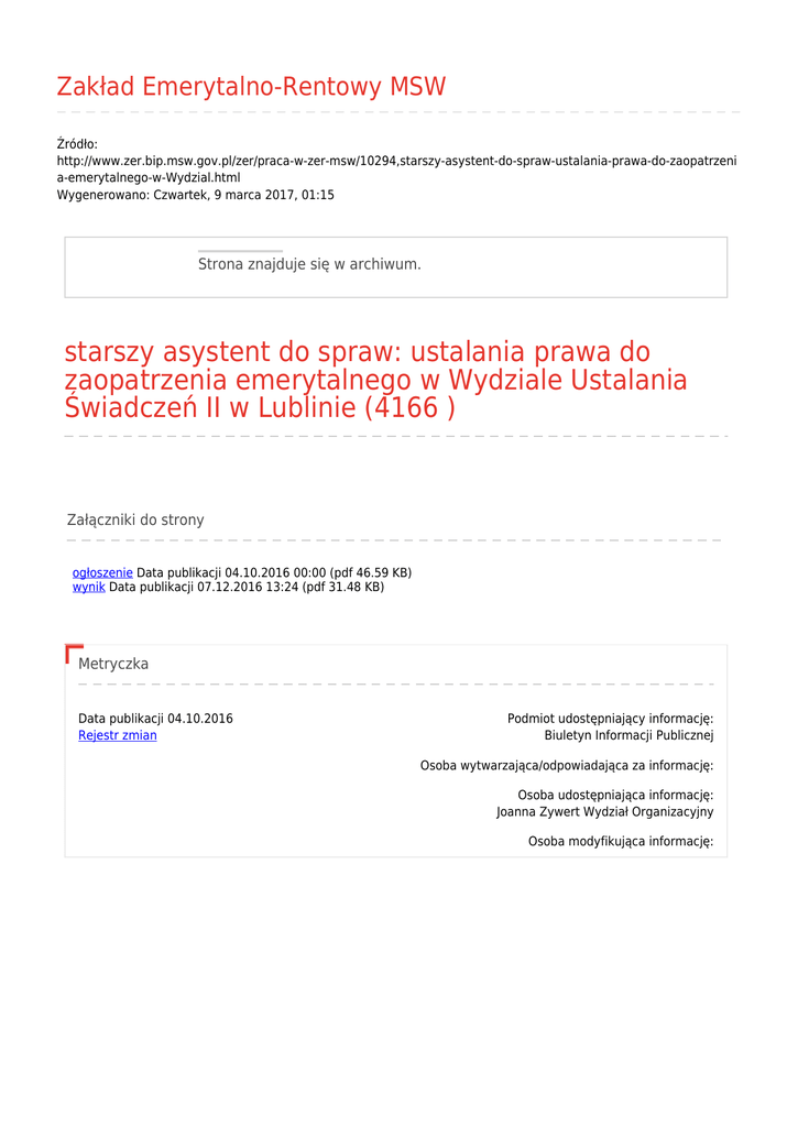 Zakład Emerytalno-Rentowy MSW Źródło: http://www.zer.bip.msw.gov.pl/zer/praca-w-zer-msw/10294,starszy-asystent-do-spraw-ustalania-prawa-do-zaopatrzeni a-emerytalnego-w-Wydzial.html Wygenerowano: Czwartek, 9 marca 2017, 01:15 Strona znajduje się w archiwum. starszy asystent do spraw: ustalania prawa do zaopatrzenia emerytalnego w Wydziale Ustalania Świadczeń II w Lublinie (4166 ) Załączniki do strony ogłoszenie Data publikacji 04.10.2016 00:00 (pdf 46.59 KB) wynik Data publikacji 07.12.2016 13:24 (pdf 31.48 KB) Metryczka Data publikacji 04.10.2016 Rejestr zmian Podmiot udostępniający informację: Biuletyn Informacji Publicznej Osoba wytwarzająca/odpowiadająca za informację: Osoba udostępniająca informację: Joanna Zywert Wydział Organizacyjny Osoba modyfikująca informację: