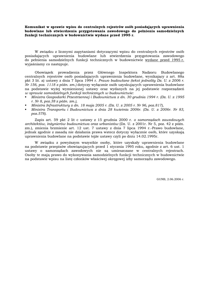 W związku z licznymi zapytaniami dotyczącymi wpisu do centralnych rejestrów osób posiadających uprawnienia budowlane lub stwierdzenia przygotowania zawodowego do pełnienia samodzielnych funkcji technicznych w budownictwie wydane przed 1995 r. wyjaśniamy co następuje. Obowiązek prowadzenia przez Głównego Inspektora Nadzoru Budowlanego centralnych rejestrów osób posiadających uprawnienia budowlane, wynikający z art. 88a pkt 3 lit. a) ustawy z dnia 7 lipca 1994 r. Prawo budowlane (tekst jednolity Dz. U. z 2006 r. Nr 156, poz. 1118 z późn. zm.) dotyczy wyłącznie osób uzyskujących uprawnienia budowlane na podstawie wyżej wymienionej ustawy oraz wydanych na jej podstawie rozporządzeń w sprawie samodzielnych funkcji technicznych w budownictwie: Ministra Gospodarki Przestrzennej i Budownictwa z dn. 30 grudnia 1994 r. (Dz. U. z 1995 r. Nr 8, poz.38 z późn. zm.), Ministra Infrastruktury z dn. 18 maja 2005 r. (Dz. U. z 2005 r. Nr 96, poz.817), Ministra Transportu i Budownictwa z dnia 28 kwietnia 2006r. (Dz. U. z 2006r. Nr 83, poz.578). Zapis art. 59 pkt 2 lit c ustawy z 15 grudnia 2000 r. o samorządach zawodowych architektów, inżynierów budownictwa oraz urbanistów (Dz. U. z 2001r. Nr 5, poz. 42 z późn. zm.), zmienia brzmienie art. 12 ust. 7 ustawy z dnia 7 lipca 1994 r.-Prawo budowlane, jednak zgodnie z zasadą nie działania prawa wstecz dotyczy wyłącznie osób, które uzyskają uprawnienia budowlane na podstawie tejże ustawy czyli po dniu 14.02.1995r. W związku z powyższym wszystkie osoby, które uzyskały uprawnienia budowlane na podstawie przepisów obowiązujących przed 1 stycznia 1995 roku, zgodnie z art. 6 ust. 1 ustawy o samorządach zawodowych nie są umieszczane w centralnych rejestrach. Osoby te mają prawo do wykonywania samodzielnych funkcji technicznych w budownictwie na podstawie wpisu na listę członków właściwej okręgowej izby samorządu zawodowego. GUNB, 2.06.2006 r.