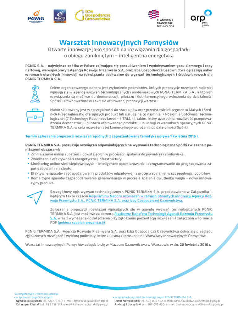 Warsztat Innowacyjnych Pomysłów Otwarte innowacje jako sposób na rozwiązania dla gospodarki o obiegu zamkniętym – inteligentna energetyka PGNiG S.A. - największa spółka w Polsce zajmująca się poszukiwaniem i wydobywaniem gazu ziemnego i ropy naftowej, we współpracy z Agencją Rozwoju Przemysłu S.A. oraz Izbą Gospodarczą Gazownictwa ogłaszają nabór w ramach otwartych innowacji na rozwiązania adekwatne do wyzwań technologicznych i środowiskowych dla PGNiG TERMIKA S.A. Celem organizowanego naboru jest wyłonienie podmiotów, których propozycje rozwiązań najlepiej wpisują się w agendę wyzwań technologicznych i środowiskowych PGNiG TERMIKA S.A., a których rozwiązania są możliwe do demonstracji, pilotażu i/lub komercyjnego wdrożenia do działalności Spółki i zrównoważone w zakresie oferowanej propozycji wartości. Nabór skierowany jest w szczególności do start-upów oraz przedstawicieli segmentu Małych i Średnich Przedsiębiorstw oferujących produkt lub usługę na co najmniej 7 Poziomie Gotowości Technologicznej (7 Technology Readiness Level – 7 TRL), tj. takim, który uzasadnia możliwość przeprowadzenia demonstracji i pilotażu oferowanego produktu lub usługi w warunkach operacyjnych PGNiG TERMIKA S.A. w celu rozważenia jej komercyjnego wdrożenia do działalności Spółki. Termin zgłaszania propozycji rozwiązań zgodnych z zaprezentowaną tematyką upływa 1 kwietnia 2016 r. PGNiG TERMIKA S.A. poszukuje rozwiązań odpowiadających na wyzwania technologiczne Spółki związane z poniższymi obszarami: • Zmniejszenie emisji substancji powstających w procesach spalania do powietrza i środowiska. • Zwiększenie efektywności energetycznej infrastruktury. • Monitoring online sieci ciepłowniczych – inteligentne opomiarowanie i oprogramowanie do prognozowania zapotrzebowania na ciepło. • Efektywne sposoby zagospodarowania produktów odpadowych z procesu spalania, w szczególności popiołów. • Komercyjne sposoby zagospodarowania generowanego w procesie spalania dwutlenku węgla – nowy innowacyjny produkt. Szczegółowy opis wyzwań technologicznych PGNiG TERMIKA S.A. przedstawiono w Załączniku 1, będącym także częścią Regulaminu Naboru rozwiązań w ramach otwartych innowacji Agencji Rozwoju Przemysłu S.A., PGNiG TERMIKA S.A. oraz Izby Gospodarczej Gazownictwa. Zgłaszanie propozycji rozwiązań wpisujących się w agendę wyzwań technologicznych PGNiG TERMIKA S.A. jest możliwe za pomocą Platformy Transferu Technologii Agencji Rozwoju Przemysłu S.A. wraz z wymaganą do załączenia przy zgłoszeniu prezentacją rozwiązania załączoną w formacie PDF (pobierz szablon prezentacji) PGNiG TERMIKA S.A., Agencja Rozwoju Przemysłu S.A. oraz Izba Gospodarcza Gazownictwa dokonają przeglądu zgłoszonych rozwiązań i wybiorą podmioty, które zostaną zaproszone na Warsztaty Innowacyjnych Pomysłów. Warsztat Innowacyjnych Pomysłów odbędzie się w Muzeum Gazownictwa w Warszawie w dn. 20 kwietnia 2016 r. Szczegółowych informacji udziela: w sprawach organizacyjnych Agnieszka Jakubiak tel.: 516 176 497, e-mail: [email protected] Katarzyna Cieślak tel.: 885 258 573, e-mail: [email protected] sprawach wyzwań technologicznych PGNiG TERMIKA S.A. w Rafał Nowakowski tel.: 508 005 482, e-mail: [email protected] Andrzej Rubczyński tel.: 508 005 400, e-mail: [email protected]
