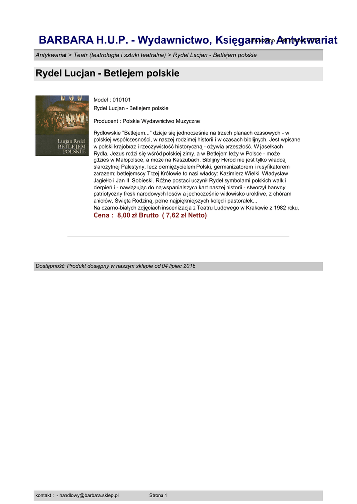 Utworzono Antykwariat : 09 marzec 2017 BARBARA H.U.P. - Wydawnictwo, Księgarnia, Antykwariat > Teatr (teatrologia i sztuki teatralne) > Rydel Lucjan - Betlejem polskie Rydel Lucjan - Betlejem polskie Model : 010101 Rydel Lucjan - Betlejem polskie Producent : Polskie Wydawnictwo Muzyczne Rydlowskie "Betlejem..." dzieje się jednocześnie na trzech planach czasowych - w polskiej współczesności, w naszej rodzimej historii i w czasach biblijnych. Jest wpisane w polski krajobraz i rzeczywistość historyczną - ożywia przeszłość. W jasełkach Rydla, Jezus rodzi się wśród polskiej zimy, a w Betlejem leży w Polsce - może gdzieś w Małopolsce, a może na Kaszubach. Biblijny Herod nie jest tylko władcą starożytnej Palestyny, lecz ciemiężycielem Polski, germanizatorem i rusyfikatorem zarazem; betlejemscy Trzej Królowie to nasi władcy: Kazimierz Wielki, Władysław Jagiełło i Jan III Sobieski. Różne postaci uczynił Rydel symbolami polskich walk i cierpień i - nawiązując do najwspanialszych kart naszej historii - stworzył barwny patriotyczny fresk narodowych losów a jednocześnie widowisko urokliwe, z chórami aniołów, Święta Rodziną, pełne najpiękniejszych kolęd i pastorałek... Na czarno-białych zdjęciach inscenizacja z Teatru Ludowego w Krakowie z 1982 roku. Cena : 8,00 zł Brutto ( 7,62 zł Netto) Dostępność: Produkt dostępny w naszym sklepie od 04 lipiec 2016 kontakt : - [email protected] Strona 1