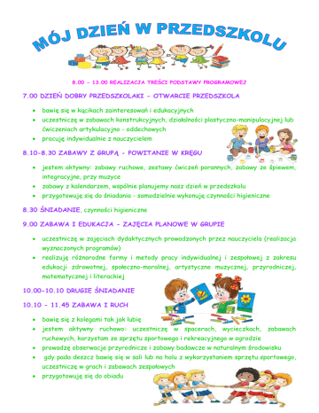 8.00 - 13.00 REALIZACJA TREŚCI PODSTAWY PROGRAMOWEJ 7.00 DZIEŃ DOBRY PRZEDSZKOLAKI - OTWARCIE PRZEDSZKOLA bawię się w kącikach zainteresowań i edukacyjnych uczestniczę w zabawach konstrukcyjnych, działalności plastyczno-manipulacyjnej lub ćwiczeniach artykulacyjno - oddechowych pracuję indywidualnie z nauczycielem 8.10-8.30 ZABAWY Z GRUPĄ - POWITANIE W KRĘGU jestem aktywny: zabawy ruchowe, zestawy ćwiczeń porannych, zabawy ze śpiewem, integracyjne, przy muzyce zabawy z kalendarzem, wspólnie planujemy nasz dzień w przedszkolu przygotowuję się do śniadania - samodzielnie wykonuję czynności higieniczne 8.30 ŚNIADANIE, czynności higieniczne 9.00 ZABAWA I EDUKACJA - ZAJĘCIA PLANOWE W GRUPIE uczestniczę w zajęciach dydaktycznych prowadzonych przez nauczyciela (realizacja wyznaczonych programów) realizuję różnorodne formy i metody pracy indywidualnej i zespołowej z zakresu edukacji zdrowotnej, społeczno-moralnej, artystyczne muzycznej, przyrodniczej, matematycznej i literackiej 10.00-10.10 DRUGIE ŚNIADANIE 10.10 - 11.45 ZABAWA I RUCH bawię się z kolegami tak jak lubię jestem aktywny ruchowo: uczestniczę w spacerach, wycieczkach, zabawach ruchowych, korzystam ze sprzętu sportowego i rekreacyjnego w ogrodzie prowadzę obserwacje przyrodnicze i zabawy badawcze w naturalnym środowisku gdy pada deszcz bawię się w sali lub na holu z wykorzystaniem sprzętu sportowego, uczestniczę w grach i zabawach zespołowych przygotowuję się do obiadu 12.00 OBIAD, czynności higieniczne 12.30 RELAKS słucham bajek i opowiadań dziecięcych w interpretacji nauczyciela słucham nagrań płytowych i słuchowisk lub muzyki relaksacyjnej uczestniczę w zajęciach dodatkowych bawię się według swoich zainteresowań 14.30 PODWIECZOREK 15.00 AKTYWNE POPOŁUDNIE podejmuję aktywność własną - organizuję zabawy indywidualne z kolegami z nauczycielką podejmuję zabawy tematyczne, badawcze, ruchowe ze śpiewem, taneczne bawię się tekstem literackim , prezentuję własne interpretacje utworu podczas zabaw dramowych, pantomimicznych słucham czytanych przez nauczyciela książek, oglądam i poznaję książki oraz czasopisma uczestniczę w zajęciach dodatkowych pracuję indywidualnie z nauczycielem uczę się czynności porządkowych w sali oraz kącikach zainteresowań i edukacyjnych dokonuje podsumowania dnia i planuję działania na następny żegnam się z nauczycielką wychodząc do domu 17.00 ZAMYKAMY PRZEDSZKOLE - DO ZOBACZENIA