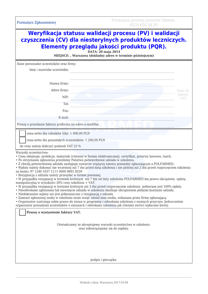 Formularz prosimy przesłać faksem: (022) 654 54 20 Formularz Zgłoszeniowy Weryfikacja statusu walidacji procesu (PV) i walidacji czyszczenia (CV) dla niesterylnych produktów leczniczych. Elementy przeglądu jakości produktu (PQR). DATA: 20 maja 2014 MIEJSCE: , Warszawa (dokładny adres w terminie późniejszym) Dane personalne uczestników oraz firmy: Imię i nazwisko uczestnika: Nazwa firmy: Adres firmy: Dane do faktury VAT NIP: Tel: Fax: E-mail: Proszę o przesłanie faktury proforma na adres e-mail/fax: cena netto dla członków Izby: 1 000,00 PLN cena netto dla pozostałych uczestników: 1 200,00 PLN do ceny należy doliczyć podatek VAT 23 % Warunki uczestnictwa: • Cena obejmuje: prelekcje, materiały (również w formie elektronicznej), certyfikat, przerwy kawowe, lunch. • Po otrzymaniu zgłoszenia prześlemy Państwu potwierdzenie udziału w szkoleniu. • Z chwilą potwierdzenia udziału następuje zawarcie wiążącej umowy pomiędzy zgłaszającym a POLFARMED. • Wpłaty należy dokonać nie wcześniej niż 7 dni przed datą szkolenia i nie później niż 2 dni przed rozpoczęciem szkolenia na konto: 97 1240 1037 1111 0000 0691 8529 • Rezygnację z udziału należy przesyłać w formie pisemnej. • W przypadku rezygnacji w terminie krótszym niż 7 dni od daty szkolenia POLFARMED ma prawo obciążenia opłatą manipulacyjną w wysokości 30% ceny szkolenia + VAT. • W przypadku rezygnacji w terminie krótszym niż 3 dni przed rozpoczęciem szkolenia pobierane jest 100% opłaty. • Nieodwołanie zgłoszenia lub niewzięcie udziału w szkoleniu skutkuje obciążeniem pełnymi kosztami udziału. • Niedokonanie wpłaty nie jest jednoznaczne z rezygnacją z udziału. • Zamiast zgłoszonej osoby w szkoleniu może wziąć udział inna osoba, wskazana przez firmę zgłaszającą. • Organizator zastrzega sobie prawo do zmian w programie i odwołania szkolenia z ważnych przyczyn. Jednocześnie organizator powiadomi uczestników o zmianach i odwołaniu szkolenia jak również zwróci wpłacone kwoty. Proszę o wystawienie faktury VAT. Oświadczamy że akceptujemy warunki uczestnictwa w szkoleniu oraz zobowiązujemy się do zapłaty. podpis i pieczątka Wydruk z dnia: Warszawa 2017-03-09 POLFARMED [email protected] www.polfarmed.pl Wydruk z dnia: Warszawa 2017-03-09