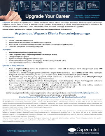 Capgemini jest jednym z największych na świecie dostawców usług z zakresu konsultingu, technologii informatycznych i outsourcingu. Capgemini posiada ponad 300 biur w 40 krajach i jest największą firmą doradczą w Europie. Capgemini Infrastructure Services to trzy lokalizacje w Krakowie, Katowicach i Opolu. Zatrudniamy ponad 2000 osób, obsługując 40 klientów w 20 językach. Obecnie do biur w Katowicach, Krakowie oraz Opolu poszukujemy kandydatów na stanowisko: Asystent ds. Wsparcia Klienta Francuskojęzycznego Opis stanowiska Kontakt z klientami zagranicznymi Rejestrowanie oraz klasyfikowanie nadchodzących zgłoszeń Analizowanie oraz rozwiazywanie problemów związanych z codzienną obsługą komputera Określanie priorytetów nadchodzących zgłoszeń Wymagania Bardzo dobra znajomość języka francuskiego Dobra znajomość języka angielskiego będzie dodatkowym atutem Umiejętność pracy w grupie Wysoko rozwinięte umiejętności komunikacyjne Podstawowa znajomość systemu operacyjnego Windows oraz pakietu MS Office Mile widziane doświadczenie w obsłudze klienta Sprawdź, co mamy dla Ciebie: Praca w międzynarodowej firmie dla prestiżowych klientów - około 100 światowych marek obsługiwanych przez 6000 profesjonalistów w 30 językach Jasno określona ścieżka kariery (ekspercka lub liderska) i bogata oferta szkoleniowa - ponad 20 000 szkoleń online oraz książek dostępnych dla Ciebie także z domu, szeroki wybór szkoleń w klasie, dofinansowanie do nauki języków obcych. Od ekspertów Capgemini nauczysz się najlepszych praktyk oraz biznesu na światowym poziomie. Ponad 900 certyfikowanych ekspertów z zakresu m.in. ITIL, Vmware, Citrix, Oracle Database Będziesz pracować w inspirującej atmosferze. Razem pracujemy i razem świętujemy – Projekt Teatr Capgemini, wolontariat pracowniczy, wydarzenia integracyjne, wspólne granie w kosza, siatkę – każdy znajdzie coś dla siebie! Poza wynagrodzeniem otrzymasz pakiet dodatków pozapłacowych (opieka medyczna dla całej rodziny, dodatkowe ubezpieczenie). Możesz polecać znajomych w Programie Referencyjnym i zgarniać nagrody! Nasze biura mają dogodną lokalizację z certyfikatem „Przyjazny rowerom”! Zainteresowanych kandydatów prosimy o aplikowanie online lub wysyłanie CV na adres [email protected]. Prosimy o zawarcie numeru referencyjnego w tytule wiadomości (źródło)/CSA/French/KTW, (źródło)/CSA/French/OP lub (źródło)/CSA/French/KRK Informujemy, że administratorem danych osobowych podanych w zgłoszeniach rekrutacyjnych jest Capgemini Polska Sp. z o.o. z siedzibą w Warszawie przy al. Jerozolimskich 96. Pana/Pani dane osobowe będą przetwarzane zgodnie z ustawą z dnia 29 sierpnia 1997r. o ochronie danych osobowych (t.j. Dz. U. 2002, Nr 101, poz. 926 ze zm.) na potrzeby realizacji procesów rekrutacji prowadzonych obecnie i w przyszłości. Informujemy, że w ramach procesu rekrutacji dane osobowe będą również przetwarzane poza Europejskim Obszarem Gospodarczym, w tym jednostki Capgemini w Indiach.Przetwarzanie danych może zawierać również nagrania głosowe. Podanie danych jest dobrowolne. Każda osoba ma prawo dostępu do treści swoich danych ich poprawiania. Prosimy o dopisanie następującej klauzuli: „Wyrażam zgodę na przetwarzanie przez Capgemini Polska Sp. z o.o. danych osobowych zawartych w mojej ofercie pracy na potrzeby procesów rekrutacji prowadzonych obecnie i w przyszłości zgodnie z przepisami ustawy z dnia 29 sierpnia 1997r. o ochronie danych osobowych (Dz. U. 2002, Nr 101, poz. 926 ze zm.) Zezwalam również Capgemini Polska Sp z o.o. na przetwarzanie moich danych osobowych poza Europejskim Obszarem Gospodarczym, w tym przez jednostki w Indiach oraz klientów Capgemini obejmujących wewnętrzne oraz zewnętrzne obszary EEA”. Wszystkim zainteresowanym zapewniamy dyskrecję. Zastrzegamy sobie prawo do odpowiedzi tylko na wybrane aplikacje. Proces rekrutacji prowadzony jest zgodnie z zasadami równego traktowania w zatrudnieniu, Kodeks Pracy, Rozdział IIa, art. 183a – 183e. Employment Agencies Register – 9595