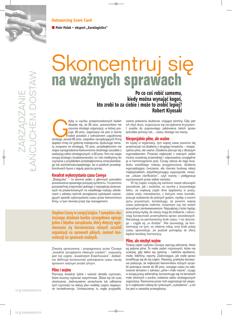 Outsourcing Score Card ZARZÑDZANIE ŁA¡CUCHEM DOSTAW Piotr Polak • ekspert „Eurologistics” Skoncentruj si´ na wa˝nych sprawach G Po co coÊ robiç samemu, kiedy mo˝na wynajàç kogoÊ, kto zrobi to za ciebie i mo˝e to zrobiç lepiej? Robert Kiyosaki dyby w wyniku przeprowadzonych badaƒ okazało si´, ˝e 95 proc. pracowników nie rozumie strategii organizacji, w której pracuje, 90 proc. organizacji nie jest w stanie sobie poradziç z wdro˝eniem uzgodnionej strategii, ponad 85 proc. zespołów zarzàdzajàcych firmà sp´dza mniej ni˝ godzin´ miesi´cznie, dyskutujàc tematy zwiàzane ze strategià, 70 proc. przedsi´biorstw nie wià˝e wynagrodzenia kierownictwa Êredniego szczebla z realizacjà celów strategicznych, a 60 proc. firm nie wià˝e swojej strategii z bud˝etowaniem, to i tak mielibyÊmy do czynienia z przykładem przedsi´biorstwa amerykaƒskiego lub zachodnioeuropejskiego, bo w polskich przedsi´biorstwach bywa z reguły jeszcze gorzej. Kwadrat wykorzystania czasu Coveya „Bie˝àczka” – to pewnie jeden z głównych powodów powstawania opisanego powy˝ej syndromu. I to pomimo powszechnej znajomoÊci jednego z najcz´Êciej stosowanych na prezentowanych na wszelkiego rodzaju szkoleniach z zakresu technik zarzàdzania wykresach oceniajàcych sposób wykorzystania czasu przez kierownictwo firmy, w tym równie˝ przez top management. Stephen Covey w swojej ksià˝ce 7 nawyków skutecznego działania bardzo szczegółowo opisuje jeden z bł´dów zarzàdzania, który dotyczy ogniskowania si´ kierownictwa ró˝nych szczebli organizacji na sprawach pilnych, zamiast koncentracji na sprawach wa˝nych. Zresztà opracowany i propagowany przez Coveya „kwadrat zarzàdzania własnym czasem”, nazywany jest te˝ cz´sto „kwadratem Eisenhowera”, dokładnie definiuje koniecznoÊç poÊwi´cania czasu raczej sprawom wa˝nym ani˝eli pilnym. Pilne i wa˝ne 52 | EUROLOGISTICS 52 | EUROLOGISTICS Pierwszy kwadrat (pilne i wa˝ne) okreÊla czynnoÊci, które musimy wykonaç natychmiast. Zbli˝a si´ ich czas ukoƒczenia. JednoczeÊnie zaniechanie lub odło˝enie tych czynnoÊci na dalszy plan miałoby cz´sto negatywne konsekwencje. Umieszczamy tu nagłe przypadki, wa˝ne polecenia słu˝bowe, mijajàce terminy. Gdy jest ich zbyt du˝o, rozpoczyna si´ zarzàdzanie kryzysem. I zwykle do poprawnego załatwienia takich spraw potrzeba pomocy lub… czasu, którego nie mamy. Niespecjalnie pilne, ale wa˝ne Im wy˝ej w organizacji, tym wi´cej czasu powinno si´ przeznaczaç na działania z drugiego kwadratu – niespecjalnie pilne, ale wa˝ne. Działania planuje si´ z dłu˝szym wyprzedzeniem. Przecie˝ wi´kszoÊç z wa˝nych zadaƒ mo˝na wczeÊniej przewidzieç i odpowiednia uwzgl´dniç je w harmonogramie prac. Covey zalicza do tego kwadratu wszelkiego rodzaju przygotowania, działania wyprzedzajàce, çwiczenia, ale równie˝ budow´ relacji mi´dzyludzkich, satysfakcjonujàcy wypoczynek, wreszcie „values clarification”, czyli rozwój i piel´gnacja wyznawanych przez siebie wartoÊci. W tej cz´Êci znajdà si´ zarówno nasze obowiàzki zawodowe, jak i osobiste, co wynika z oczywistego faktu, ˝e wi´kszà cz´Êç dnia sp´dzamy w pracy. Jak˝e wielu mened˝erów, z którymi mam kontakt, pracuje codziennie do póênych godzin, myÊlàc o swoim ˝yciu prywatnym, kontestujàc, ˝e powinni wi´cej czasu poÊwi´caç rodzinie, znajomym czy te˝ swoim prywatnym zainteresowaniom. Najcz´Êciej z kolei b´dàc poza pracà myÊlà, ile rzeczy majà do zrobienia, i odczuwajà koniecznoÊç przemyÊlenia spraw zawodowych. Narzekajà na permanentny brak czasu. I nic dziwnego – ciàgle sà „w drodze”. Nie zauwa˝ajà, ˝e koncentracja na tym, co właÊnie robià, oraz brak presji czasu spowoduje, ˝e podział pomi´dzy te sfery b´dzie bardziej harmonijny. Pilne, ale niezbyt wa˝ne Trzecià cz´Êç wykresu Coveya zajmujà zdarzenia, które sà jedynie pilne. To wiele zadaƒ rutynowych, które nie ucierpià, gdy lekko si´ opóênià – niektóre spotkania, maile, telefony, raporty. Zadziwiajàce, jak wiele spraw kwalifikuje si´ do tej cz´Êci. Niestety, praktyka biznesowa pokazuje, ˝e wi´kszoÊç kierowników ró˝nych szczebli poÊwi´ca nawet do 90 proc. swojego czasu na załatwianie tematów z zakresu „pilne i mało wa˝ne”, czujàc w swojej pracy adrenalin´, koncentrujàc si´ na tematach mało istotnych z punktu widzenia celów strategicznych organizacji. Kierowane przez nich organizacje lub zespoły w wi´kszoÊci nale˝à do rynkowych „outsiderów”, a ich los jest w zasadzie przesàdzony. Sami zaÊ pracownicy, poÊwi´cajàcy tak wiele czasu na zadania z trzeciego kwadratu, sà cz´sto przykładem „ofiar losu”: pracujàc po 12 godzin dziennie, majàc wra˝enie, ˝e sà niezb´dni, a bez ich pracy organizacja by upadła, nagle dostajà wypowiedzenie i cały Êwiat si´ dla nich koƒczy. Tak samo jak i w drugim kwadracie zapominajà oni, ˝e w czasie wolnym od pracy zaplanowany odpoczynek lub rozmowa jest wa˝niejsza od wielu goràczek dnia codziennego. ˚eby osiàgnàç post´py w pracy oraz efektywnie wykorzystywaç swój czas, wa˝ne jest, by podjàç starania słu˝àce redukowaniu tej cz´Êci wykresu. centrowanie si´ jedynie na wskaênikach finansowych. Z jednej strony istnieje ogromna presja ze strony rynku, udziałowców i przeło˝onych na nieustanne poprawianie wyniku finansowego, ale z drugiej nale˝y zdaç sobie spraw´ z faktu, ˝e koncentracja tylko na stronie finansowej mo˝e spowodowaç zaniechanie inwestycji w takie obszary, jak podnoszenie kwalifikacji personelu oraz poziom satysfakcji klientów ze współpracy z naszà firmà. si´ nimi zajmujemy? Otó˝ cz´sto uciekamy w ten obszar, opóêniajàc realizacj´ zadaƒ dla nas niewygodnych, równolegle budujàc sobie alibi, dlaczego si´ tymi trudnymi tematami nie zajmujemy. Z kolei zapisanie i przeanalizowanie tych tematów pozwoli nam takie działania pozorne wykryç i 